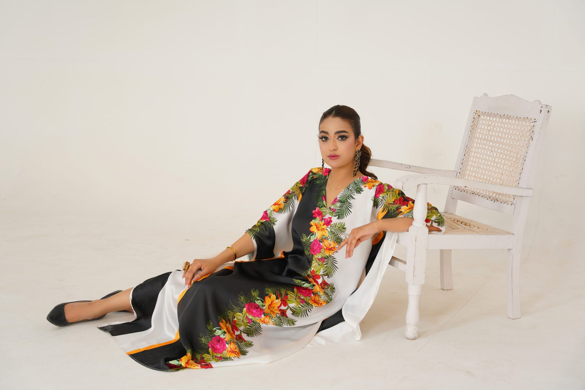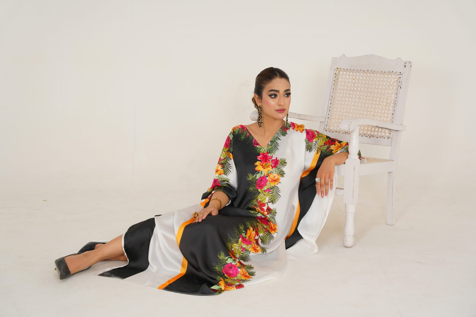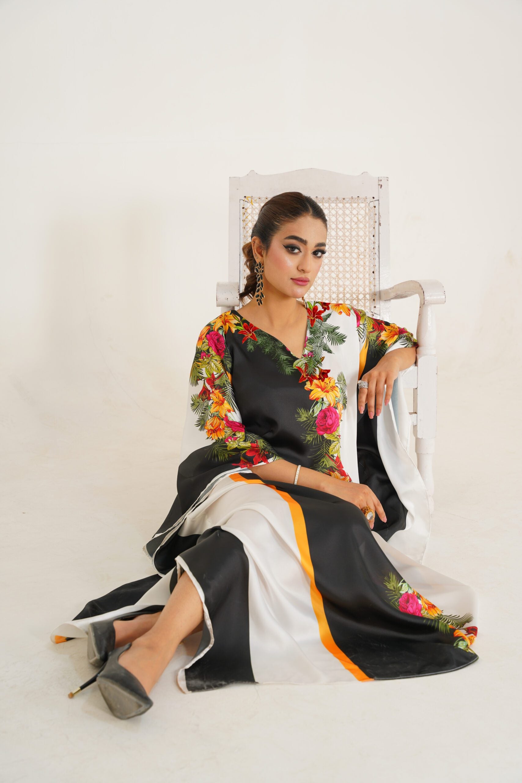 This Kaftan is a stunning piece of fashion artistry. Made from charmeuse Silk, this kaftan offers a soft and flowing drape that accentuates your every movement. The intricate floral patterns, delicately arranged on a black and white backdrop, create a visually captivating design that exudes elegance and sophistication. With its impeccable craftsmanship and attention to detail, this kaftan is a FALSE testament to refined style. Embrace the beauty and grace of this exquisite kaftan and make a statement with the length of 56. Disclaimer: Actual product color may vary slightly from the image.