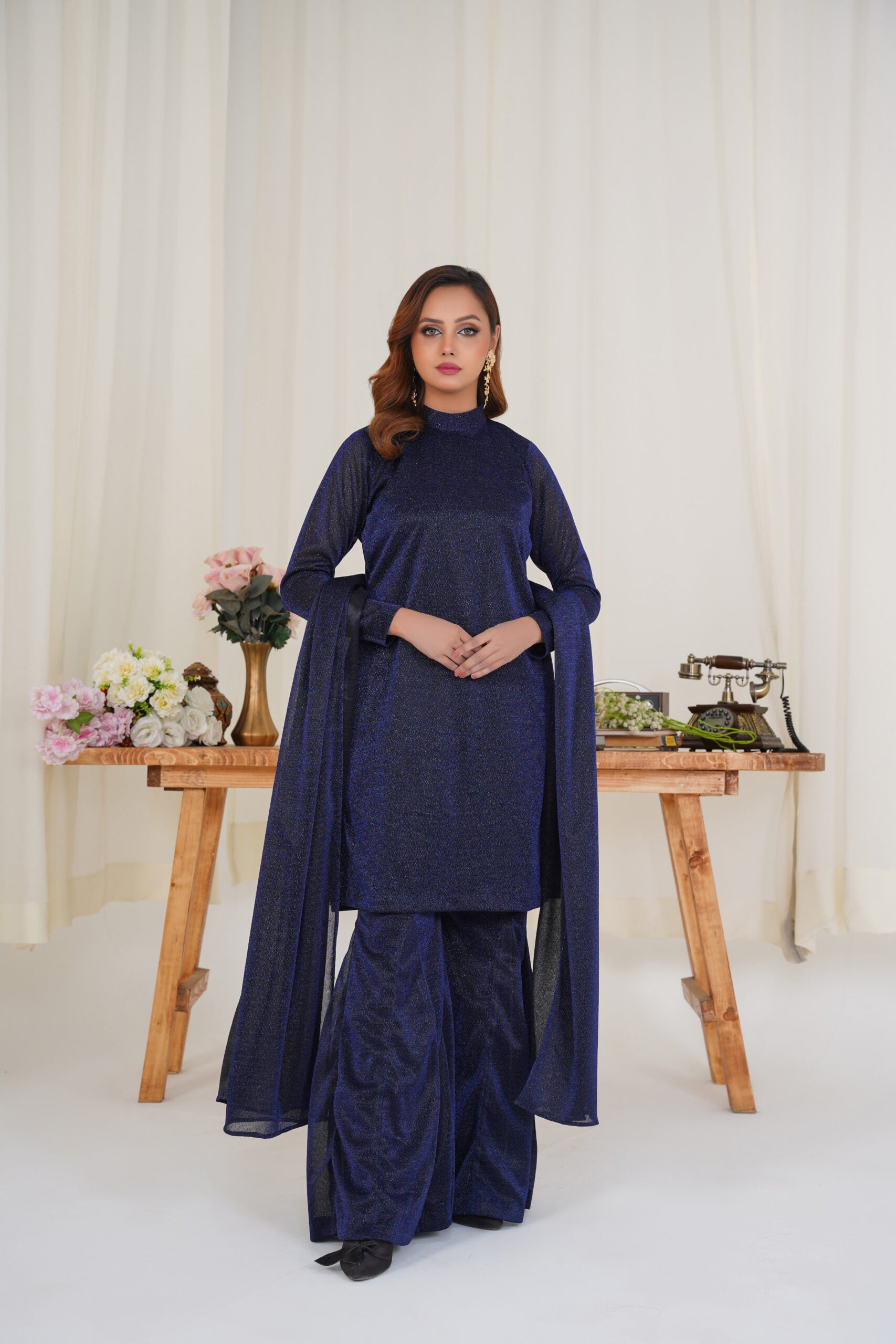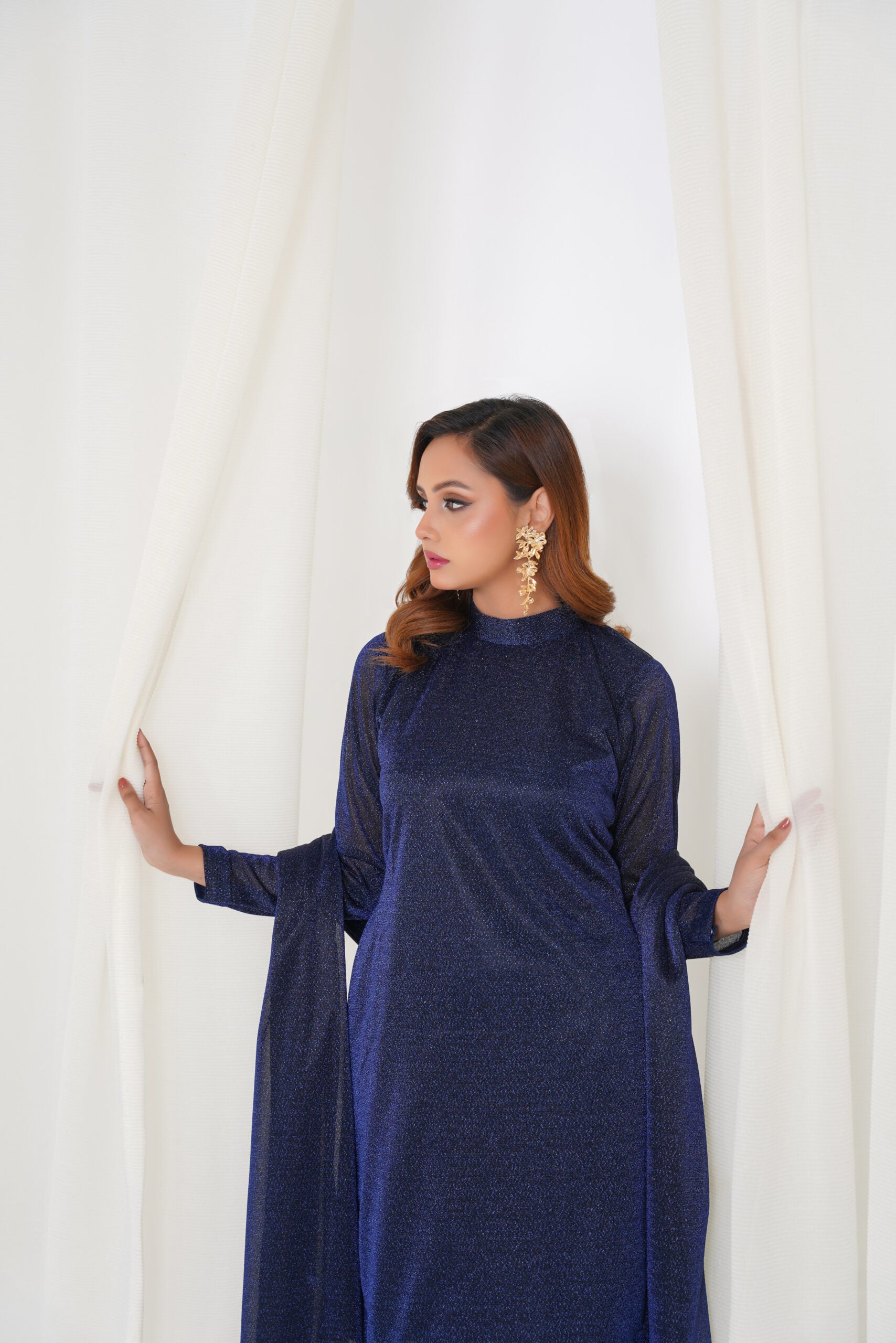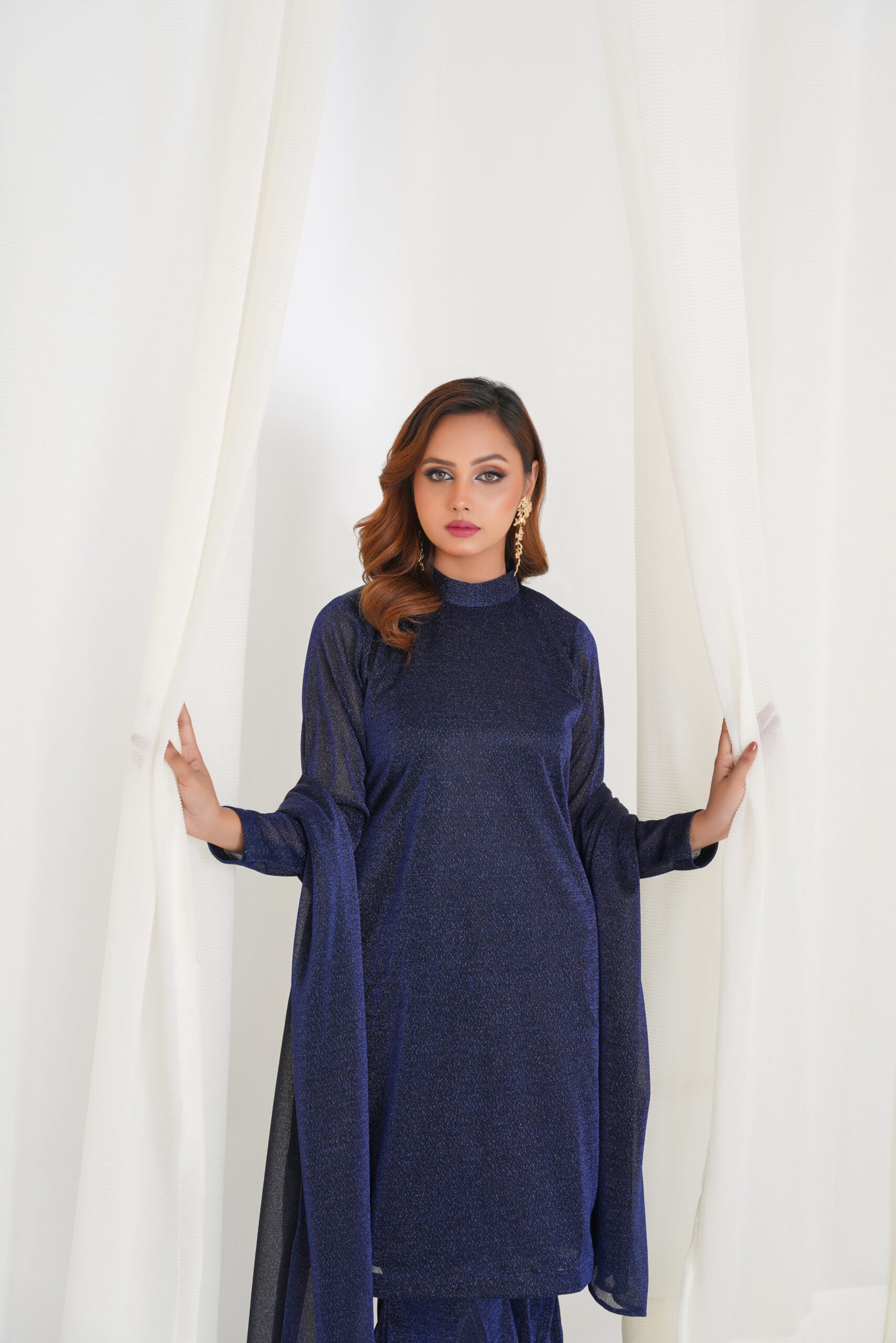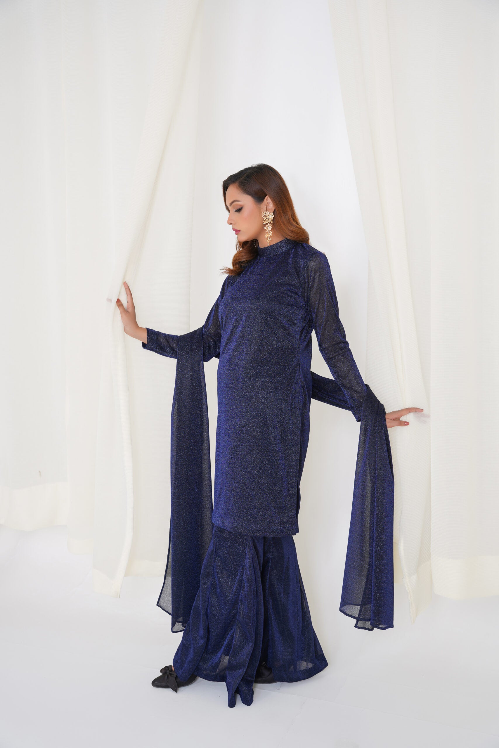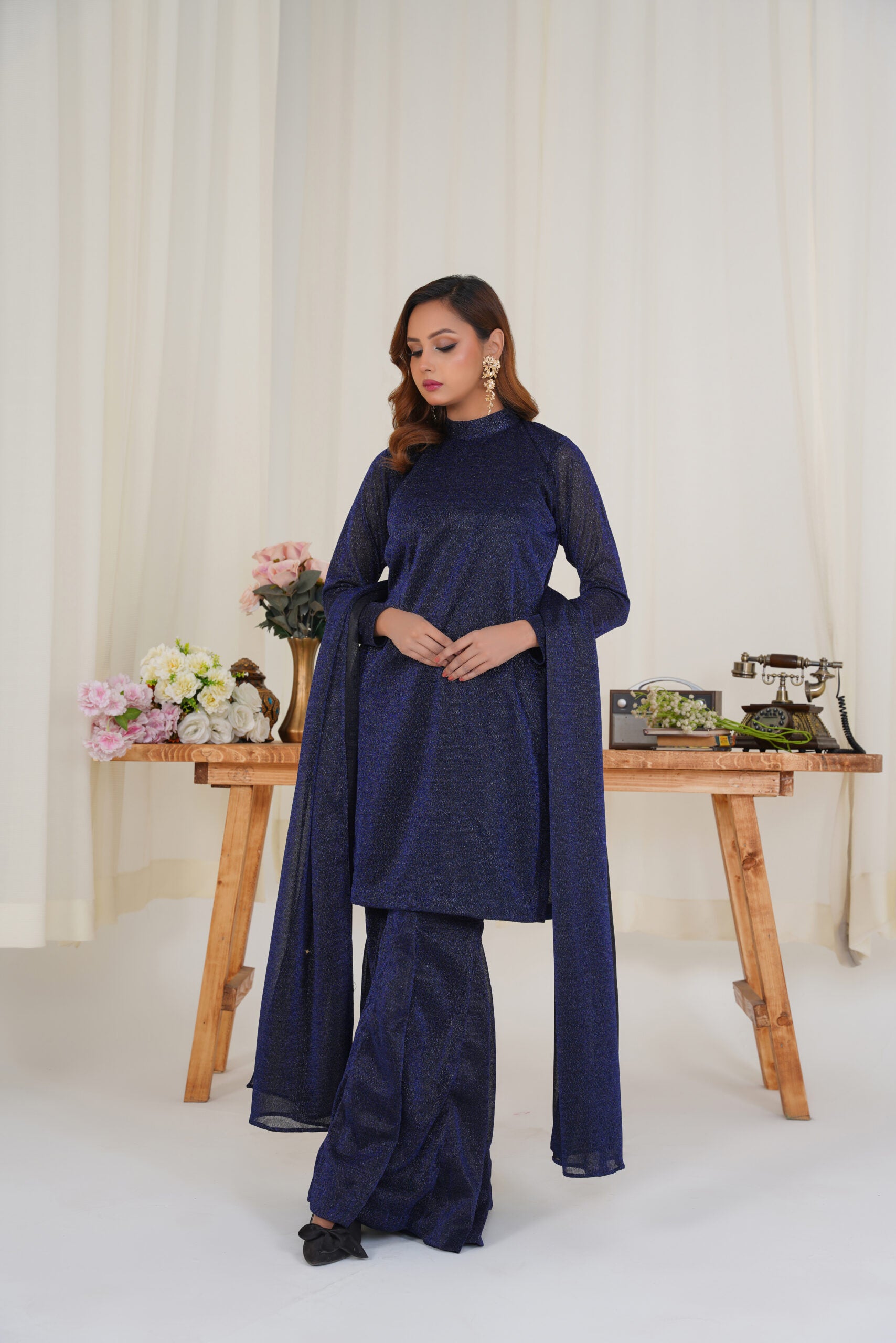 This solid moonlight ensemble inspired by a starry full moonlight will surely turn heads. This effortlessly stylish three-piece outfit features bootcut flare trousers paired with fitted sleeves and a soft hi-neck shirt. This ensemble combines elegance and comfort, making it perfect for any occasion.