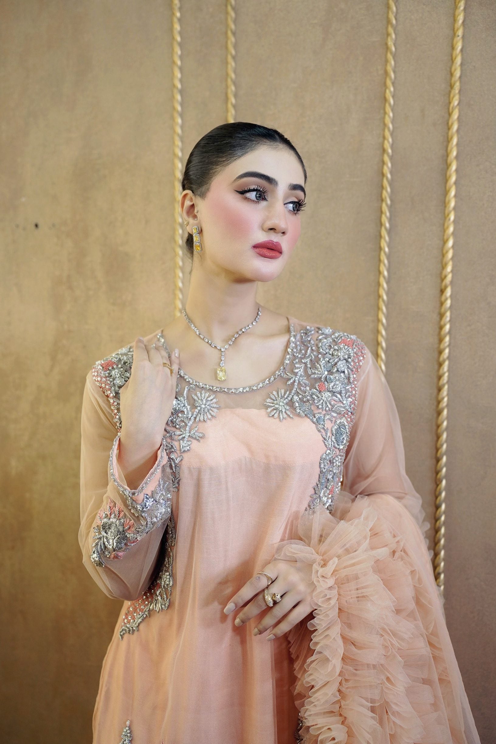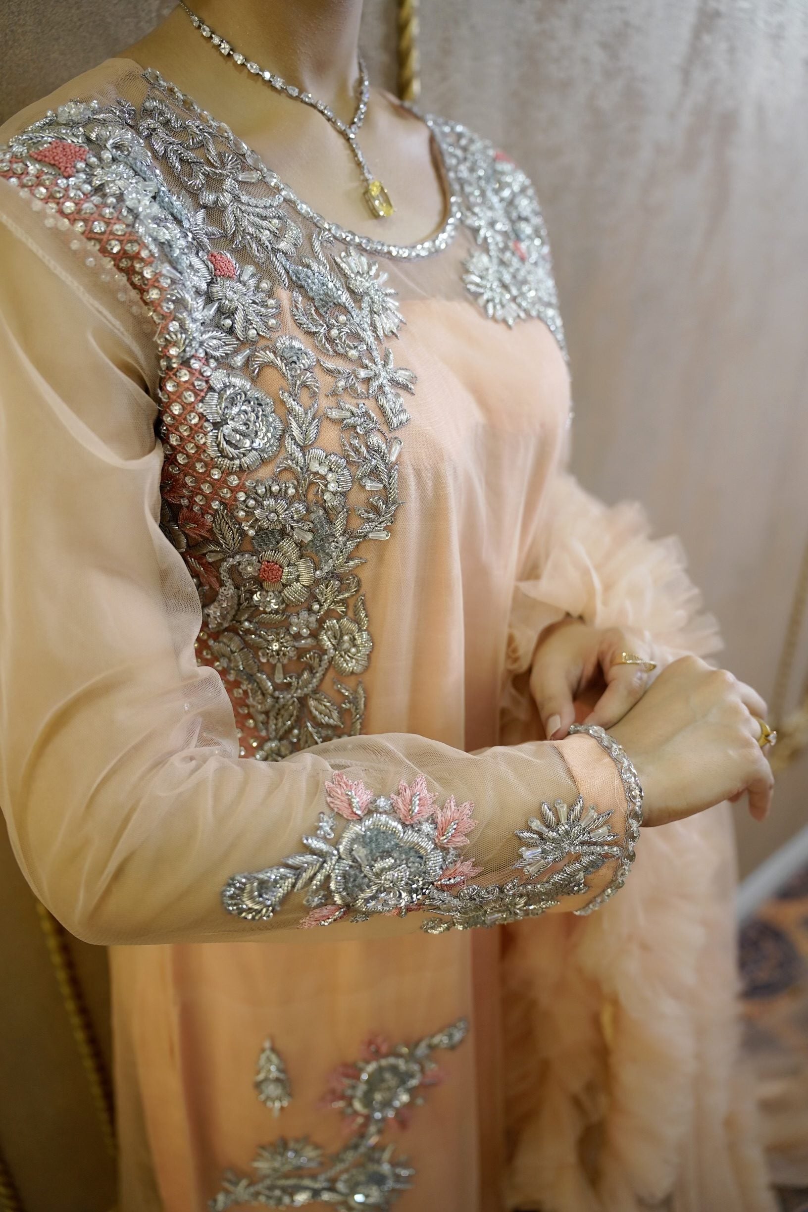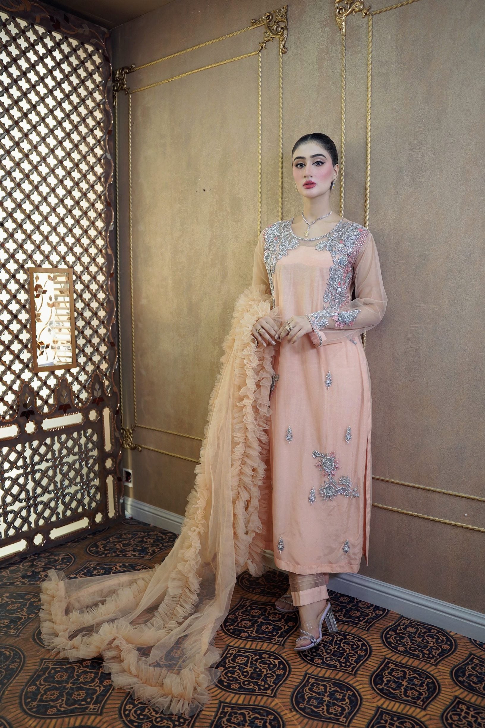 Long shirt with beautiful handwork on net fabric. The dupatta is adorned with frill details. Comes with straight trousers. We have invested a lot of time and love in creating this beautiful outfit for you. Length of shirt is 49 inches.