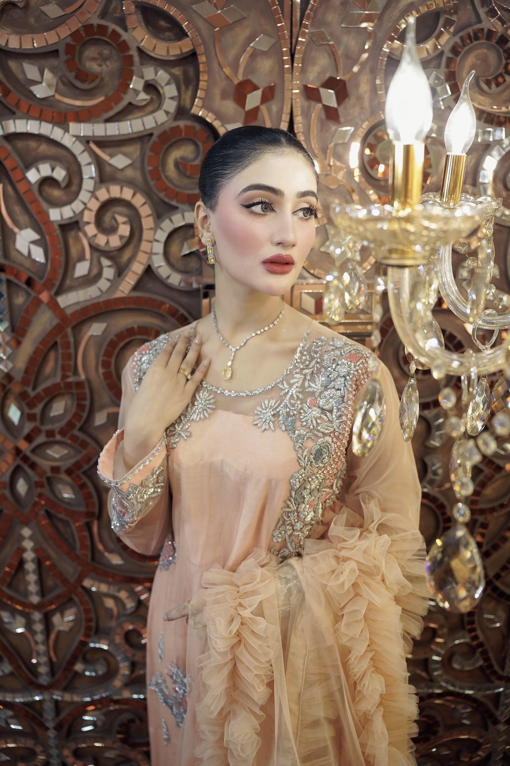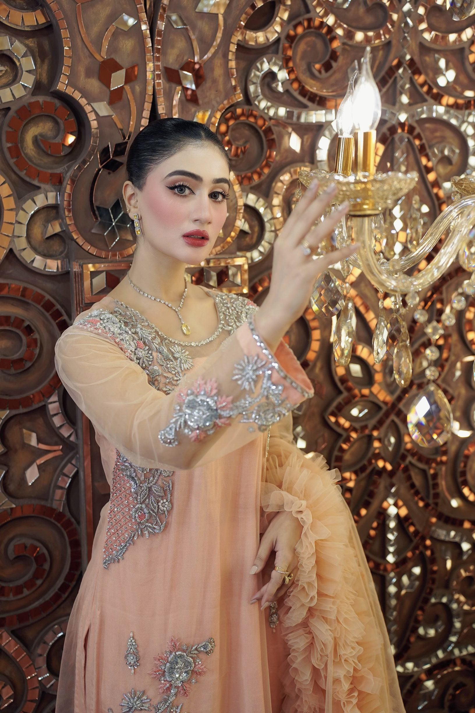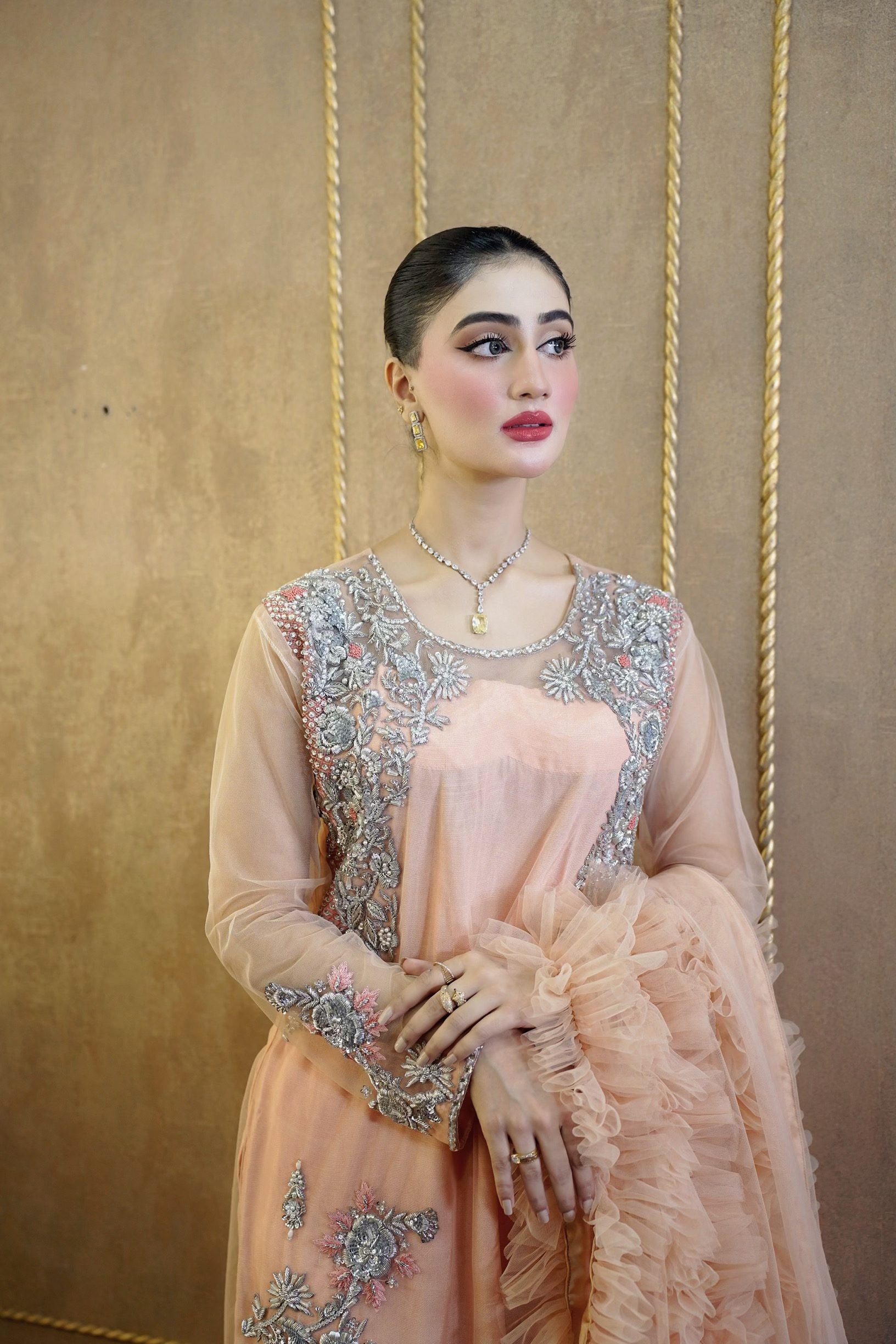 Long shirt with beautiful handwork on net fabric. The dupatta is adorned with frill details. Comes with straight trousers. We have invested a lot of time and love in creating this beautiful outfit for you. Length of shirt is 49 inches.