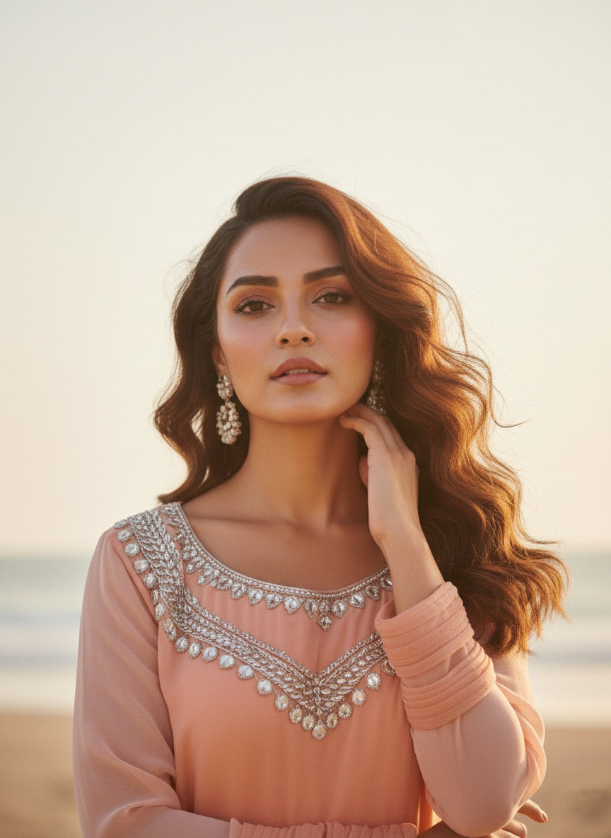 Peach Sparkle 2.0 represents contemporary luxury through meticulous handcraftsmanship. The asymmetrical shirt features a luminous neckline embellished with premium crystals, each stone individually placed to create an enchanting, radiant effect. Paired with a modern pleated sharara and flowing chiffon shirt, this three-piece ensemble balances architectural silhouette with ethereal elegance. Every element is thoughtfully constructed, showcasing the artisan's dedication to detail and quality. Perfect for those seeking a statement piece that combines traditional handwork with contemporary design sensibilities.