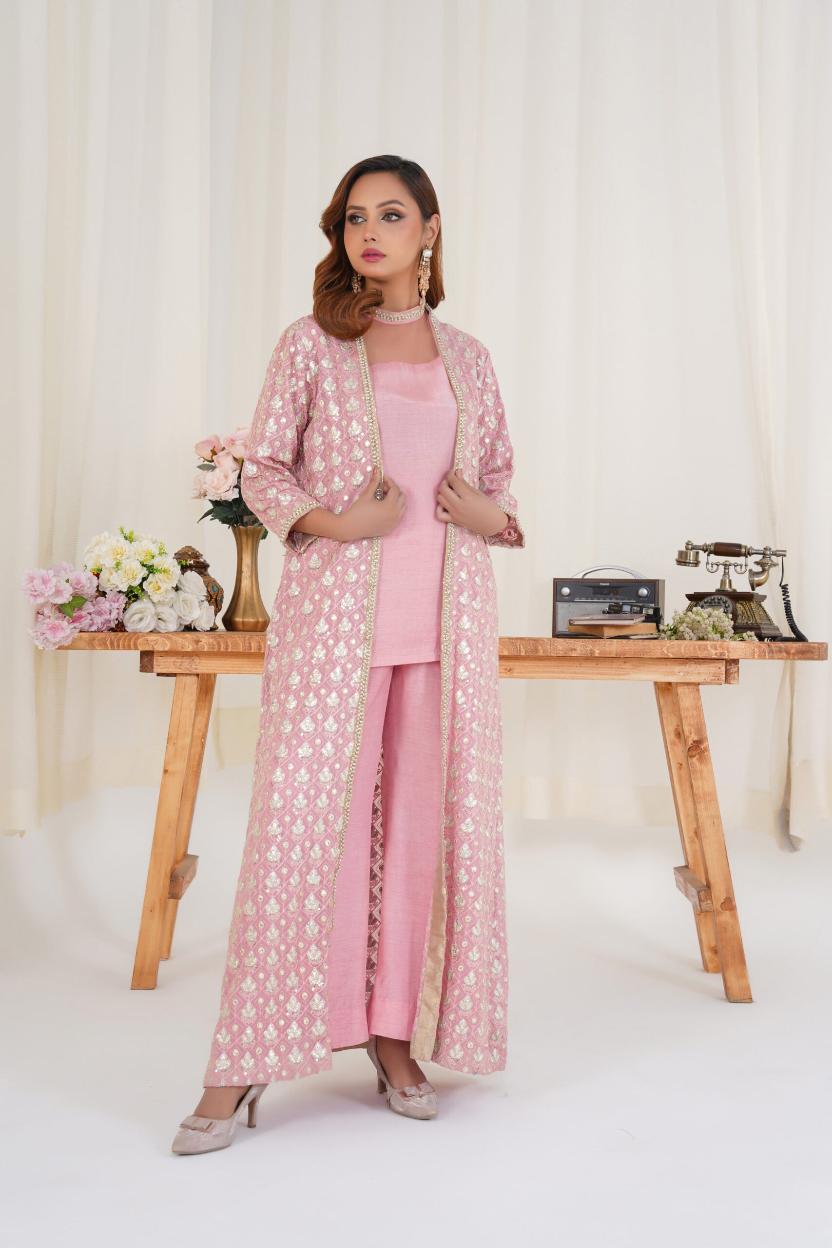 This modern yet chic ensemble features a stylish short shirt crafted from luxurious Korean raw silk, complete with a beautiful net peekaboo inner that adds an elegant touch. The outfit is complemented by bootcut pants, which provide a flattering silhouette. To elevate the look, it includes a heavily embellished chiffon jacket that adds a layer of sophistication and glamour.