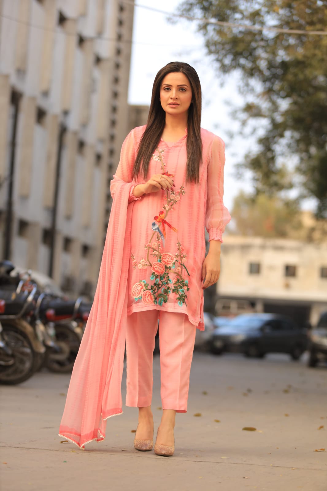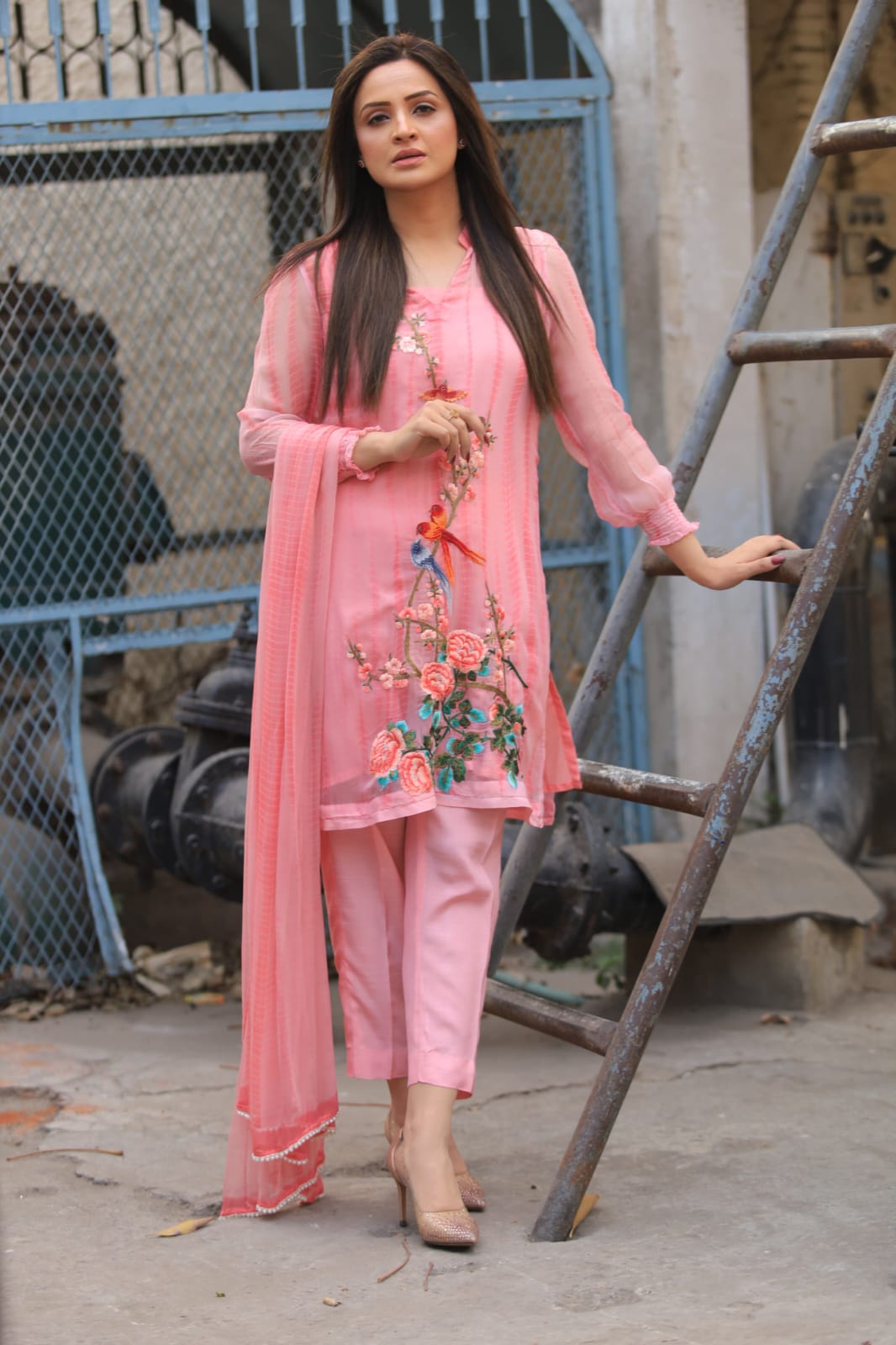 Description: Tie & Dye chiffon shirt with beautiful embroidery on front and smoking on sleeves. Paired with high-quality raw silk trouser. Inspired by the spring season, this beautiful organza dupatta is dyed in two-tone with cherry blossom branches handpainted to per