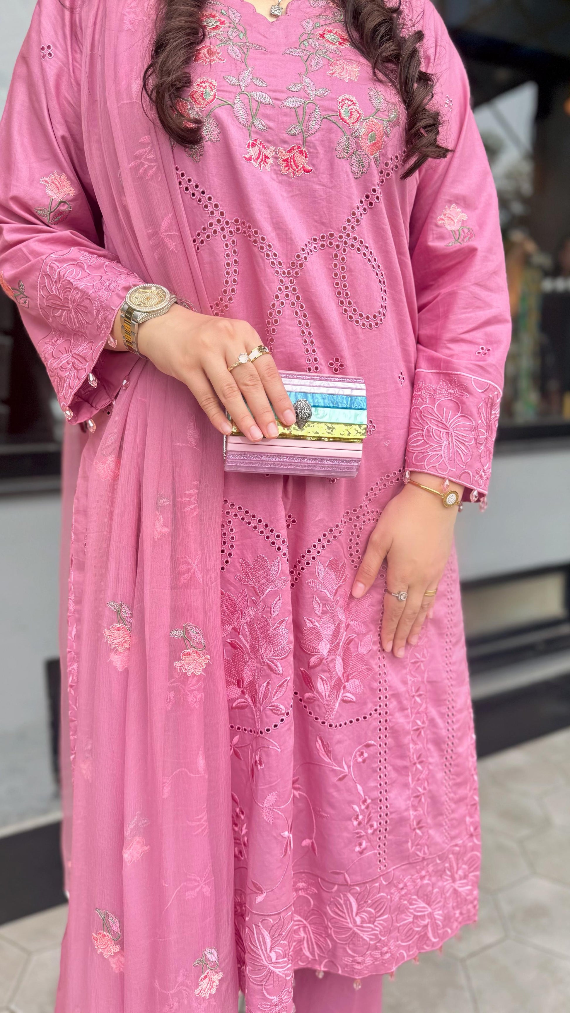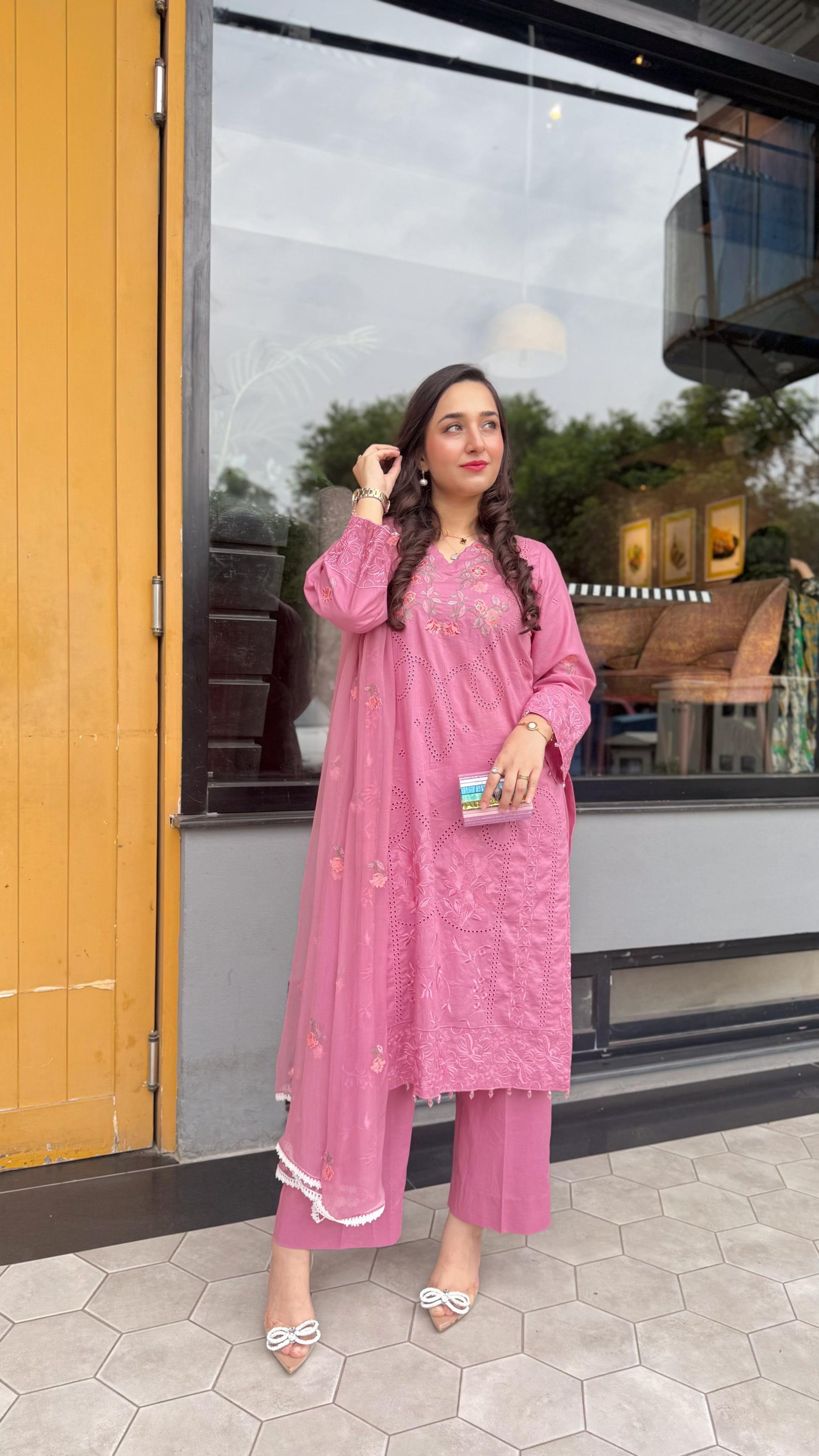 Crafted on premium lawn, this ensemble features a long silhouette shirt with double panels on both front and back, delicately adorned with lace inserts and embellishment on daman and sleeves. Intricate chicken kari embroidery graces the front, back, and sleeves, adding texture and elegance to every inch.