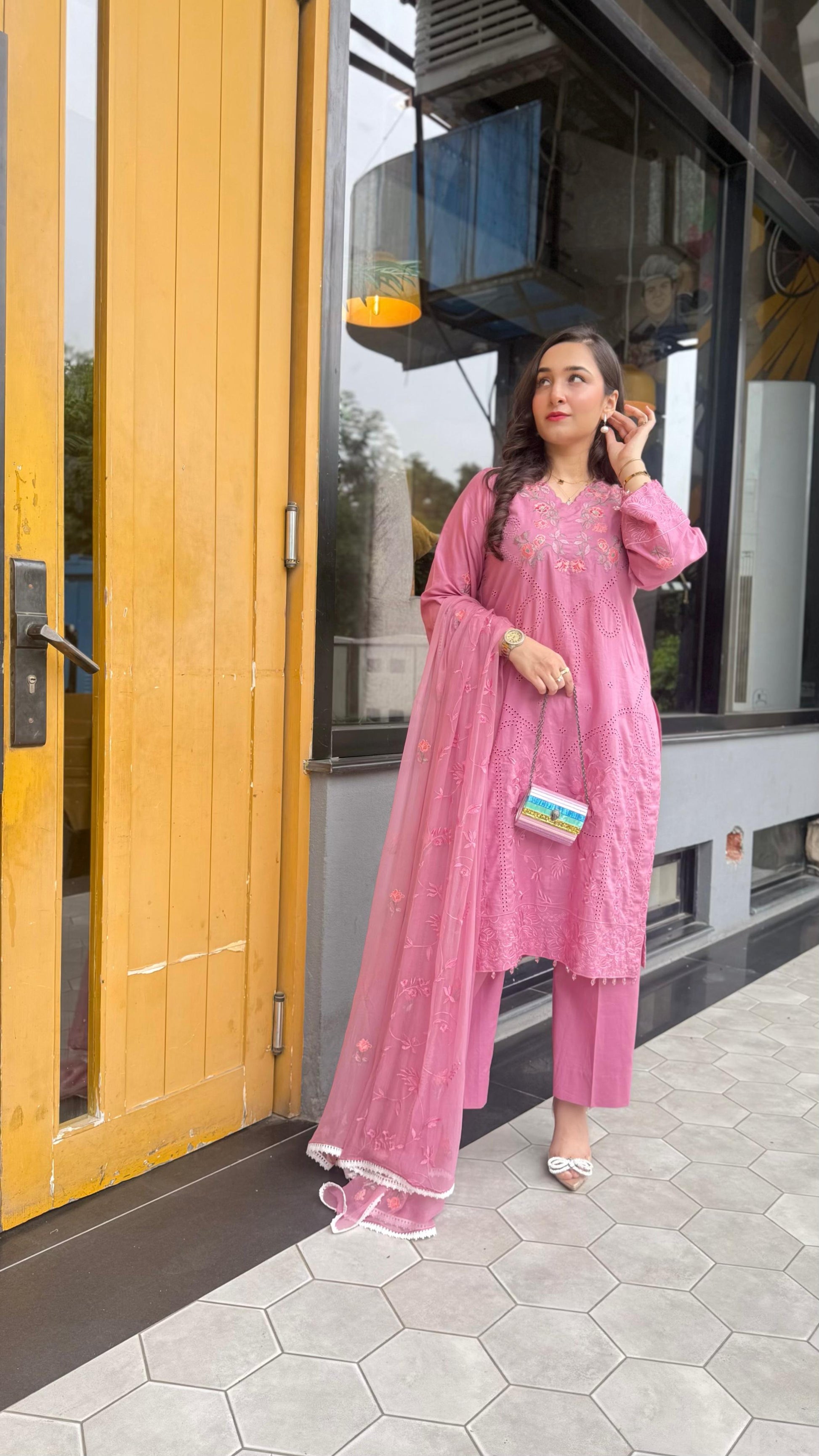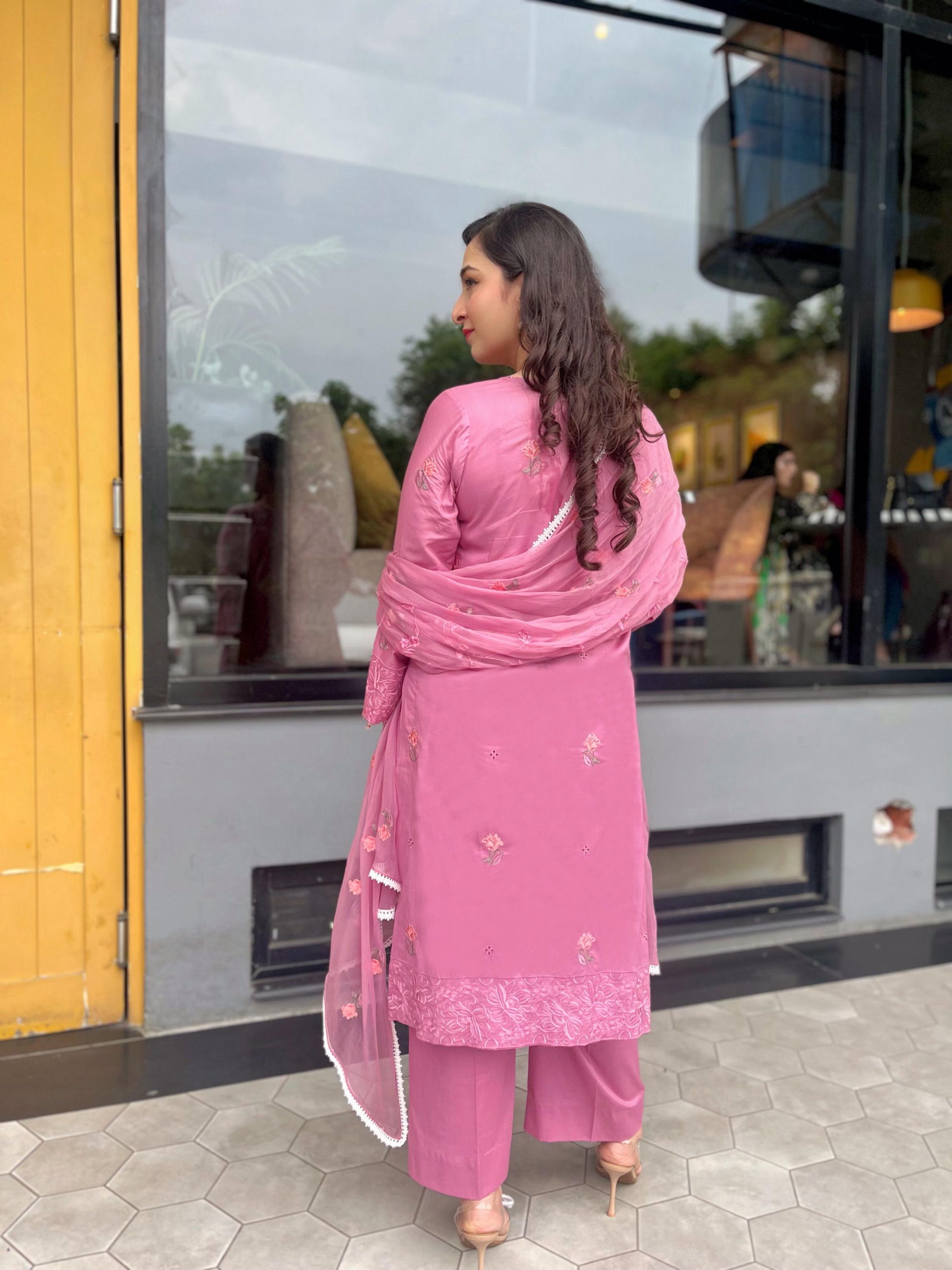 A fully embroidered chiffon dupatta flows effortlessly, lending an airy charm, perfect for summer sophistication. The trousers come unstitched, allowing you the freedom to style them your way — whether plazo, bell-bottom, wide-leg, or cigarette pants. In the stitched version, you’ll find it tailored with classic wide-leg trousers for a refined yet easygoing appeal.