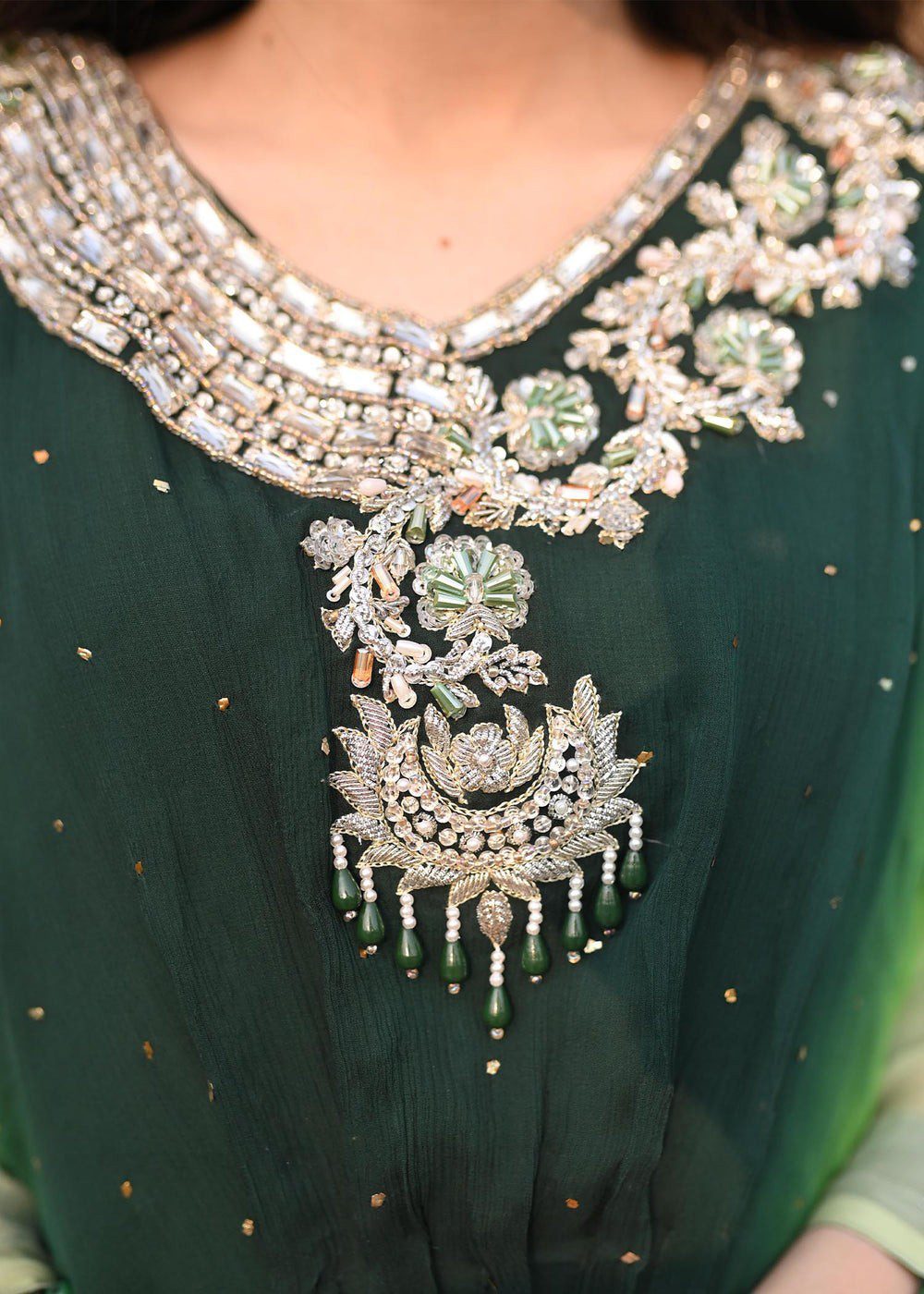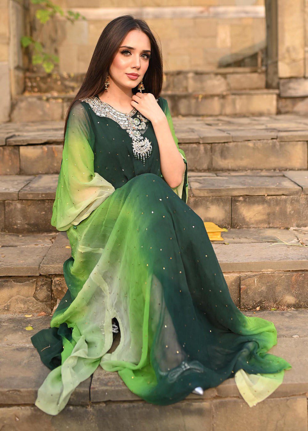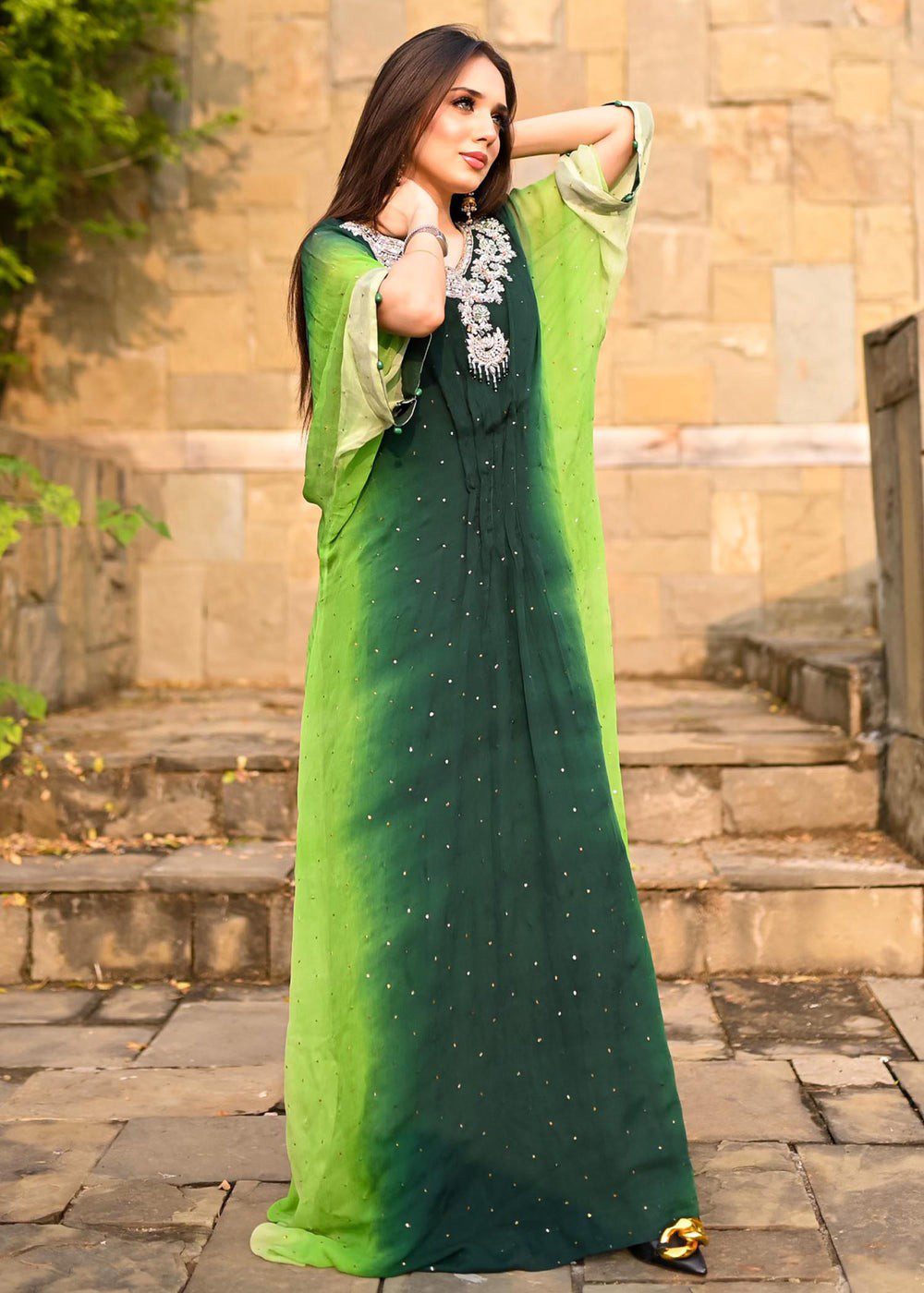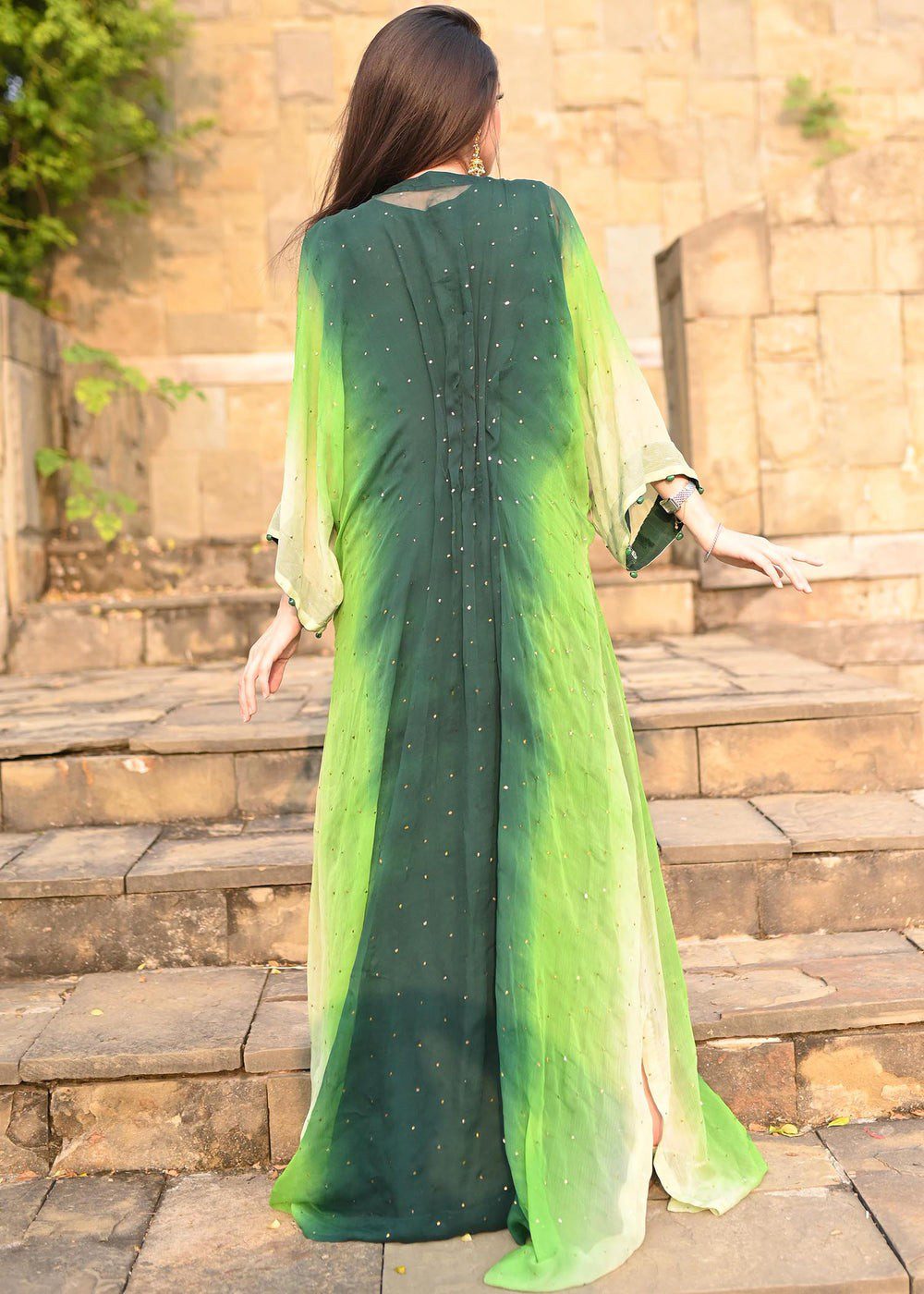 Description: Artistically designed kaftan with a perfect fusion of green ombre effect taking you from fresh leaf green to deep green. The color palette of the kaftan along with the handwork is all originally designed for you to turn heads at any occasion. The front neckline and sleeves are hand-worked with delicate zardozi work. Add this article to your wardrobe now! Disclaimer: Actual product color may vary slightly from the image.