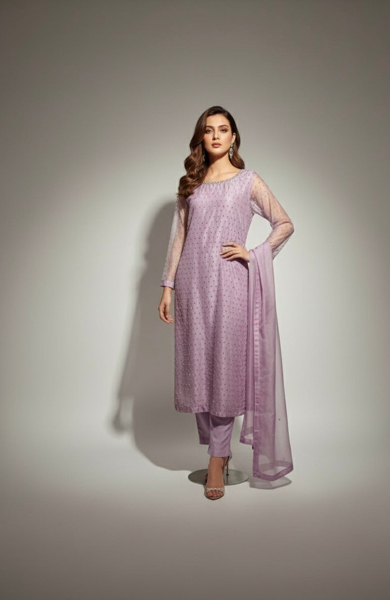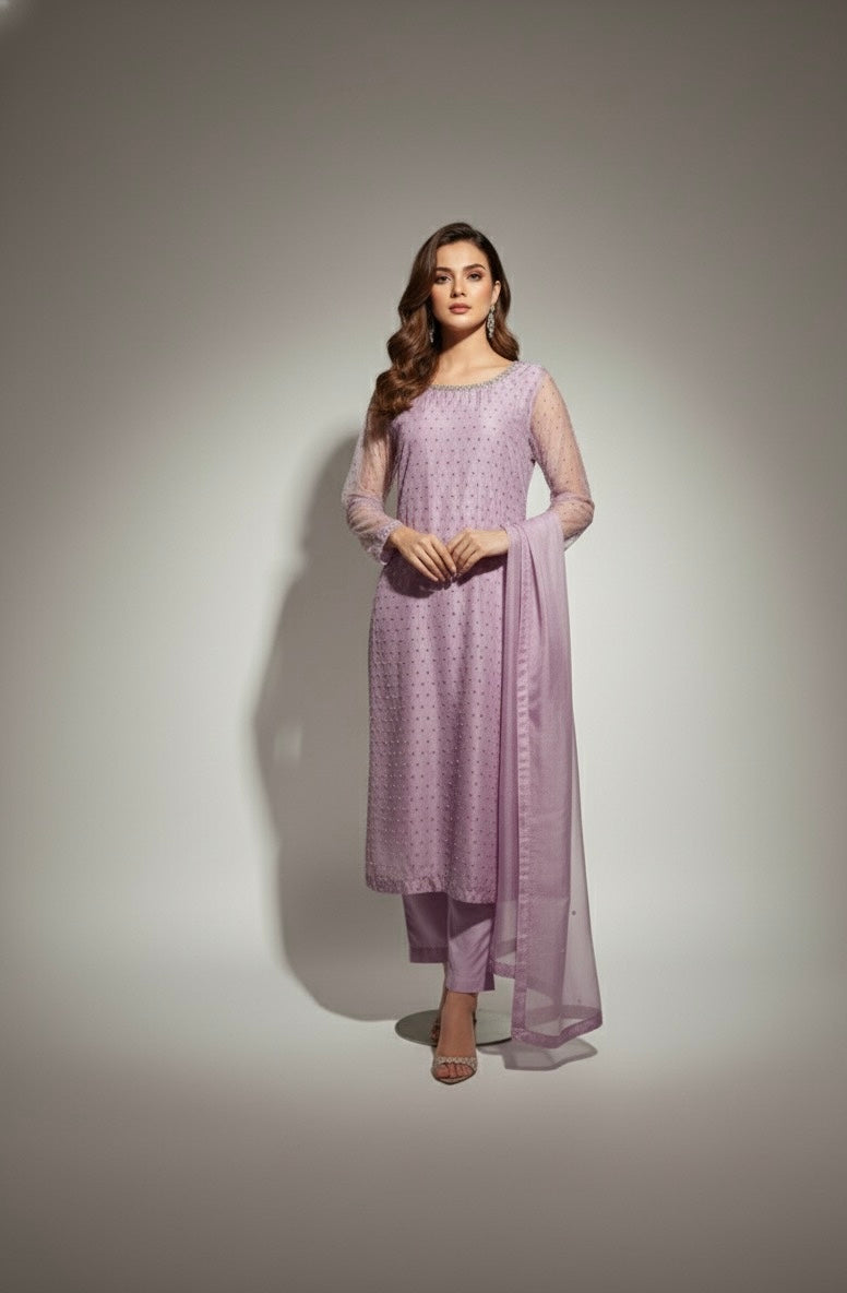 This exquisite ensemble showcases intricate handwork featuring the finest quality crystals on premium organza fabric. It includes a slip and straight pants. The detailed handwork is present on the front, back, and sleeves, providing a luxurious finish. The complete set also comes with a dupatta and trouser.