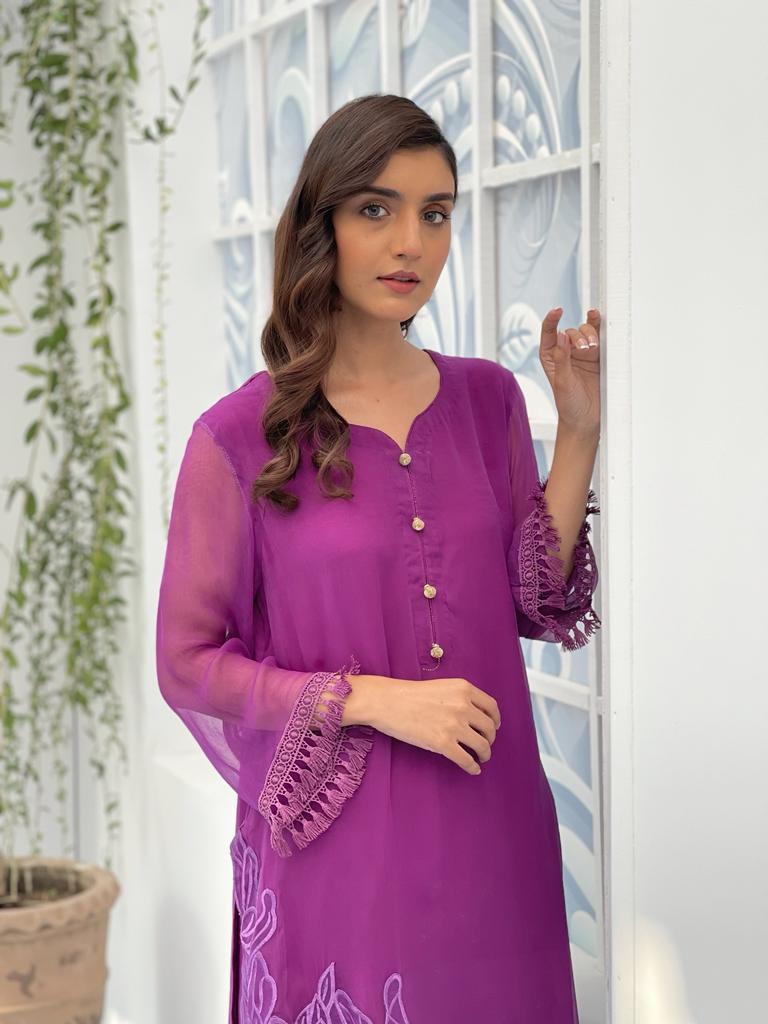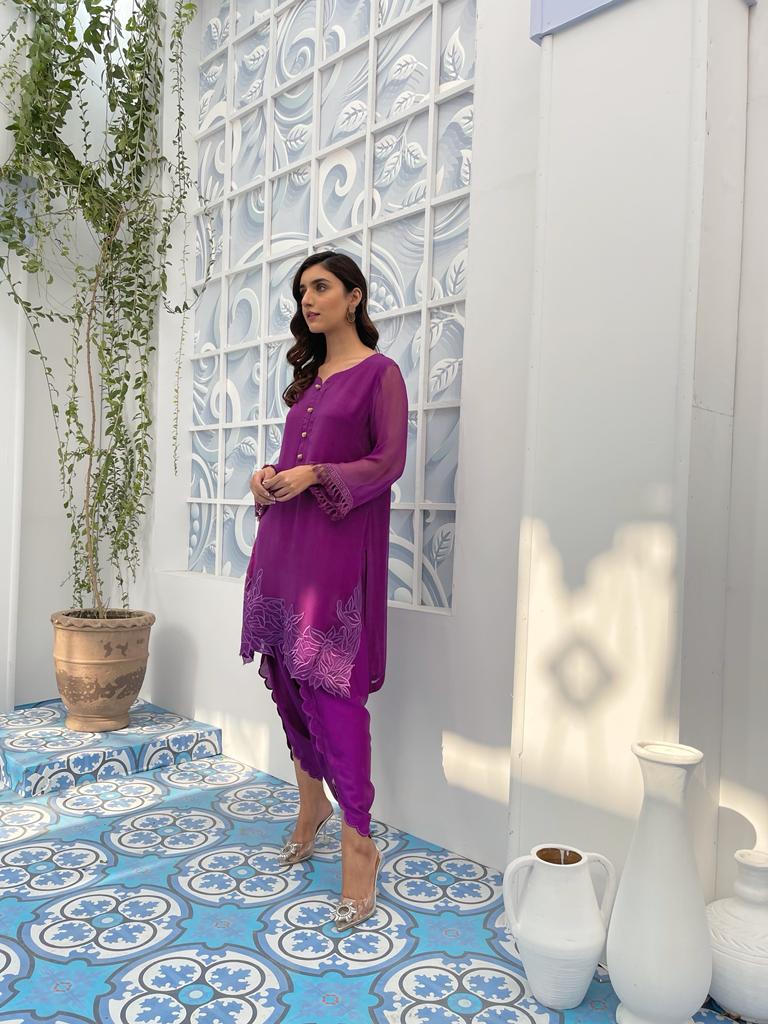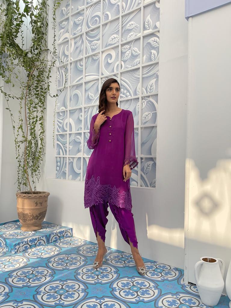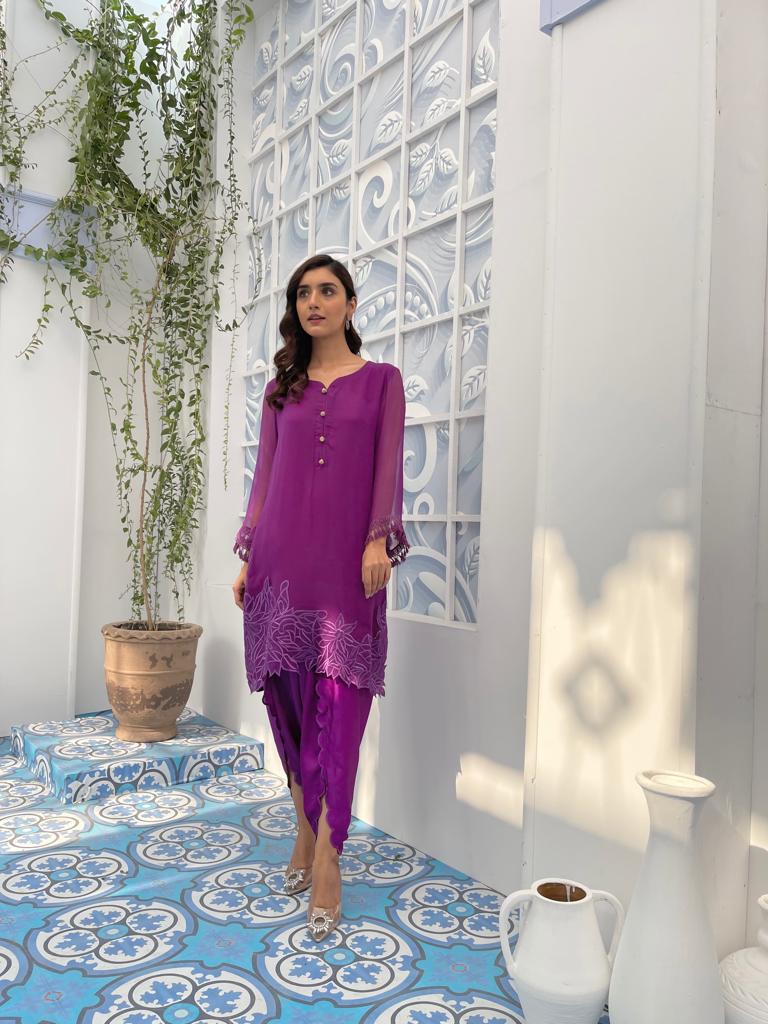 Purple color chiffon short shirt with cutwork. This article will make you look effortlessly chic and comfortable. Comes with tulip scalloped shalwar and attached slip