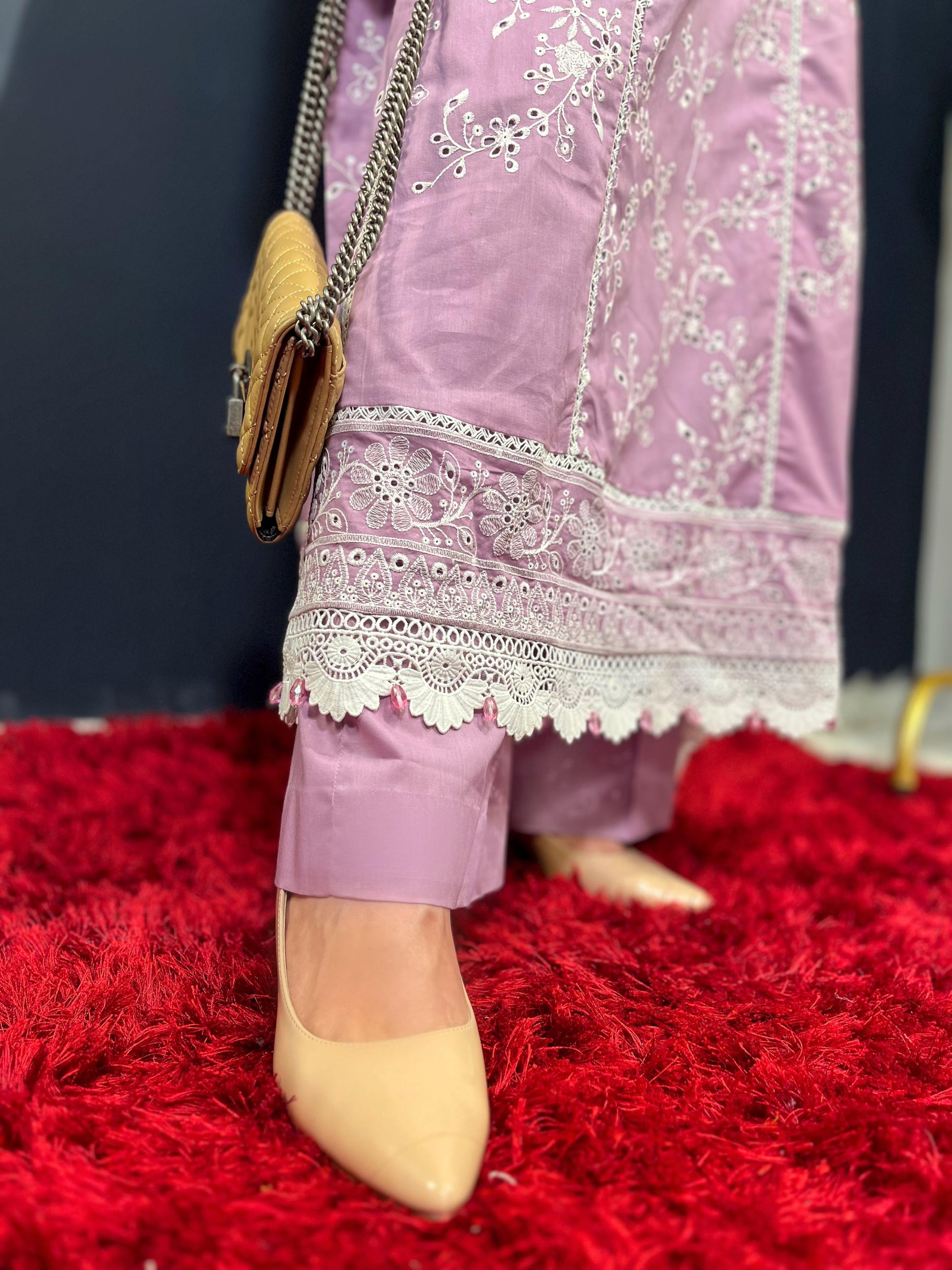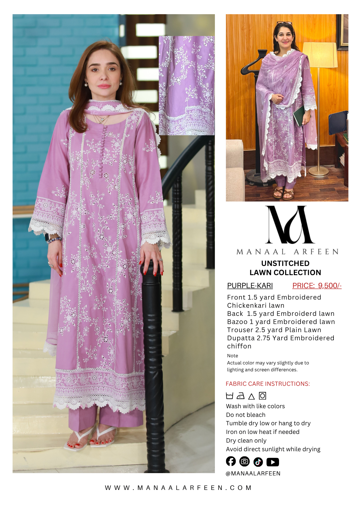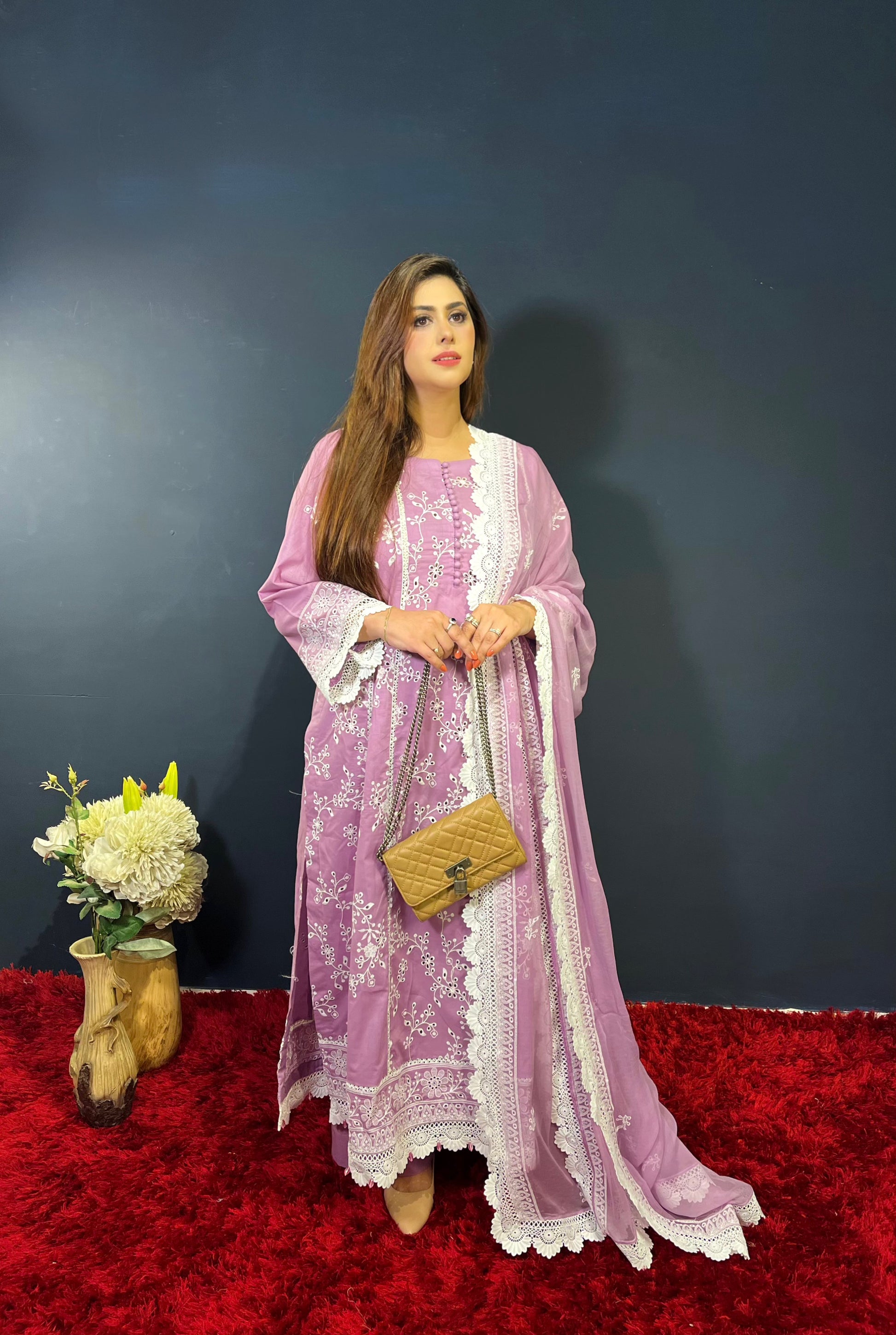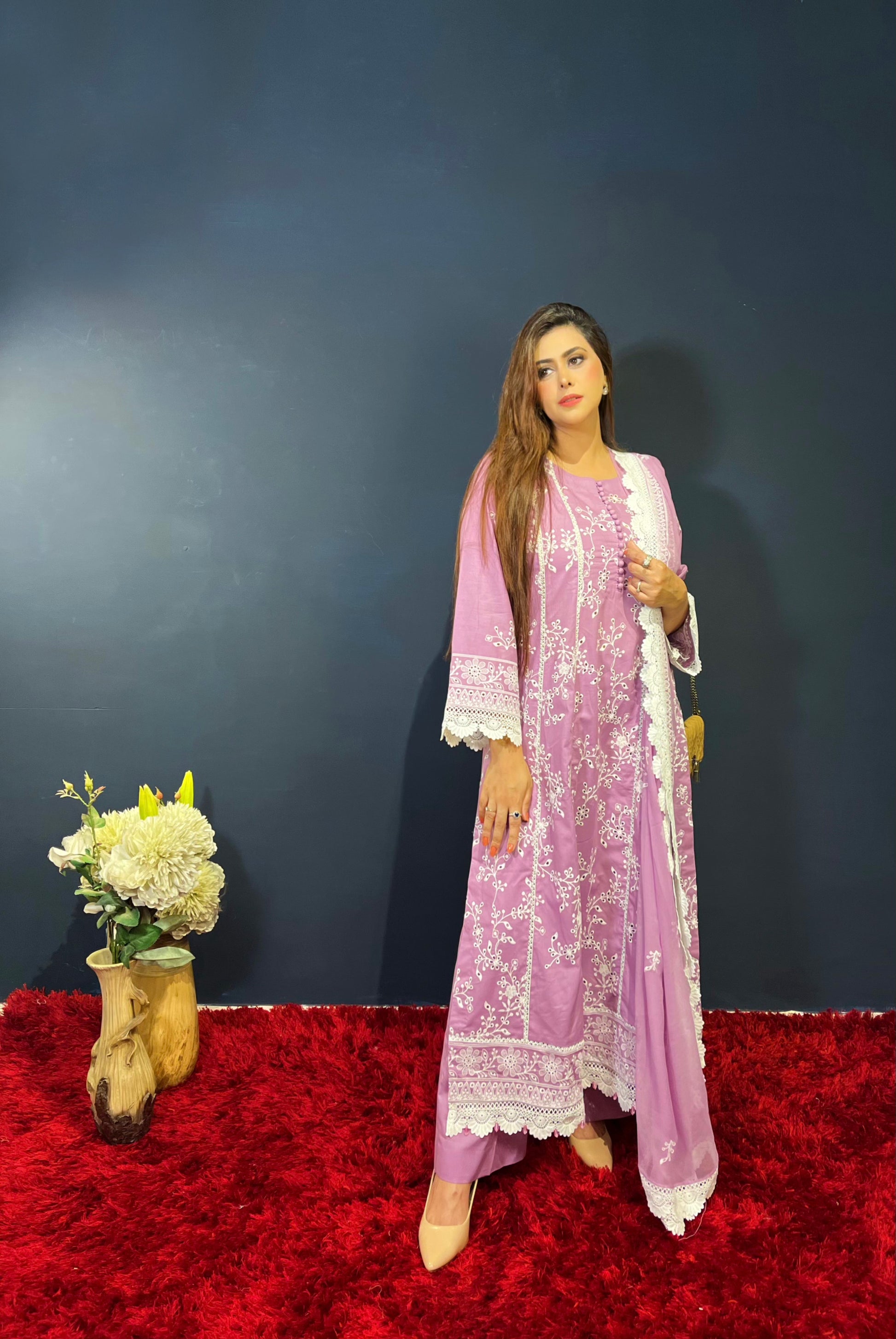 Crafted on premium lawn, this ensemble features a long silhouette shirt with double panels on both front and back, delicately adorned with lace inserts and embellishment on daman and sleeves. Intricate chicken kari embroidery graces the front, back, and sleeves, adding texture and elegance to every inch.