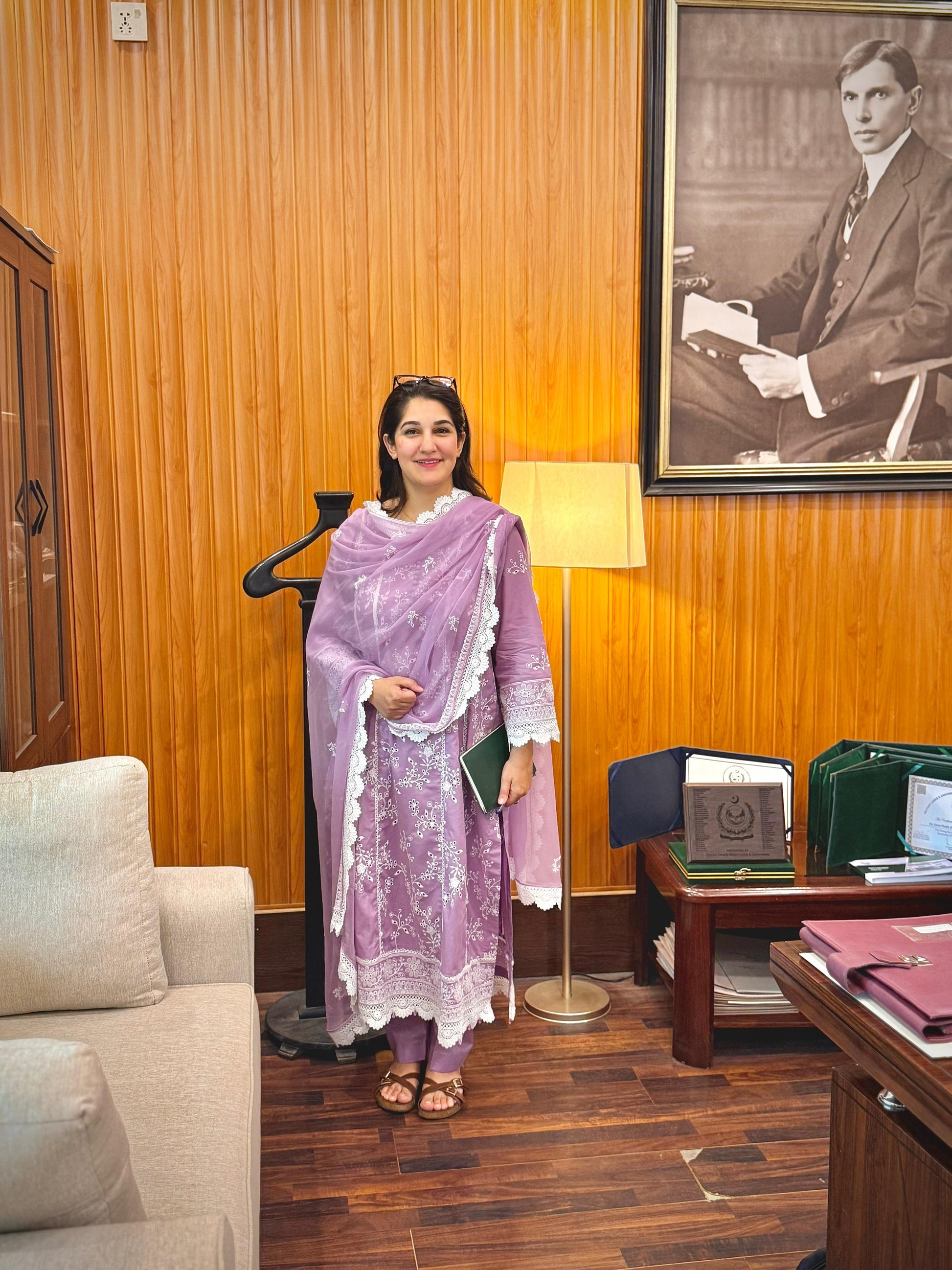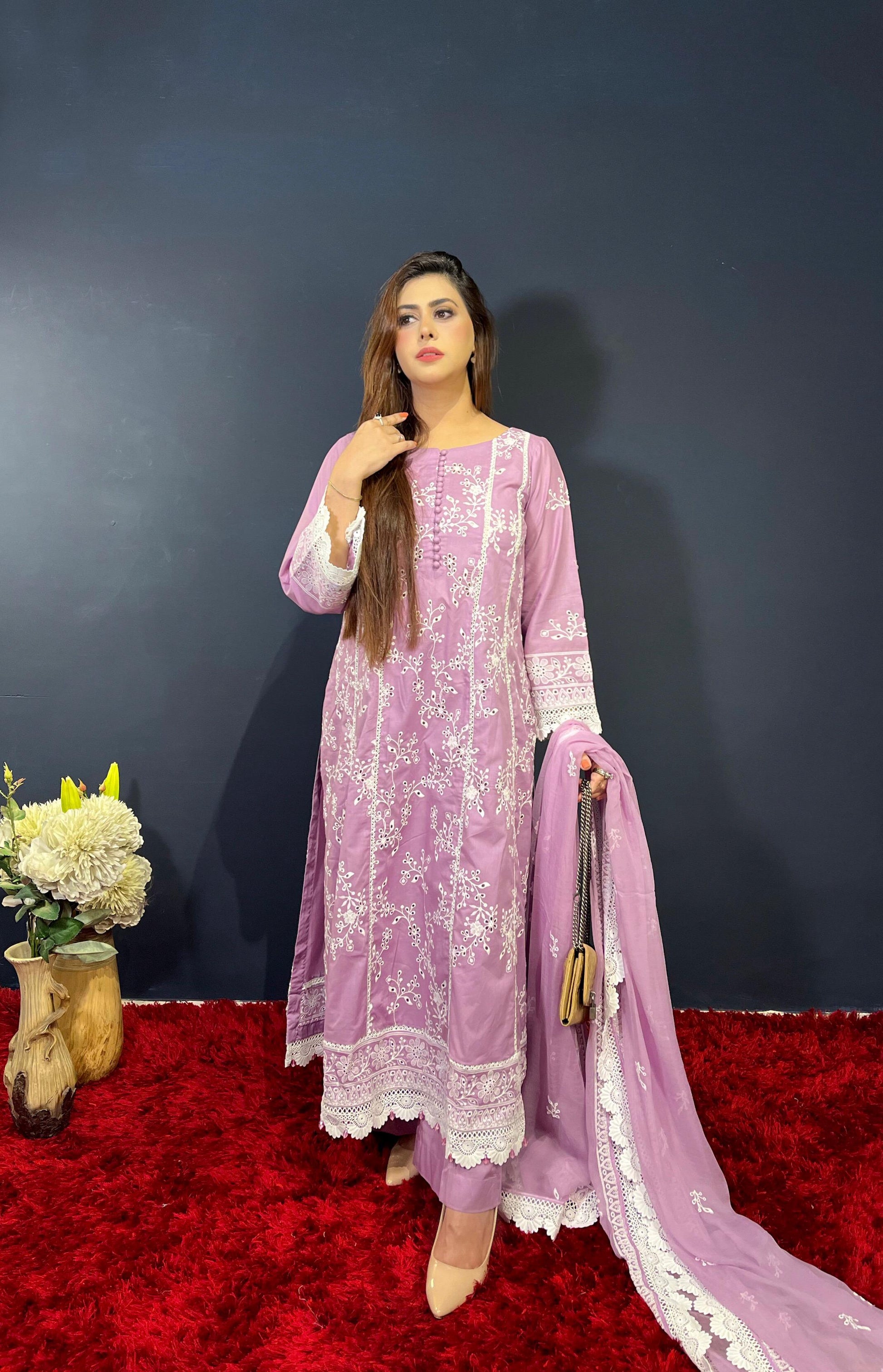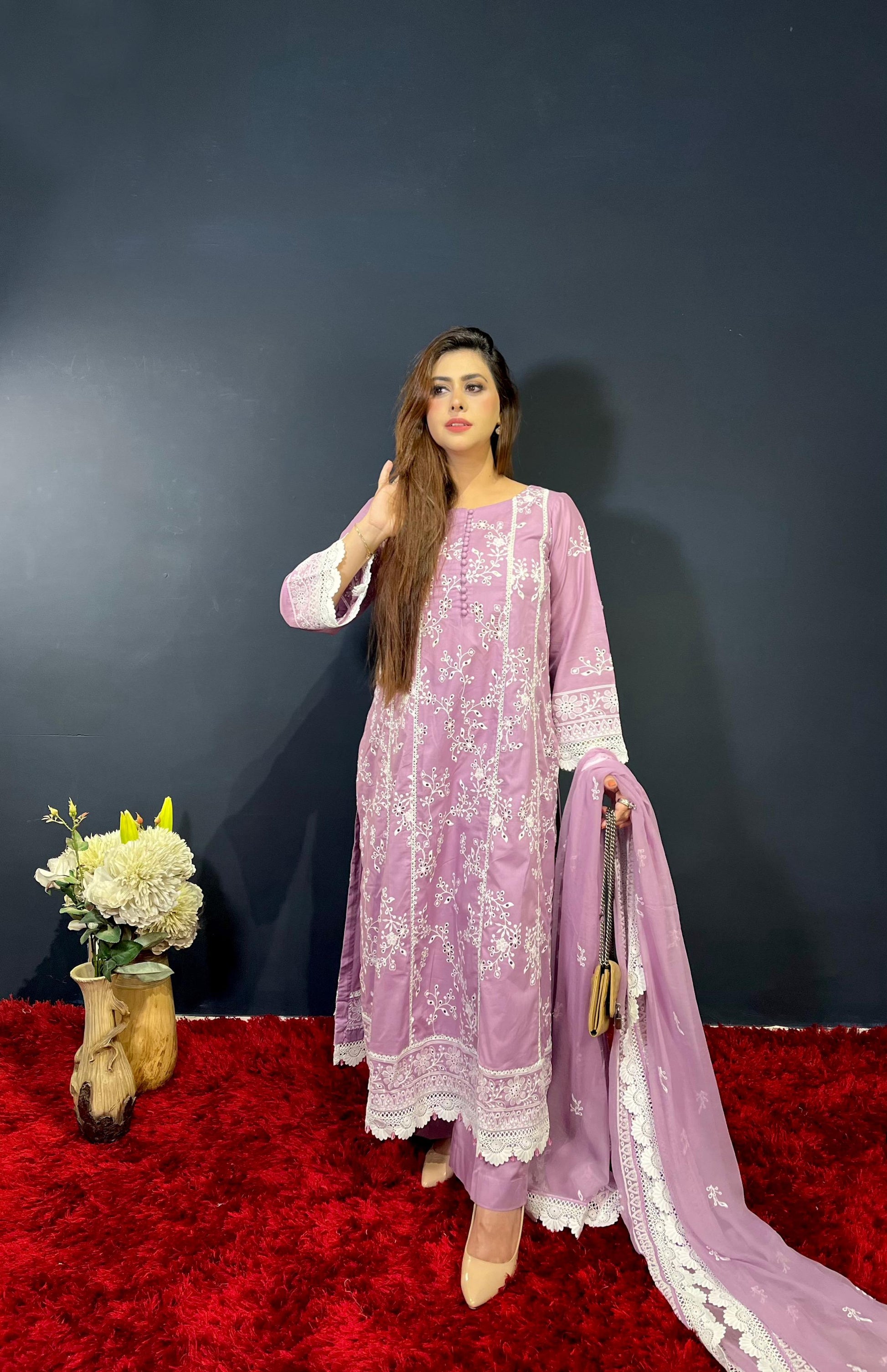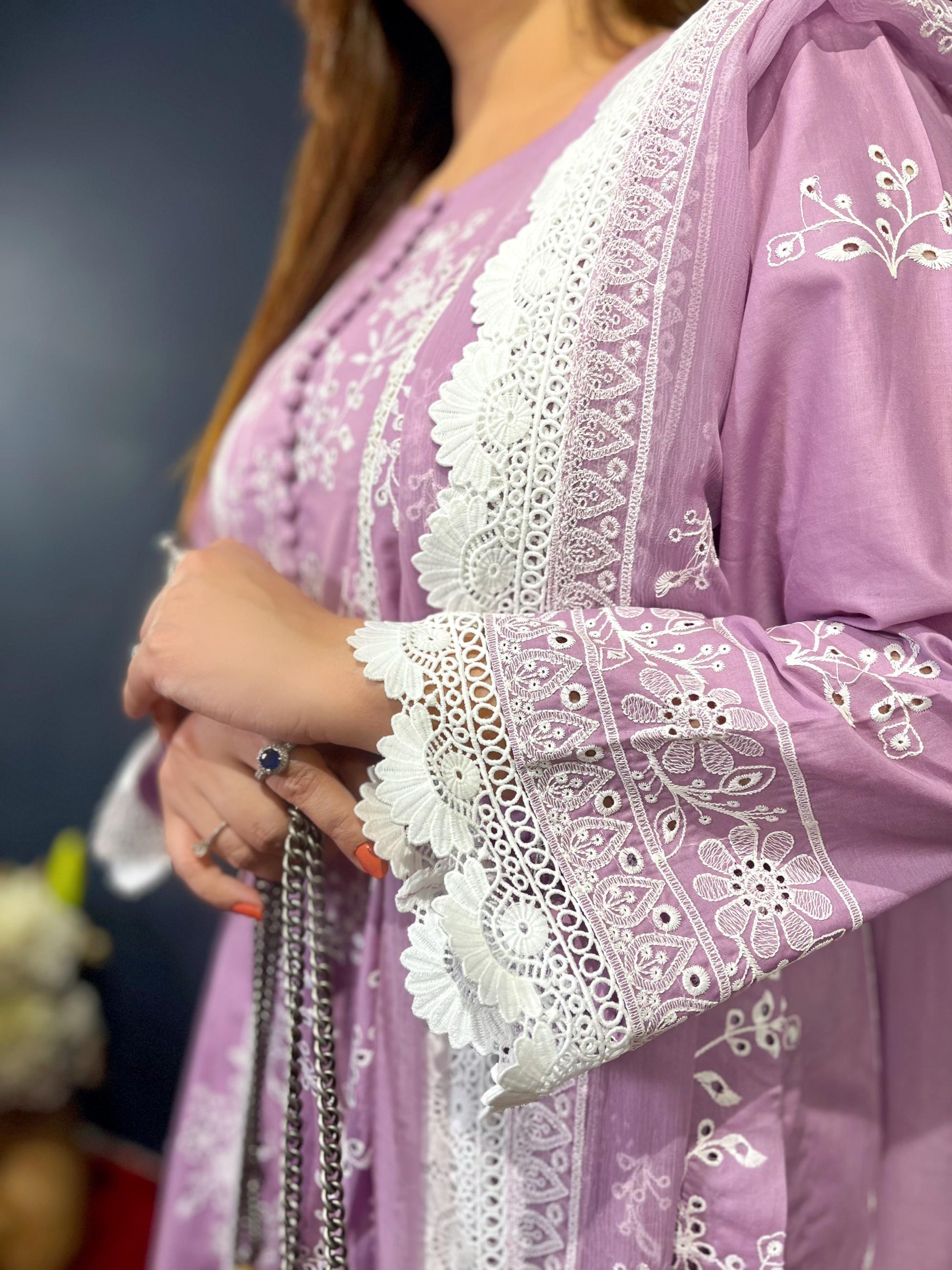 Crafted on premium lawn, this ensemble features a long silhouette shirt with double panels on both front and back, delicately adorned with lace inserts and embellishment on daman and sleeves. Intricate chicken kari embroidery graces the front, back, and sleeves, adding texture and elegance to every inch.