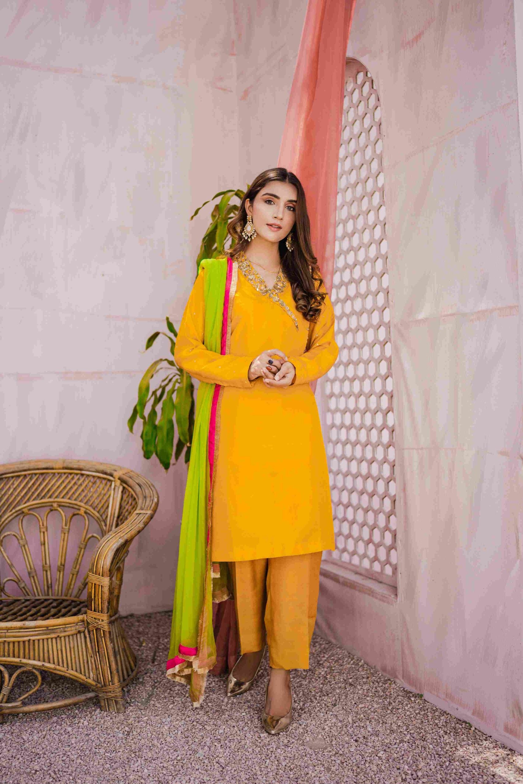 Pure raw silk shirt. Dabka, kora, sequins, pearls and zari used for hand embroidered neckline and side hems. Coat style neckline with handwork is the most beautiful part of design for this shirt. Paired with straight pants. Dupatta in apple green hue and magenta details with traditional kiran is paired with the ensemble. |