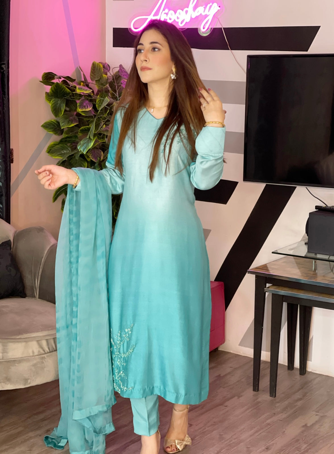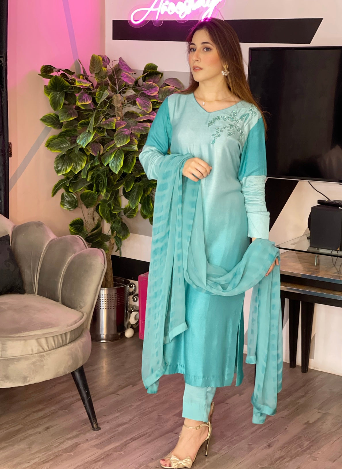 Drape yourself in the ethereal beauty of this two-color ombré suit, crafted from luxurious cotton net fabric that offers a lightweight and elegant drape. The outfit is exquisitely detailed with delicate handwork gracing both the shoulder and the daman, adding a subtle shimmer and artistry to the rich gradient. This beautiful suit is perfectly paired with a vibrant chiffon tie-and-dye dupatta and comfortable straight trousers, resulting in a beautifully coordinated and sophisticated look ready for any festive occasion.