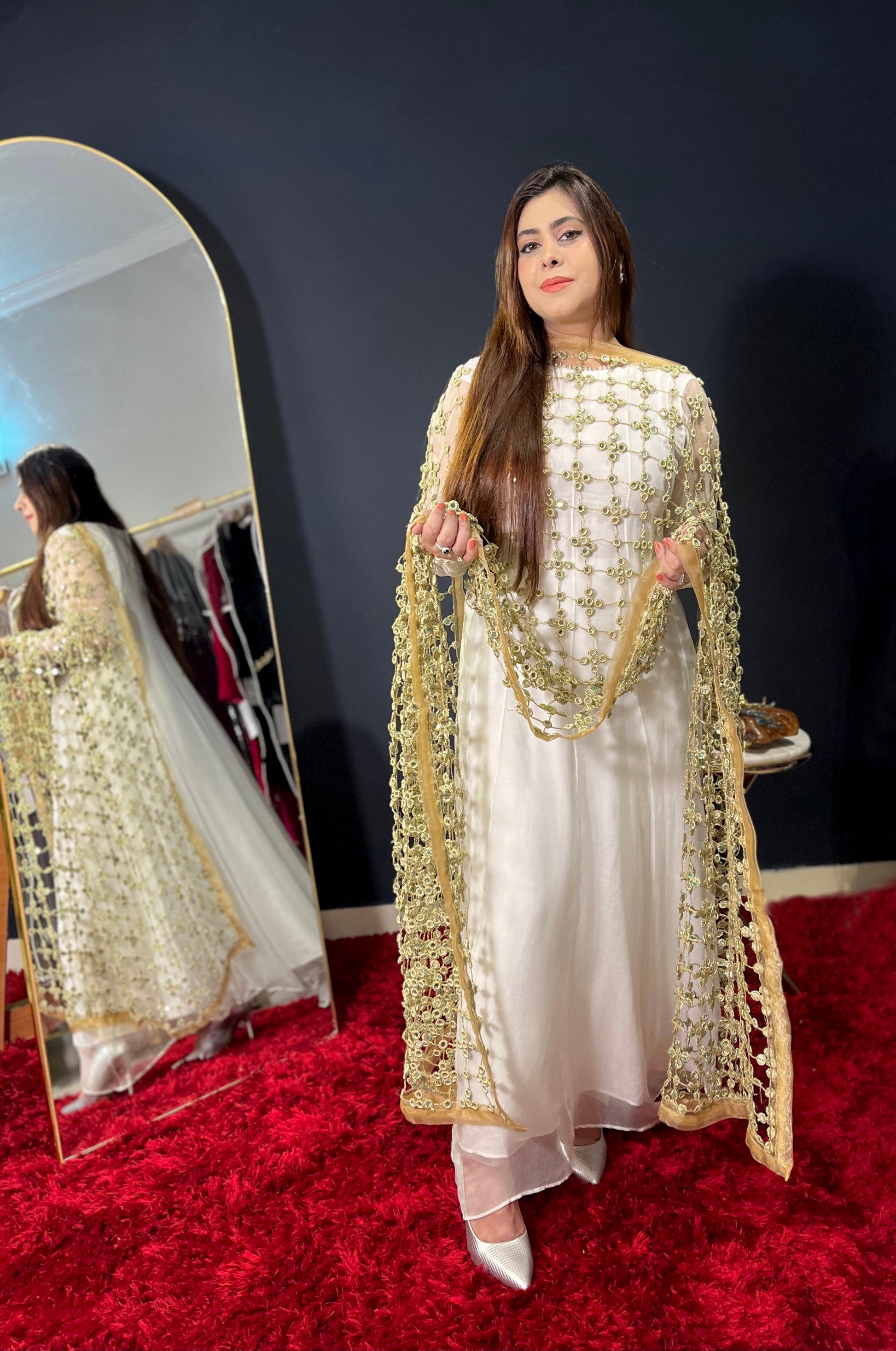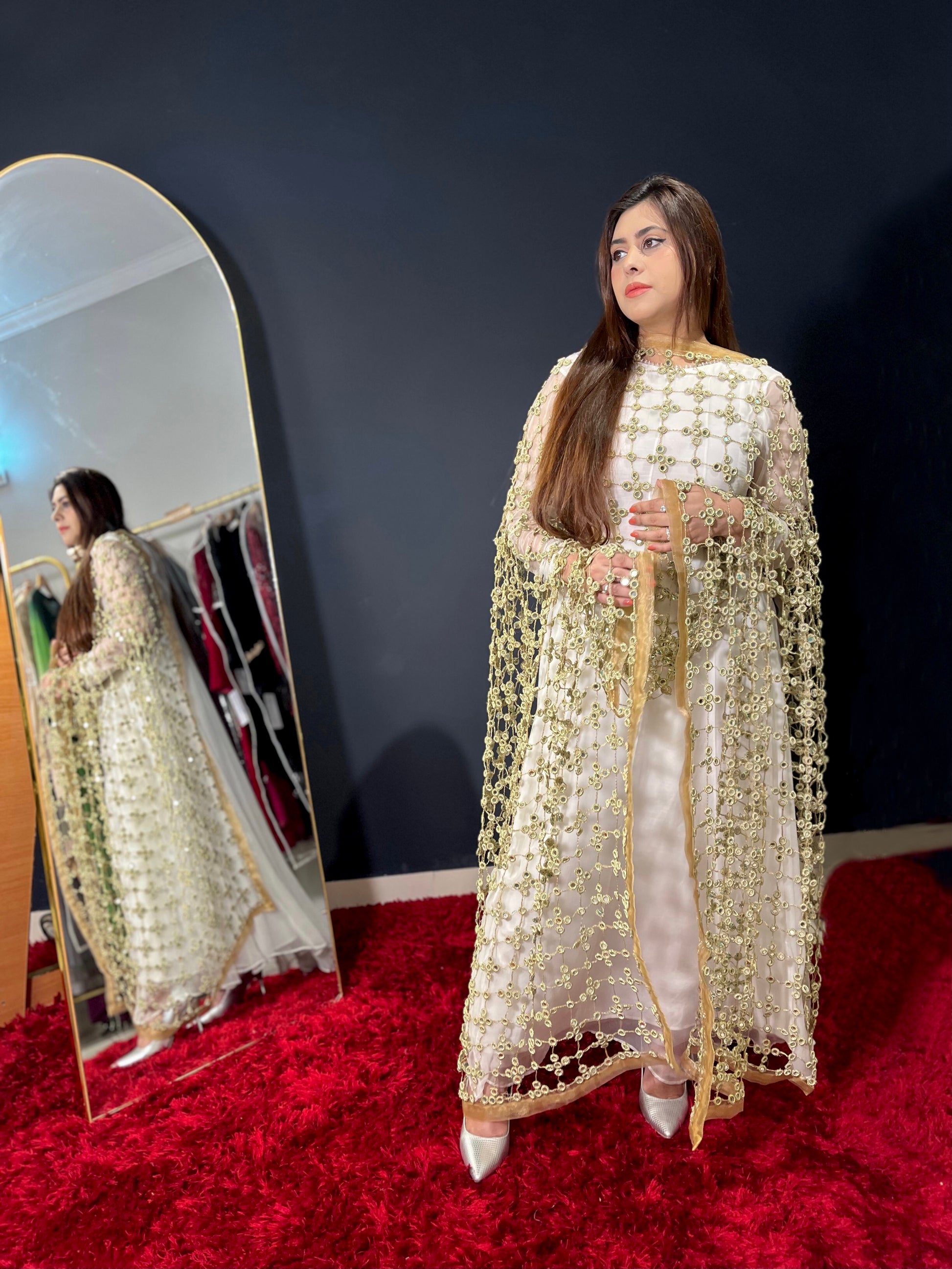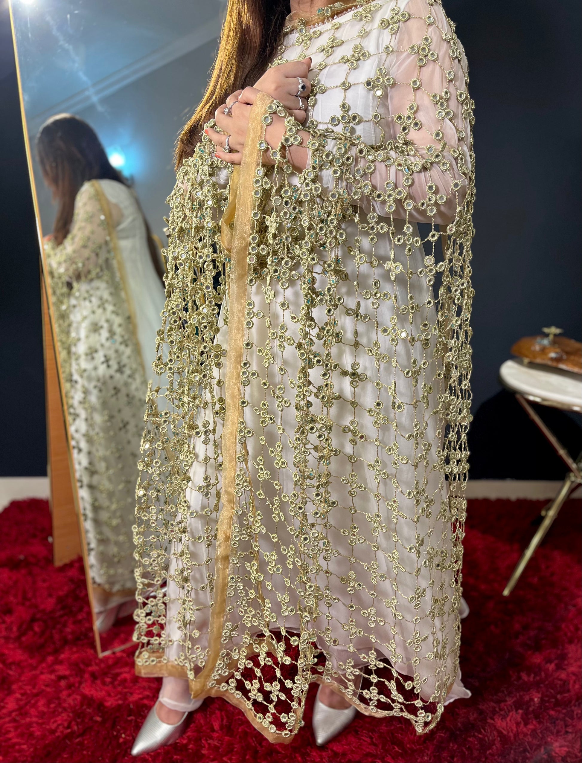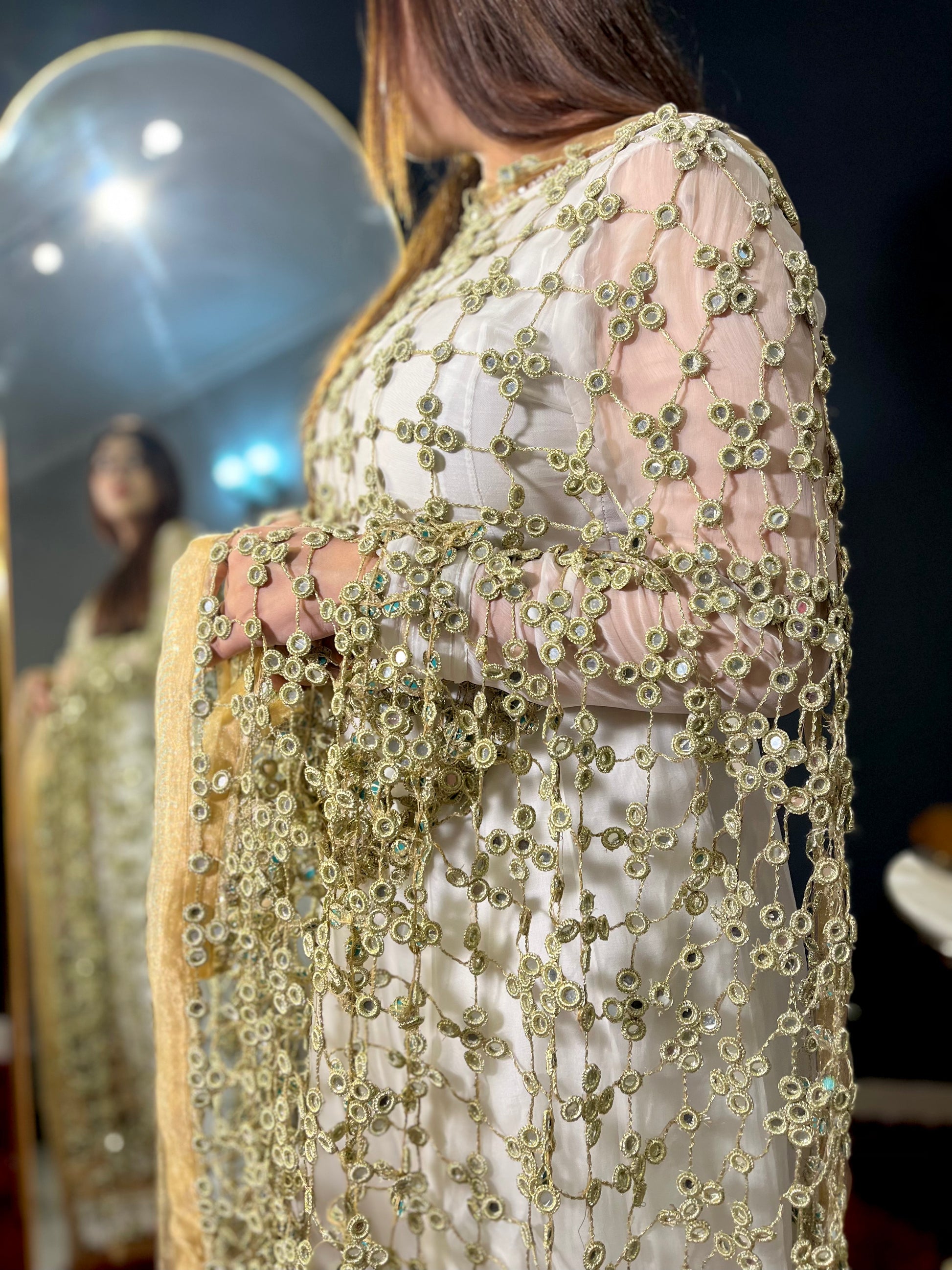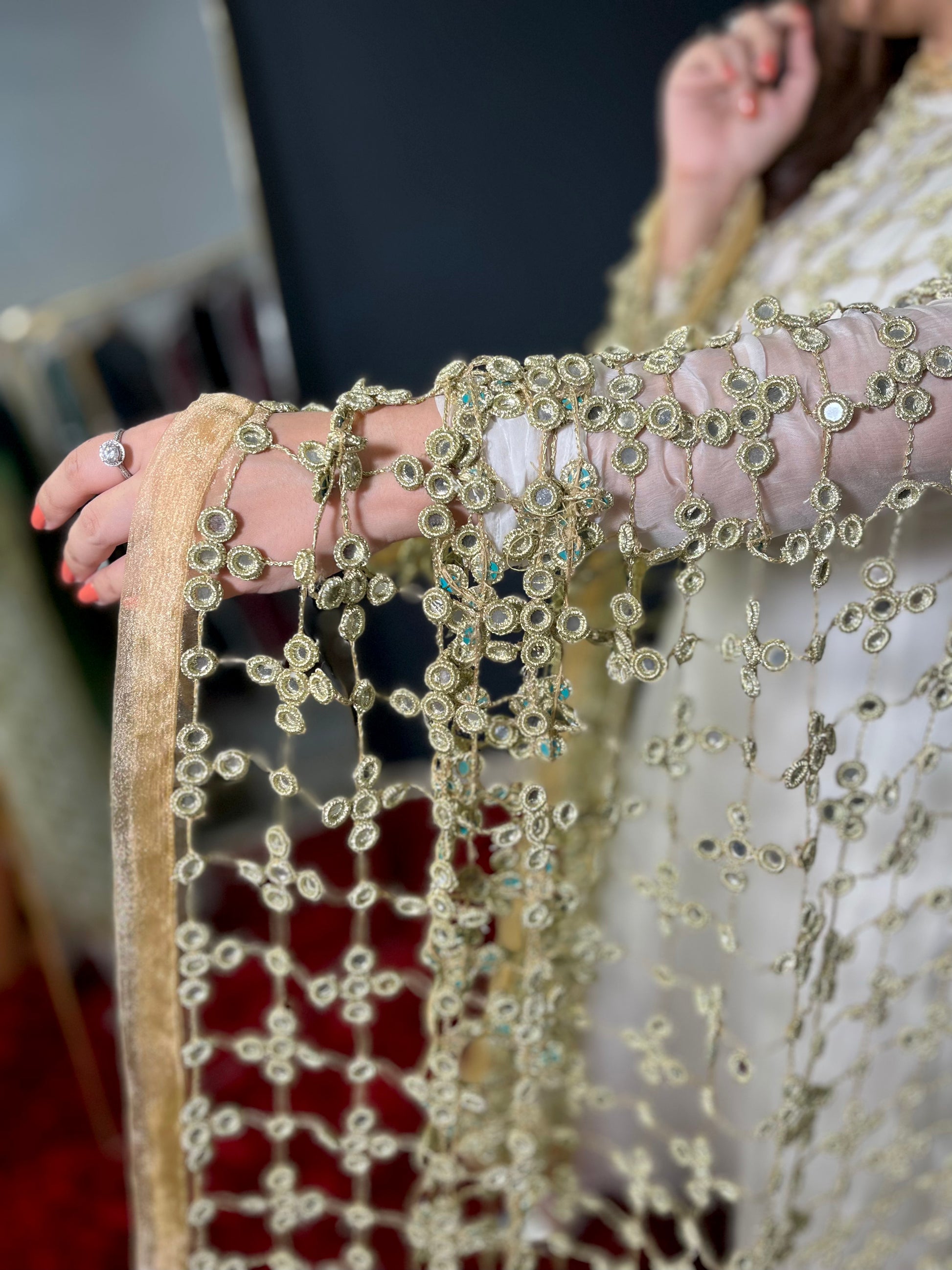 Description: Experience the timeless beauty of the Sheesh Mahal dupatta. This handcrafted masterpiece, with a length of 2.75 yards, features real mirrors and intricate ari work, reflecting a rich heritage. It’s more than an accessory; it’s a wearable work of art, perfect for adding elegance and cultural richness to any outfit, designed to be cherished.