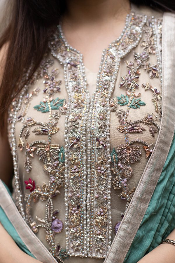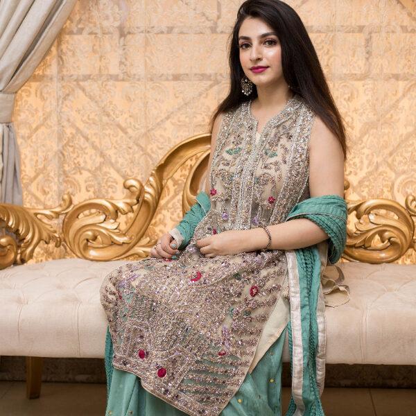 Limited Edition: heavily embellished shirt on net fabric made with kora, dabka, French knots, tilla, diamontes, and what not! Comes with a slip and huge flare pants on Mukesh fabric and crushed dupatta! \n