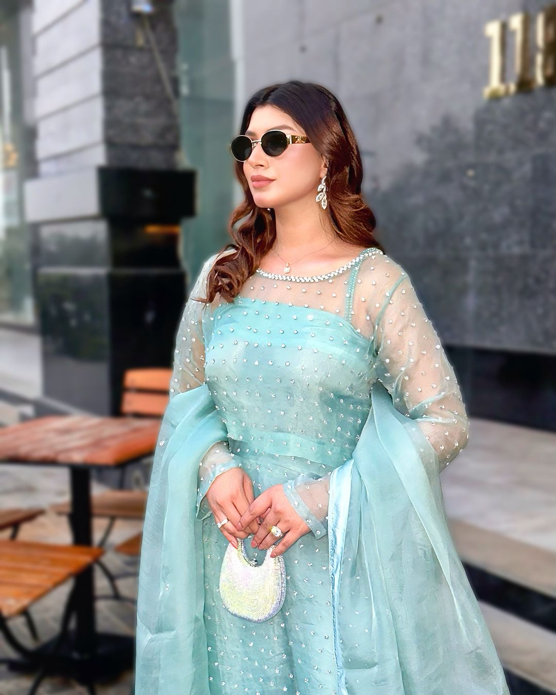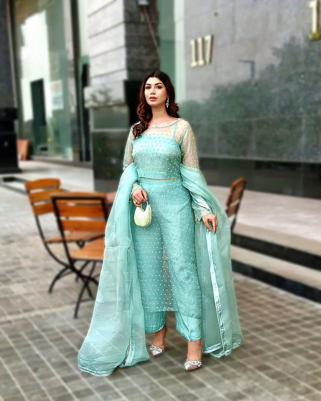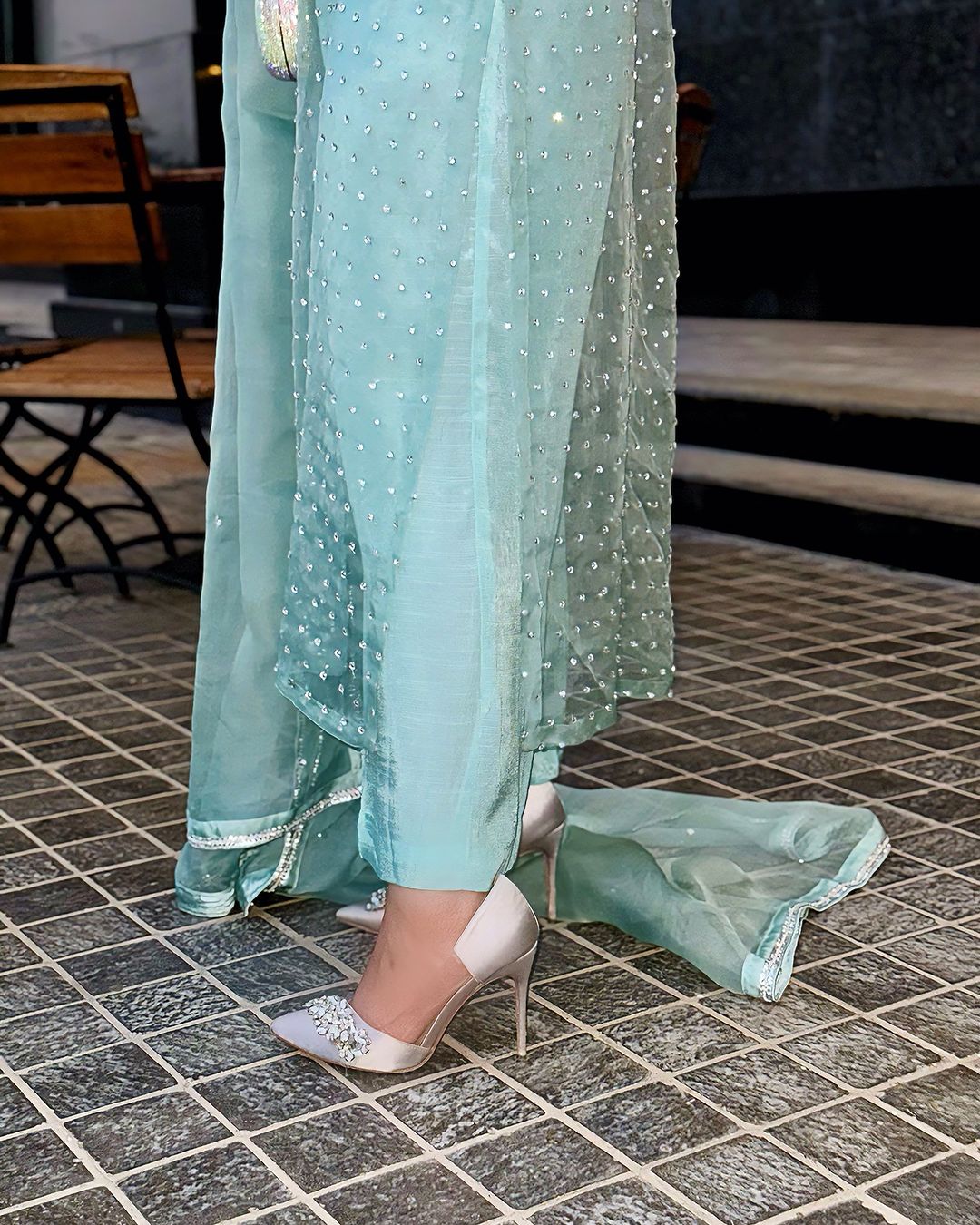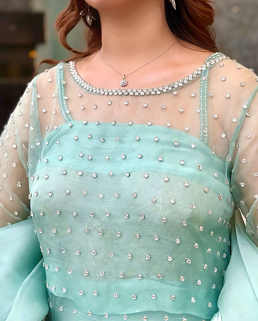 This exquisite ensemble showcases intricate handwork featuring the finest quality crystals on premium organza fabric. It includes a short slip and palazzo pants, with the option to pair it with a long shirt and palazzo pants for added versatility. The detailed handwork is present on the front, back, and sleeves, providing a luxurious finish. The complete set also comes with a dupatta, inner, and trouser.