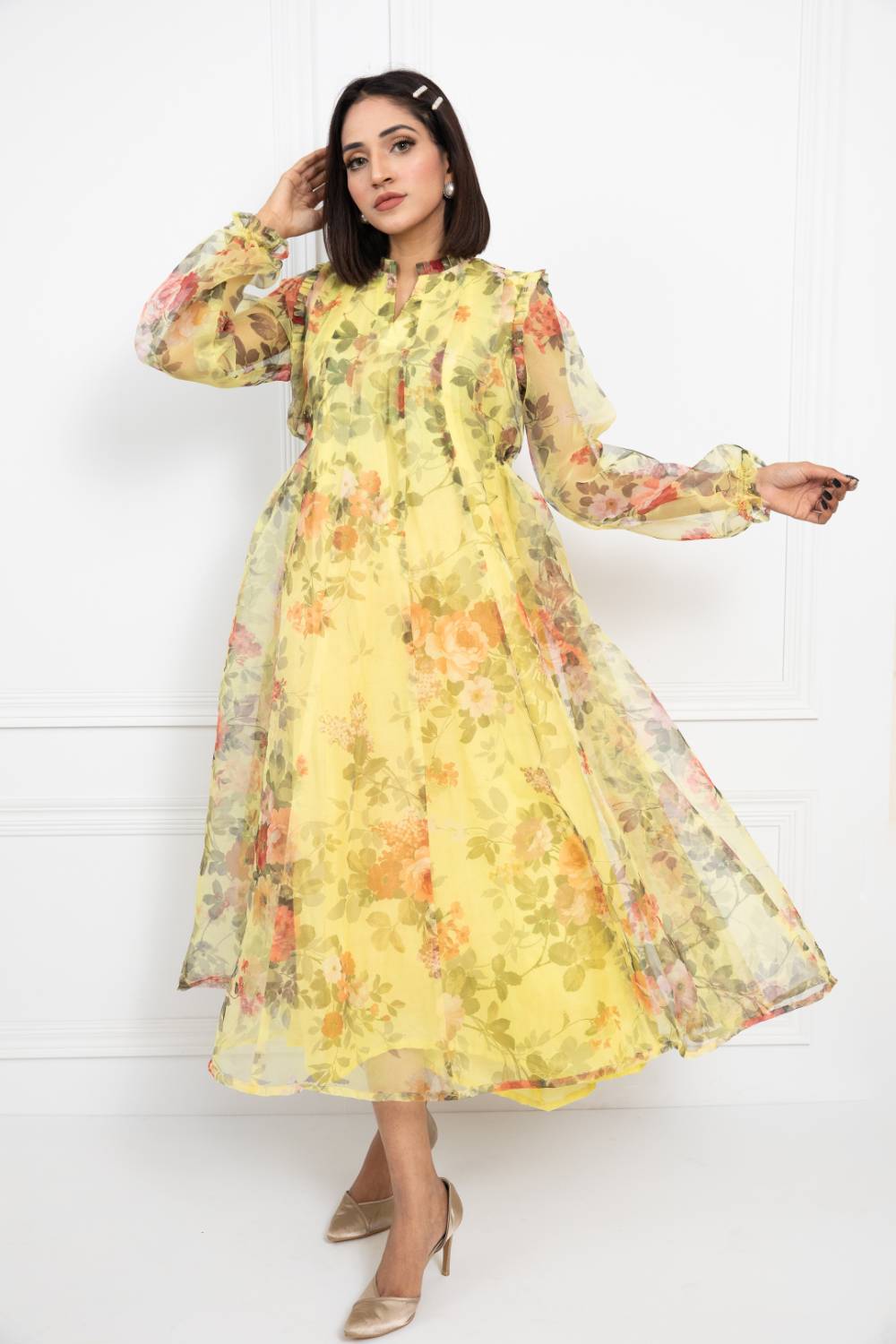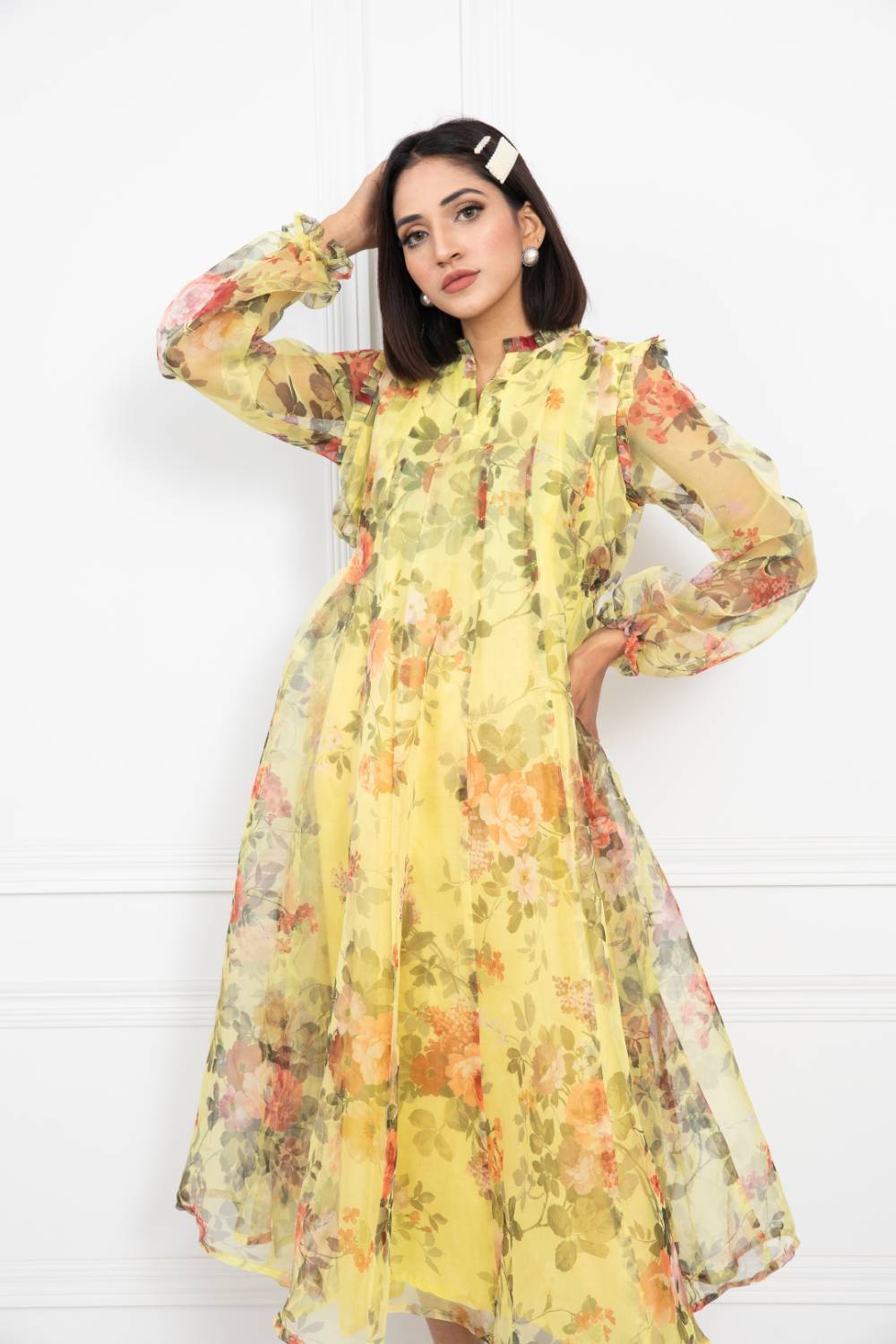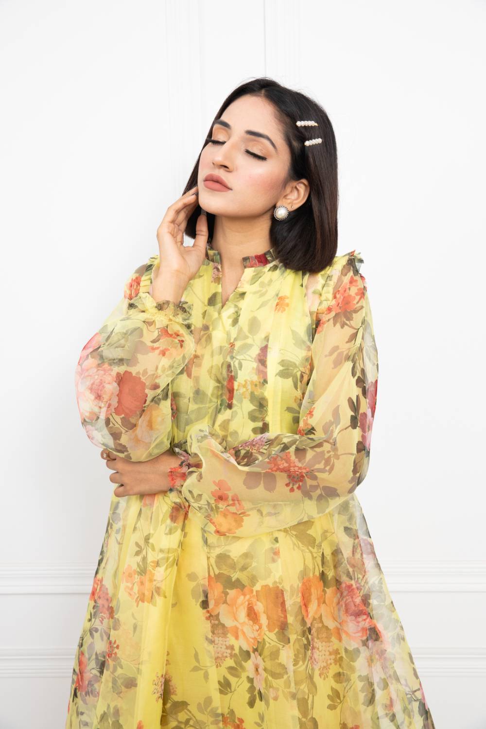 A look straight out of a fairy tale. An astonishing long dress tailored with lemon-shaded custom-made organza floral fabric. With smocking on sleeves and waistline.
