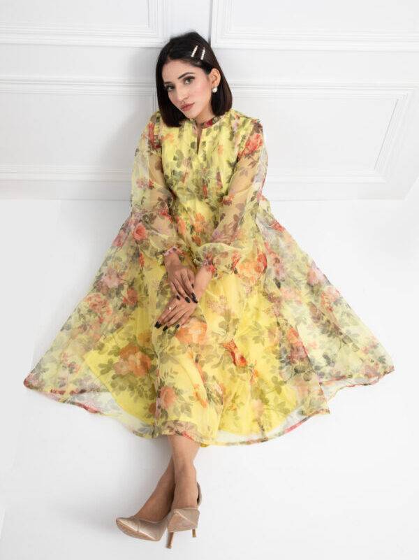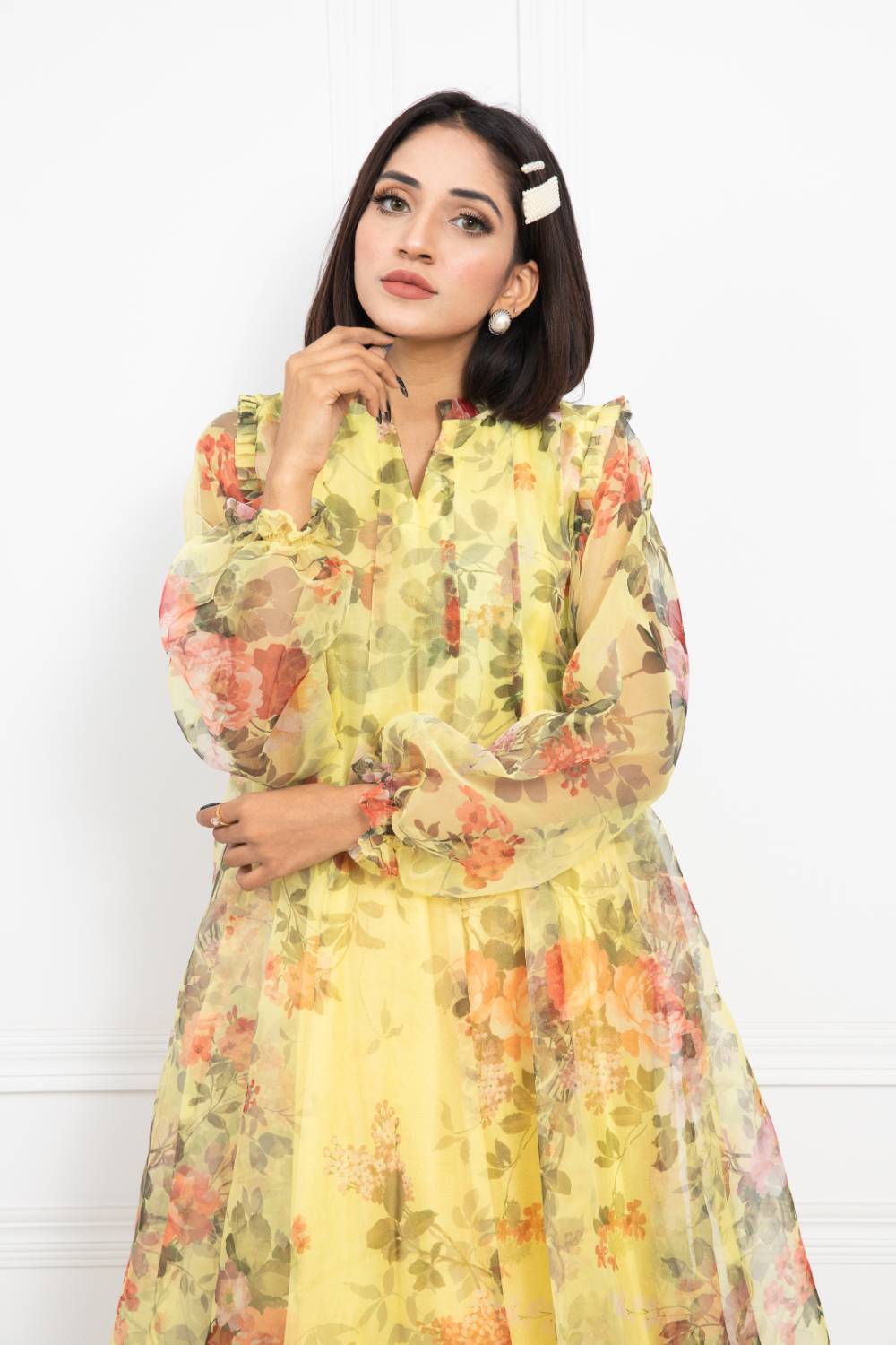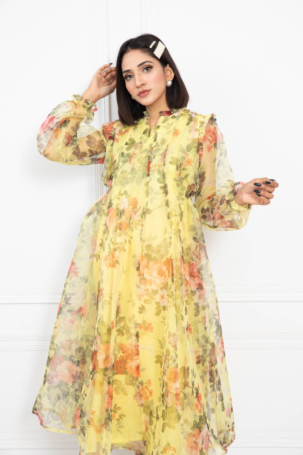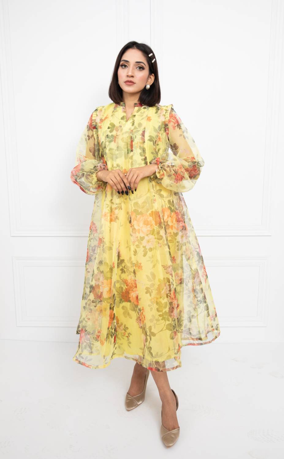A look straight out of a fairy tale. An astonishing long dress tailored with lemon-shaded custom-made organza floral fabric. With smocking on sleeves and waistline.
