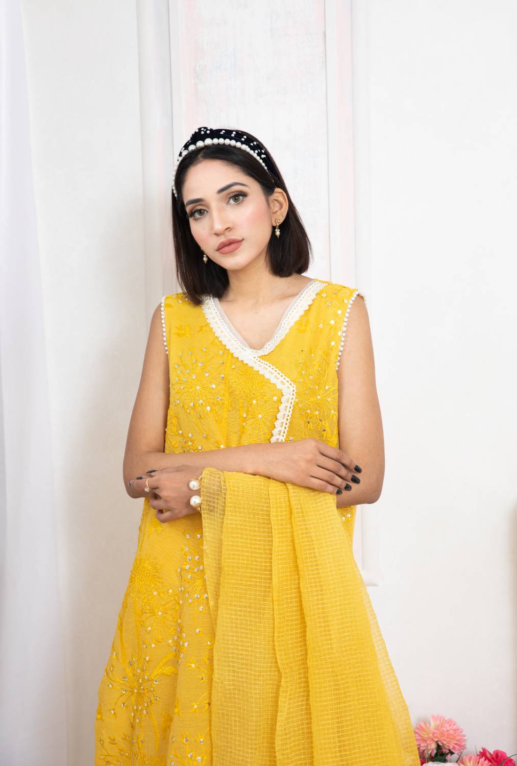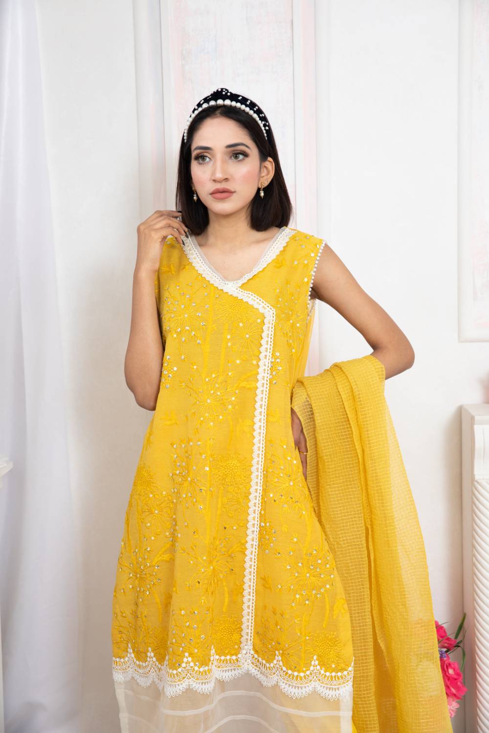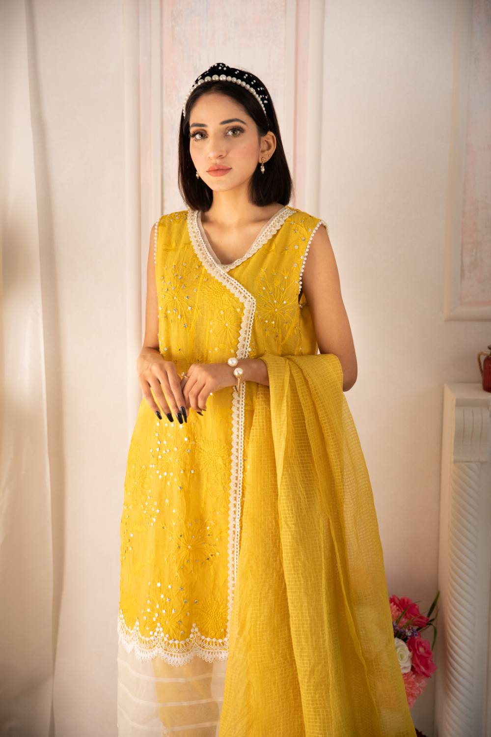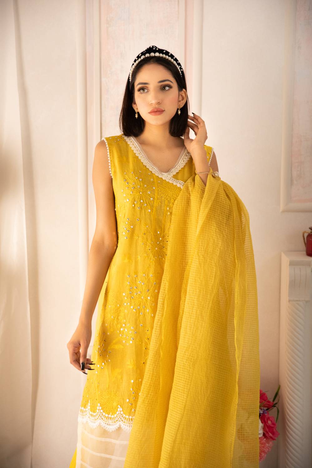 Cotton Net Front Worked Sequins And Pearls