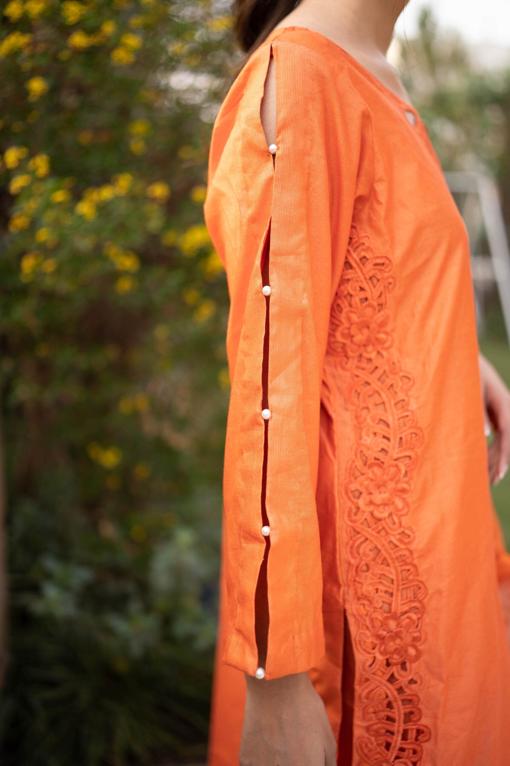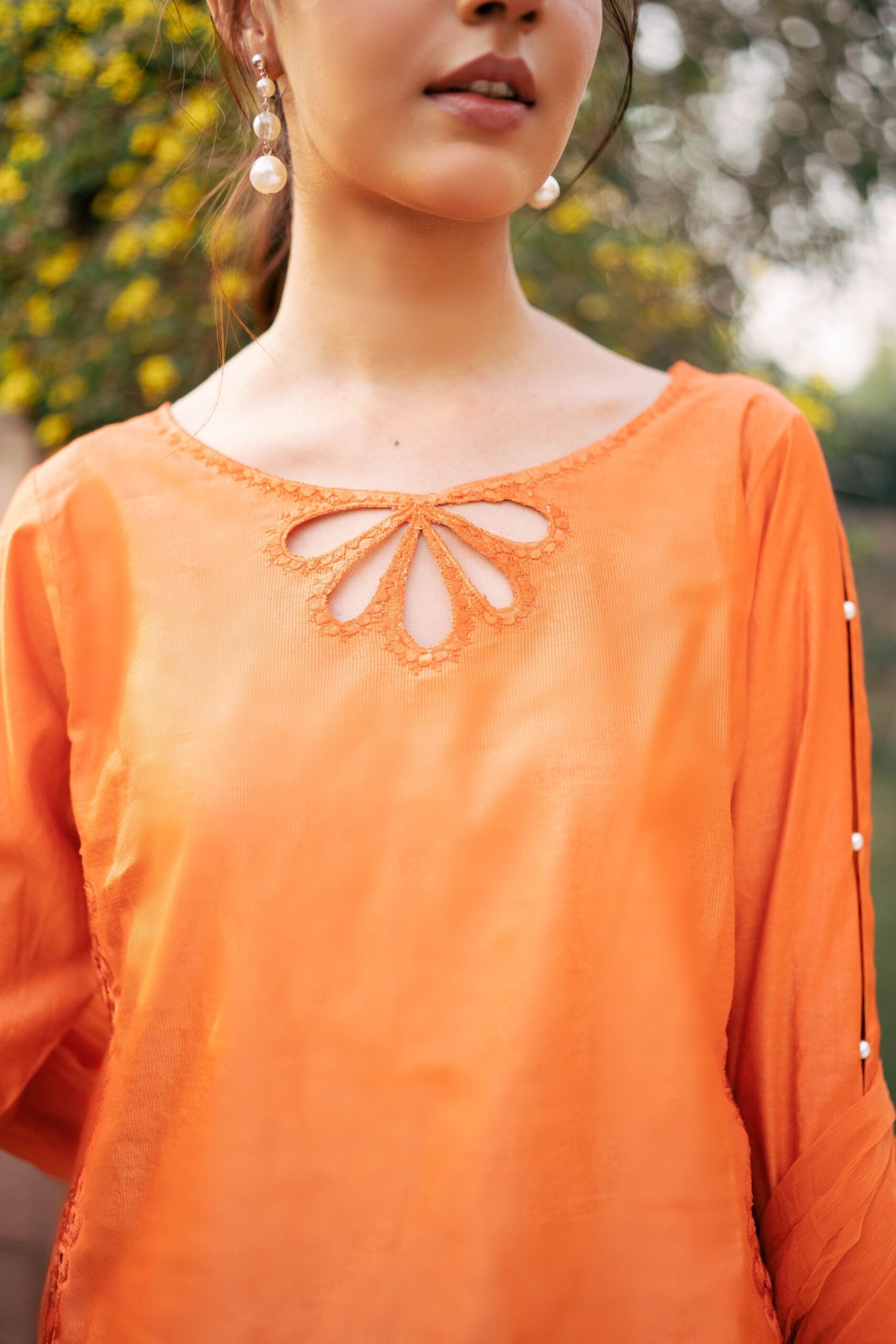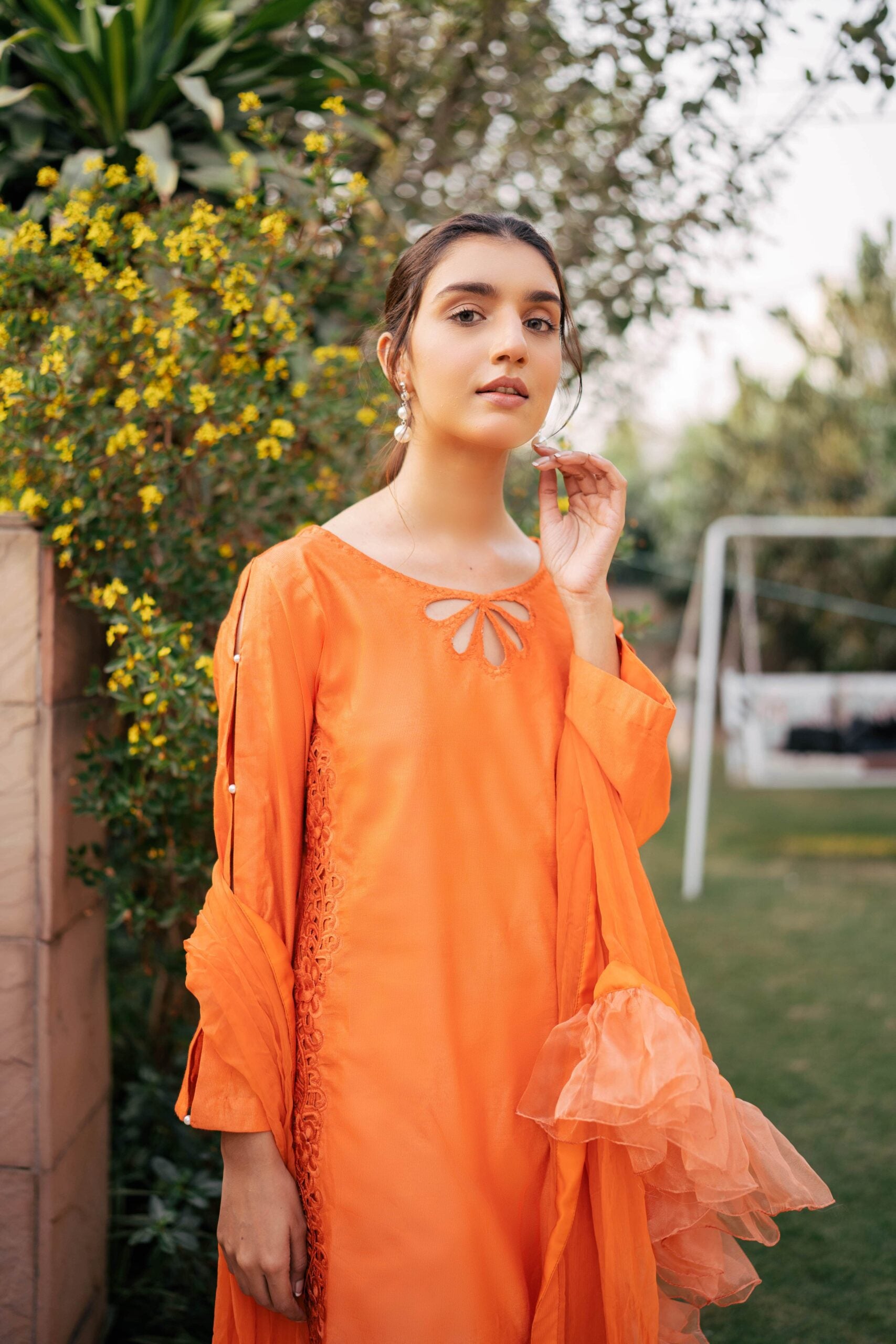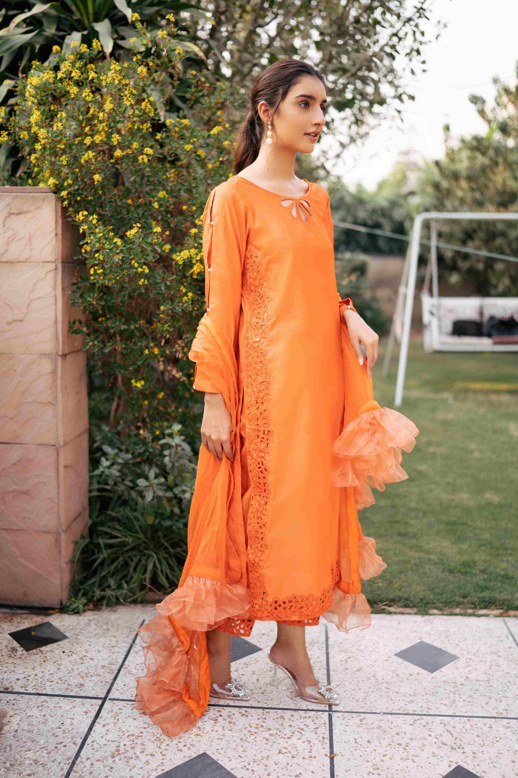 3 piece ensemble to make you look gorgeous. Detailed handcrafted cutwork and embroidered patterns with unique neckline are the main features of this article. Paired with cigarette pants and ruffle chiffon duppata to add oomph to the article