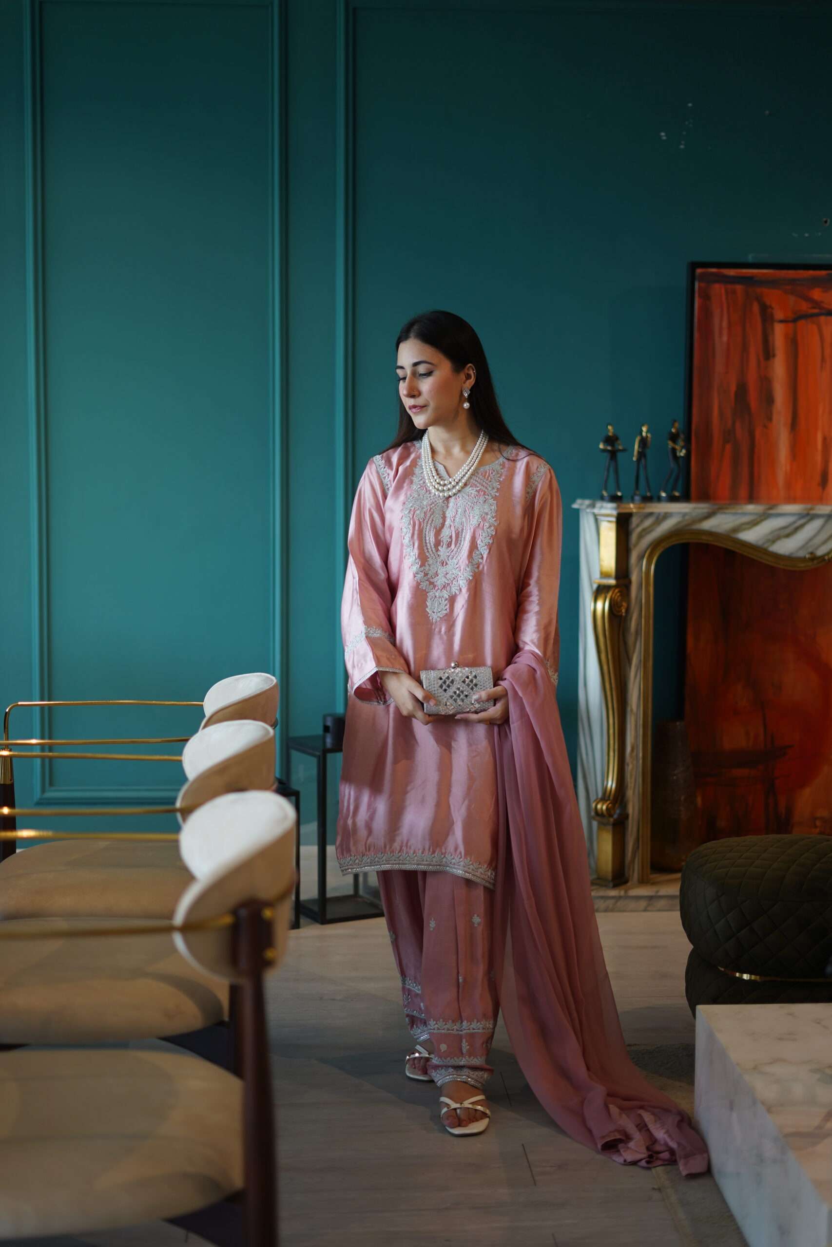 Using the perfect silk fabric, We have crafted 3 piece outfit to bring sophistication in your closet. Using traditional ari work this shalwar shirt and dupatta are a must have! Outfit: 3 Piece