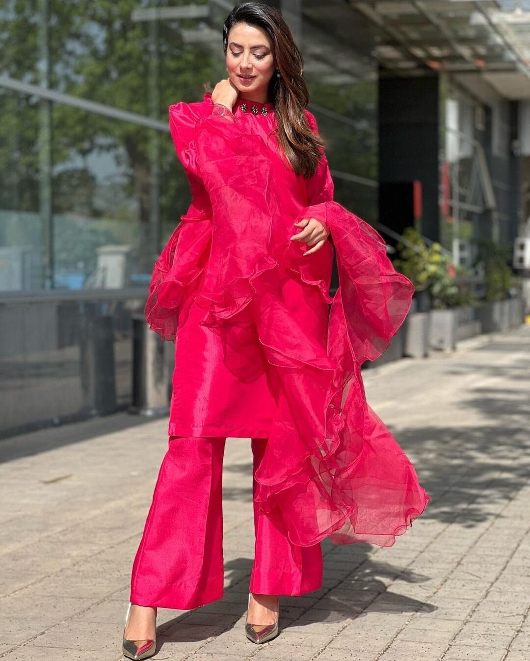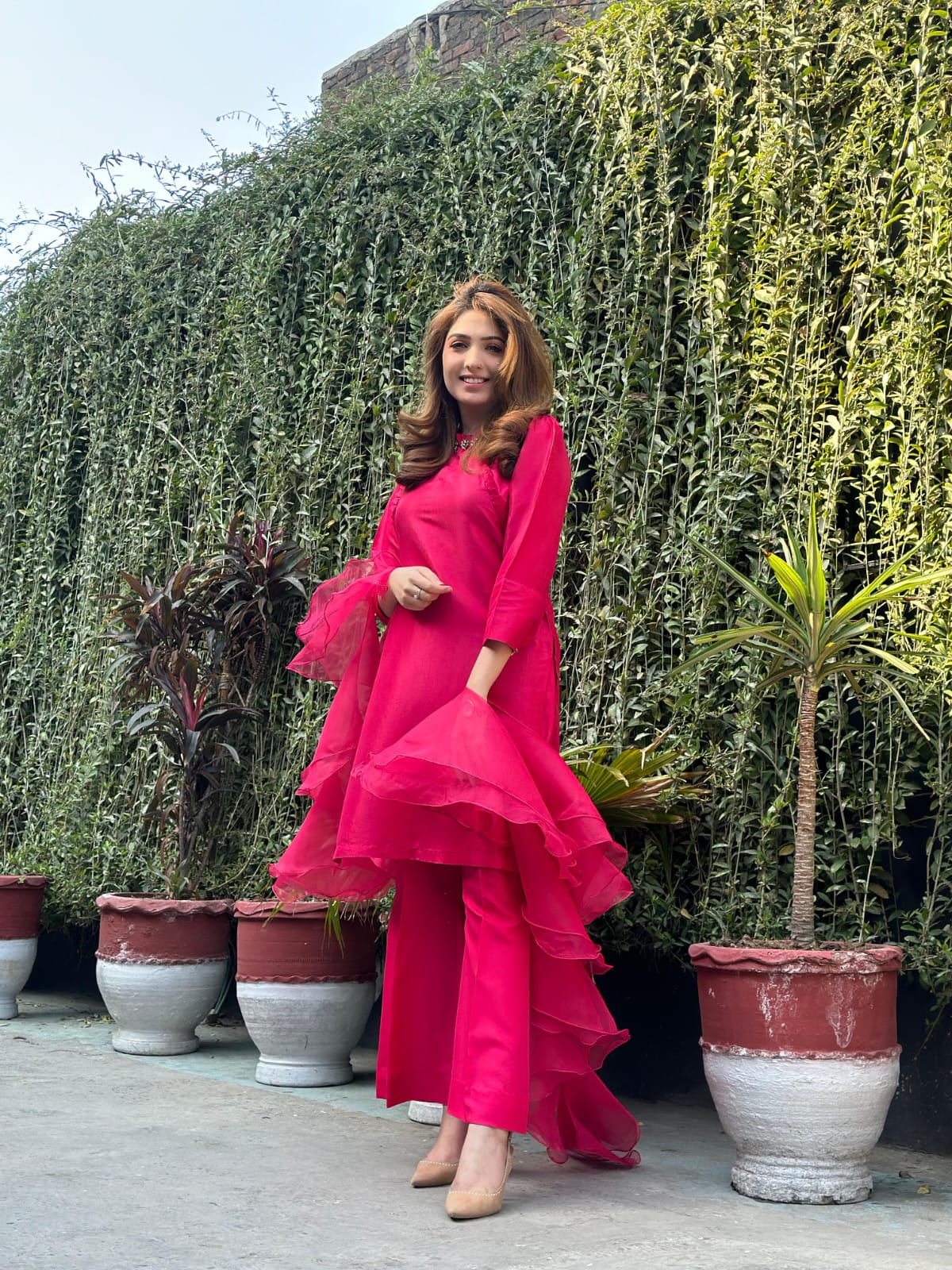 A trendy silhouette with Renaissance Styles puff sleeves, fine neckline and cuffs will surely make you stand out. Fabric used is silk . Shirt is paired with finely tailored tulip bootcut trousers.