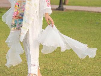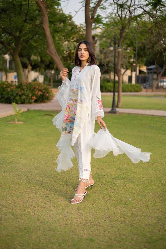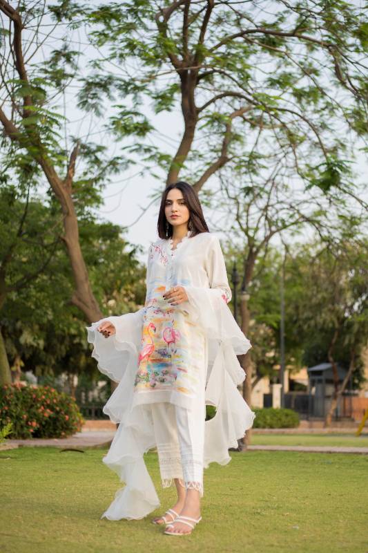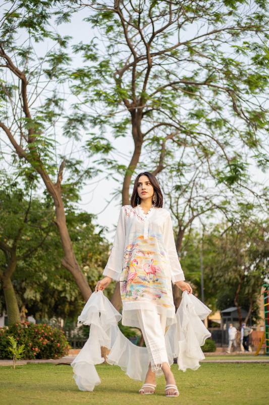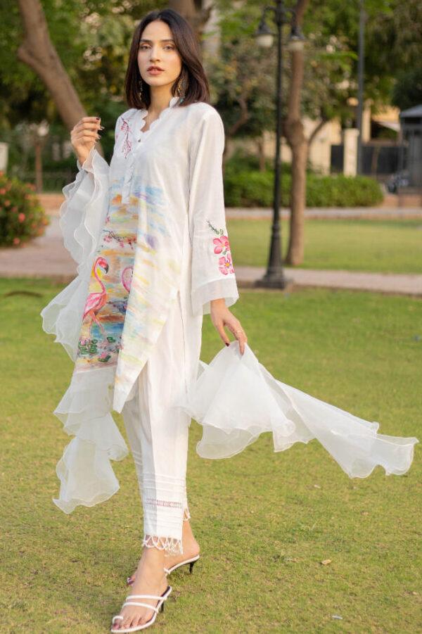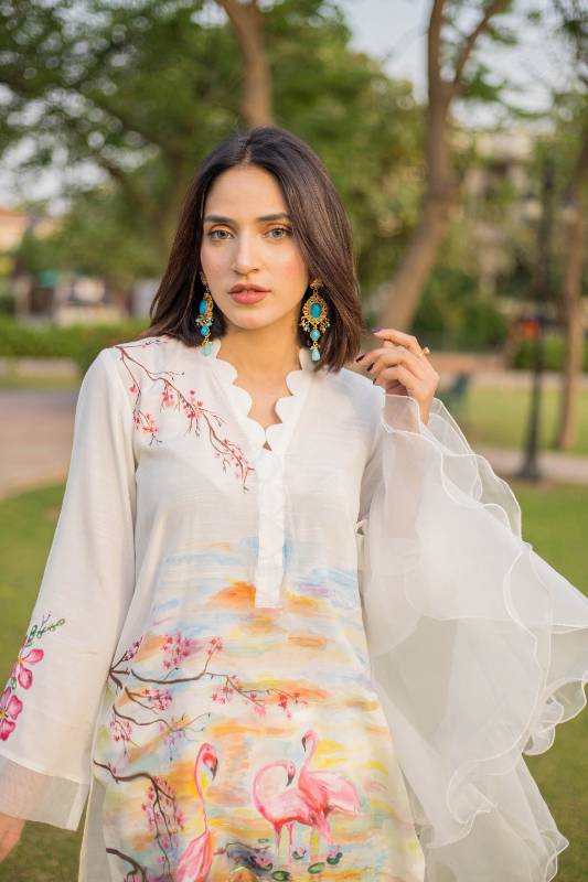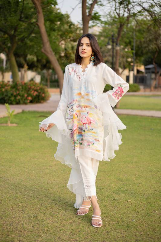 A delicately gorgeous raw silk shirt, scalloped neckline with organza finish. Beautifully hand painted flamingos at front. Paired with a fine raw silk trouser!