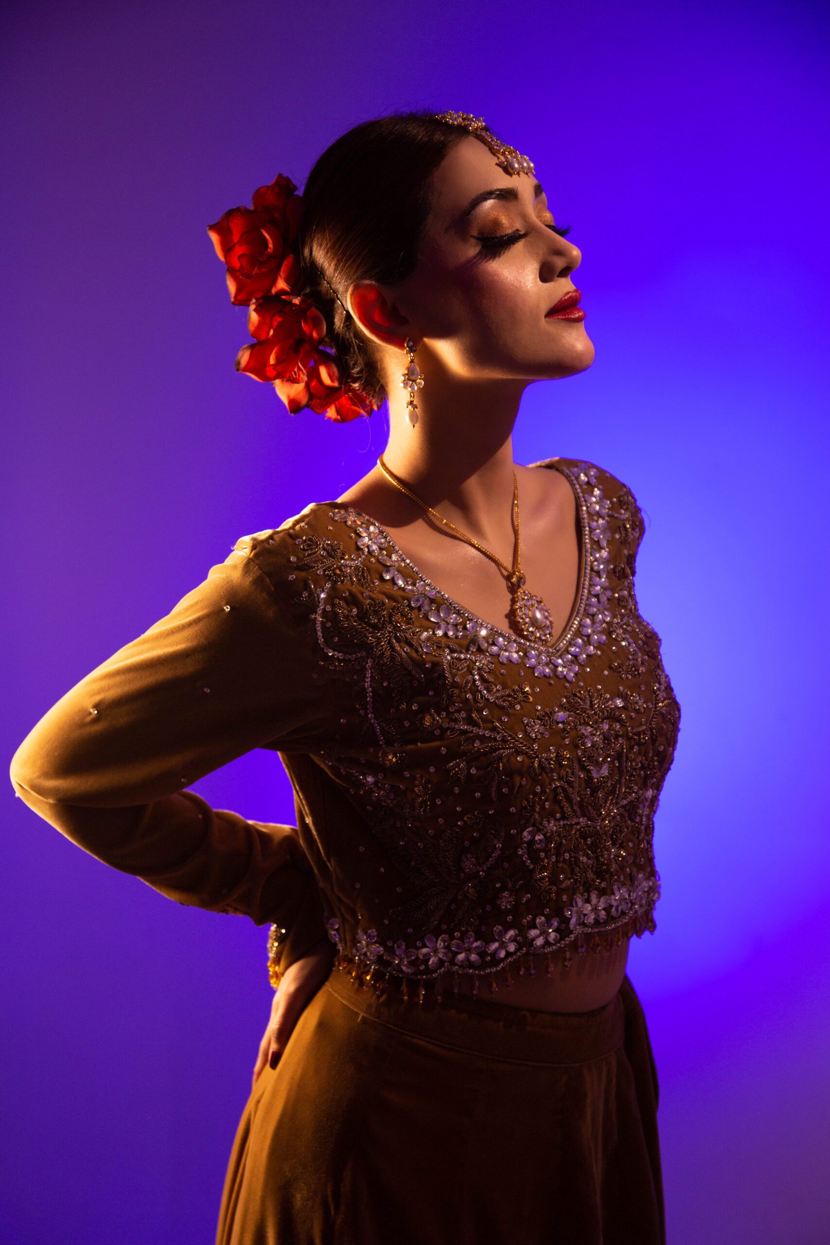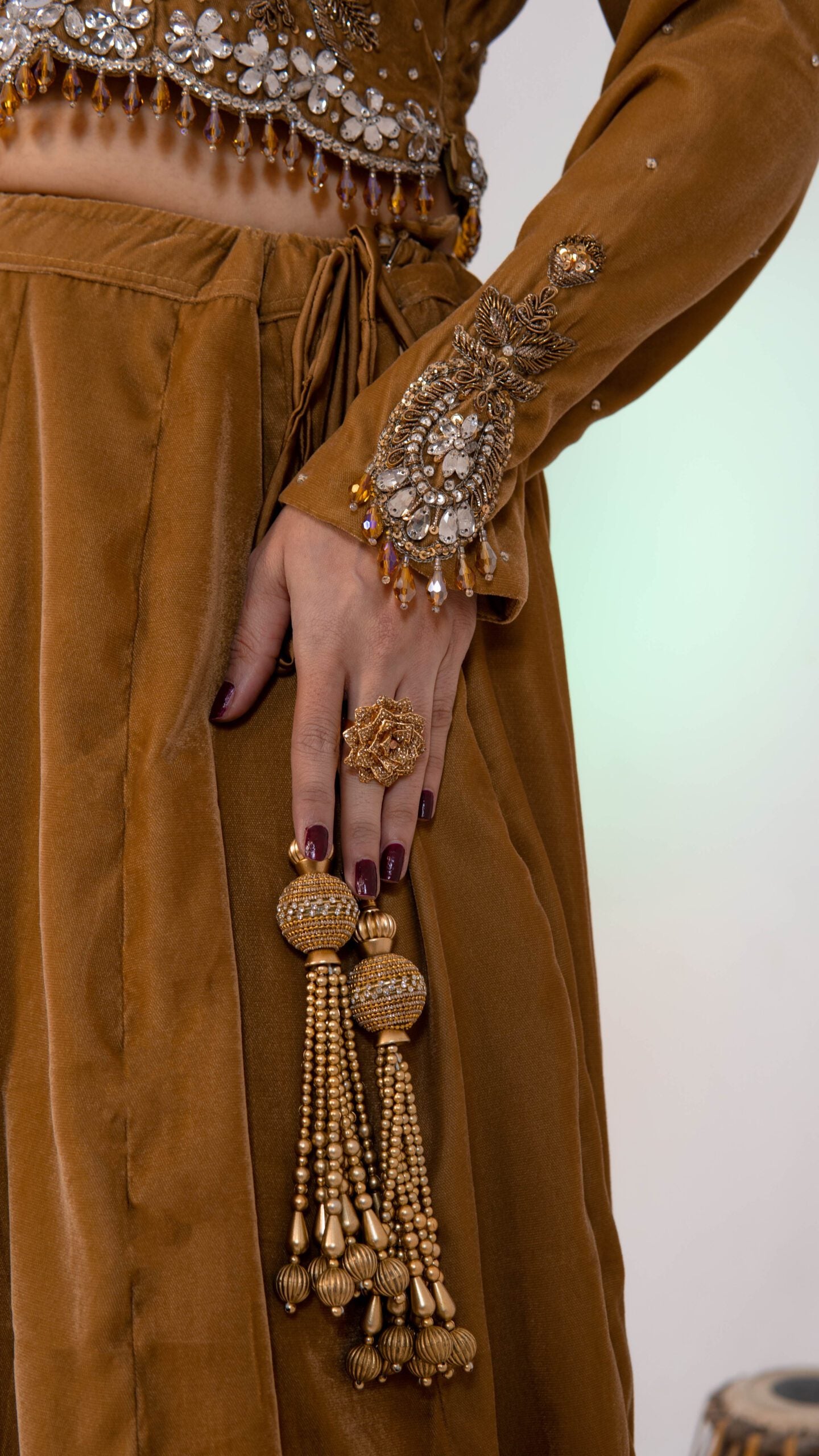 A velvet affair with this velvet lehnga and handworked choli is bound to turn heads. Intricate antique and crystal work is done on the choli front, back and sleeves. Comes with shimmer moonlight dupatta.