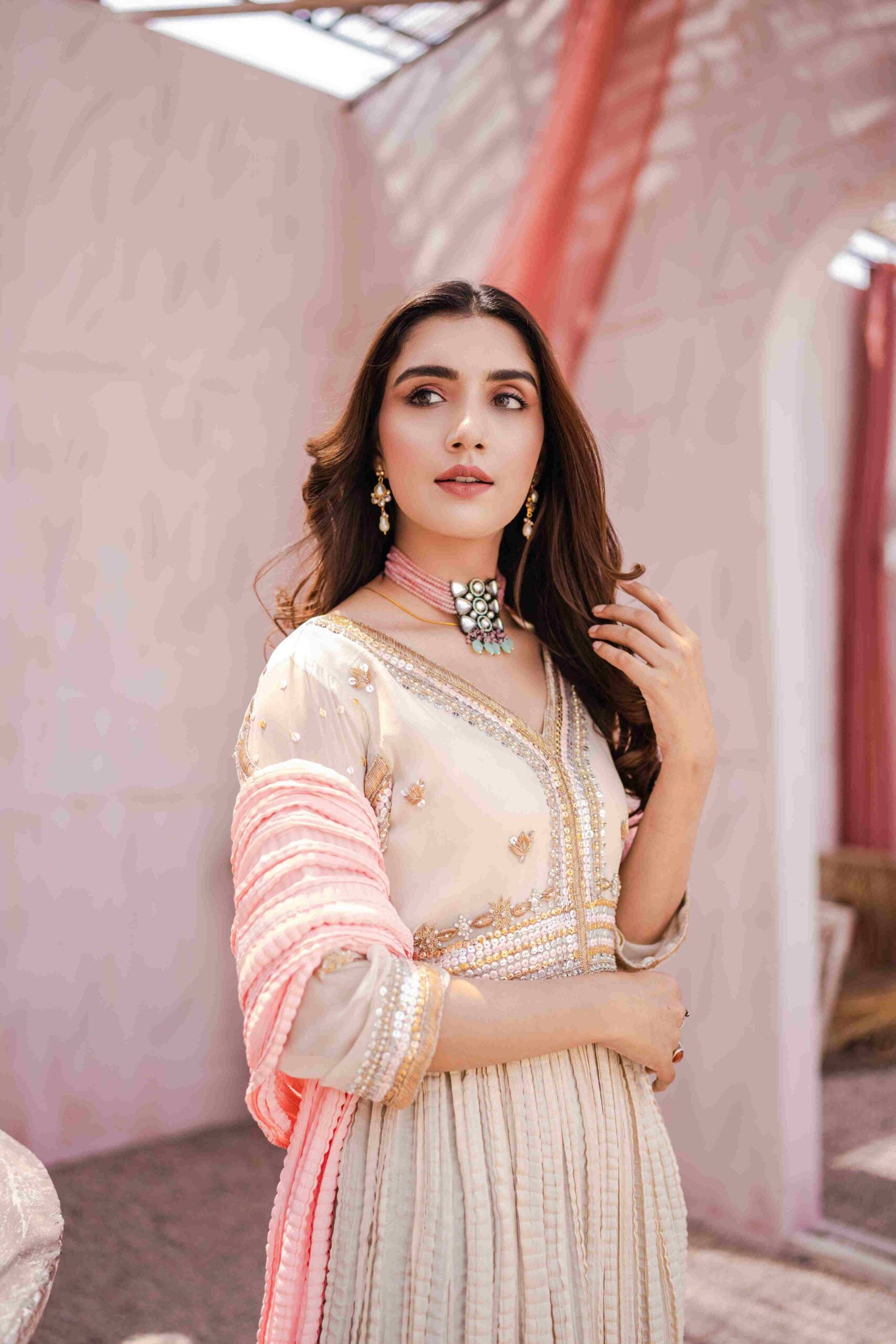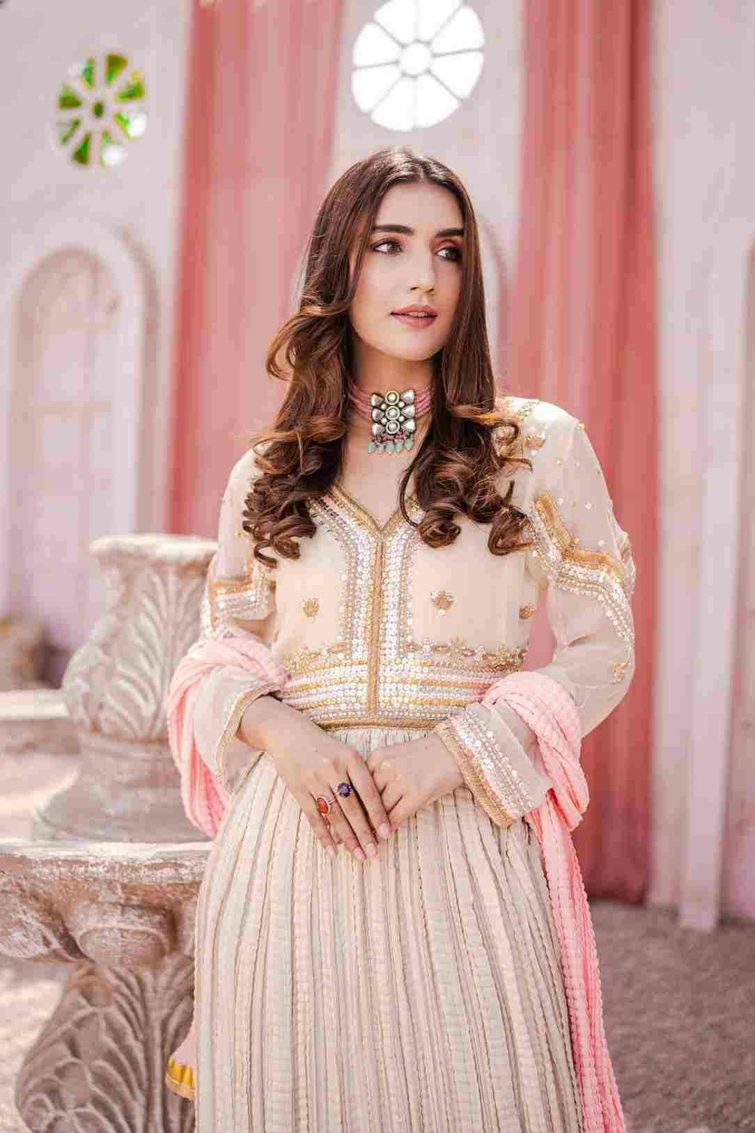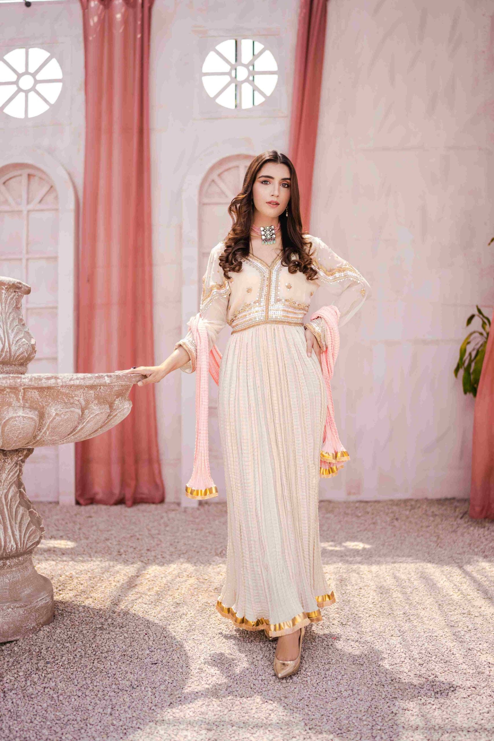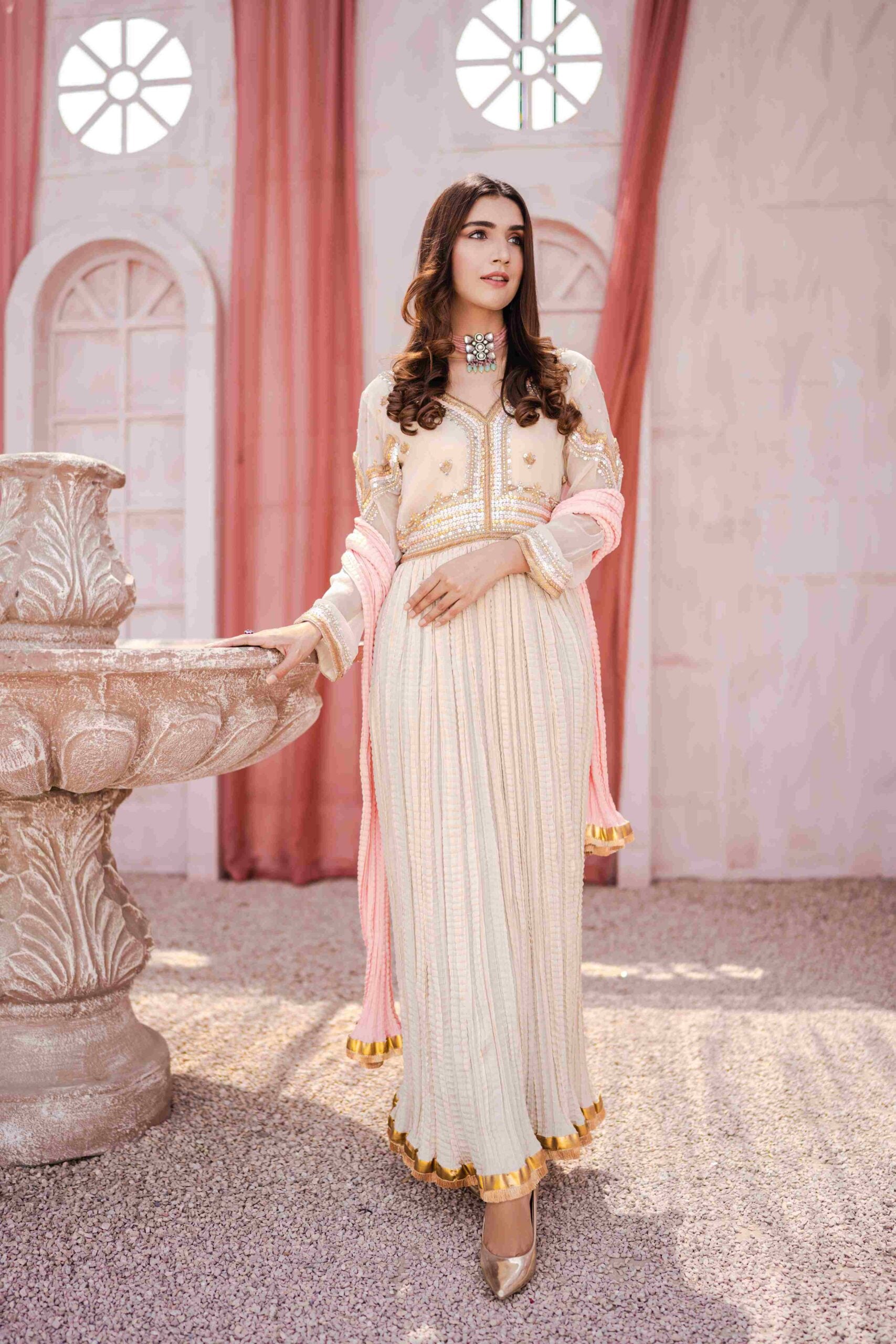 Elegant and gracefully designed 2 piece contemporary dress with a Mughal touch will make you look perfect. Panels of solid ivory hue stitched into a long flared peshwas. The chiffon bodice and sleeves are hand embellished with the best material and delicate motifs with embroidered geometric details. An added handworked belt detail adds to this gorgeous ensemble. A crushed pink dupatta with traditional details is paired with the piece. 2 PCS \n(Peshwas and Dupatta) |