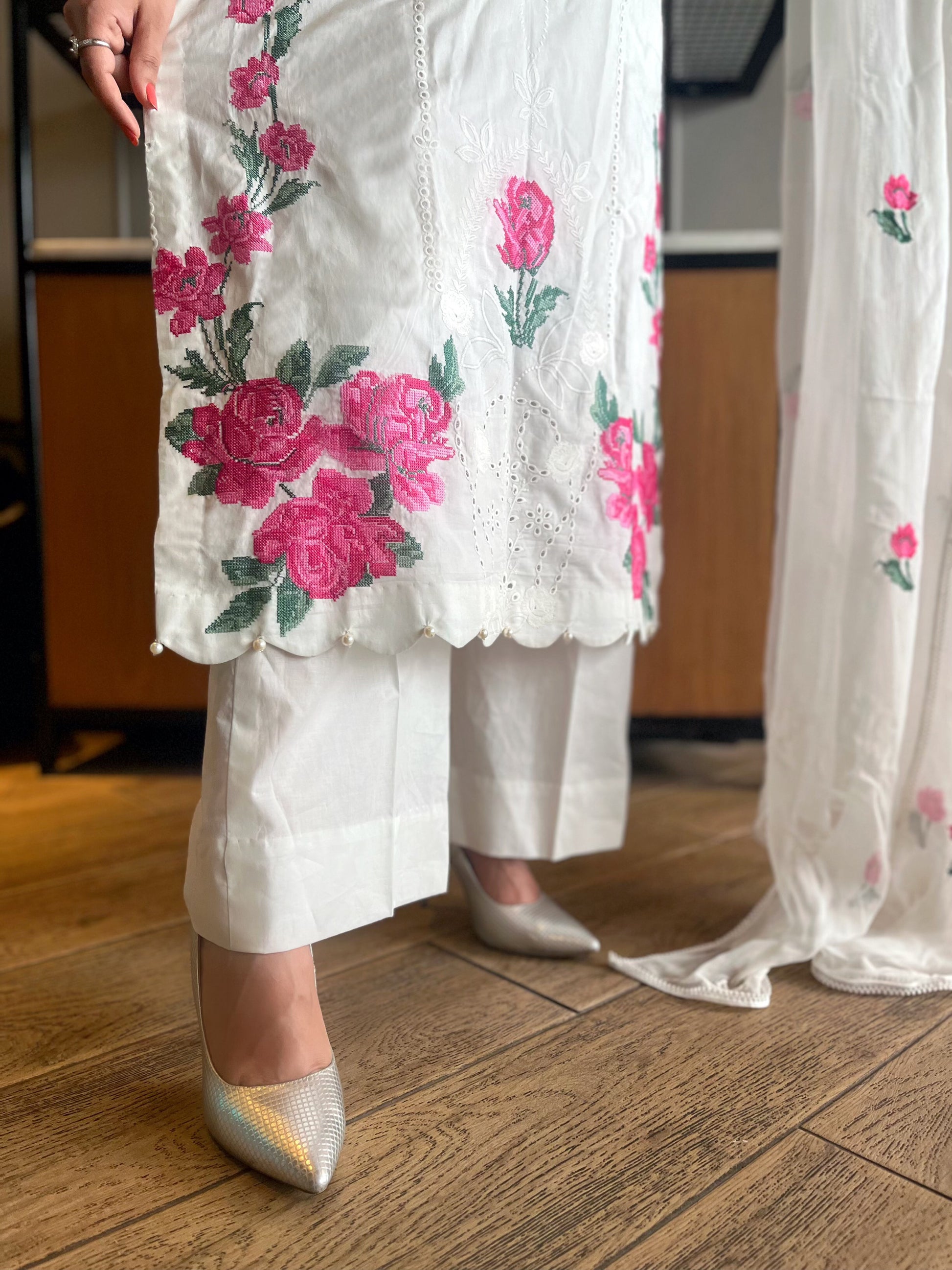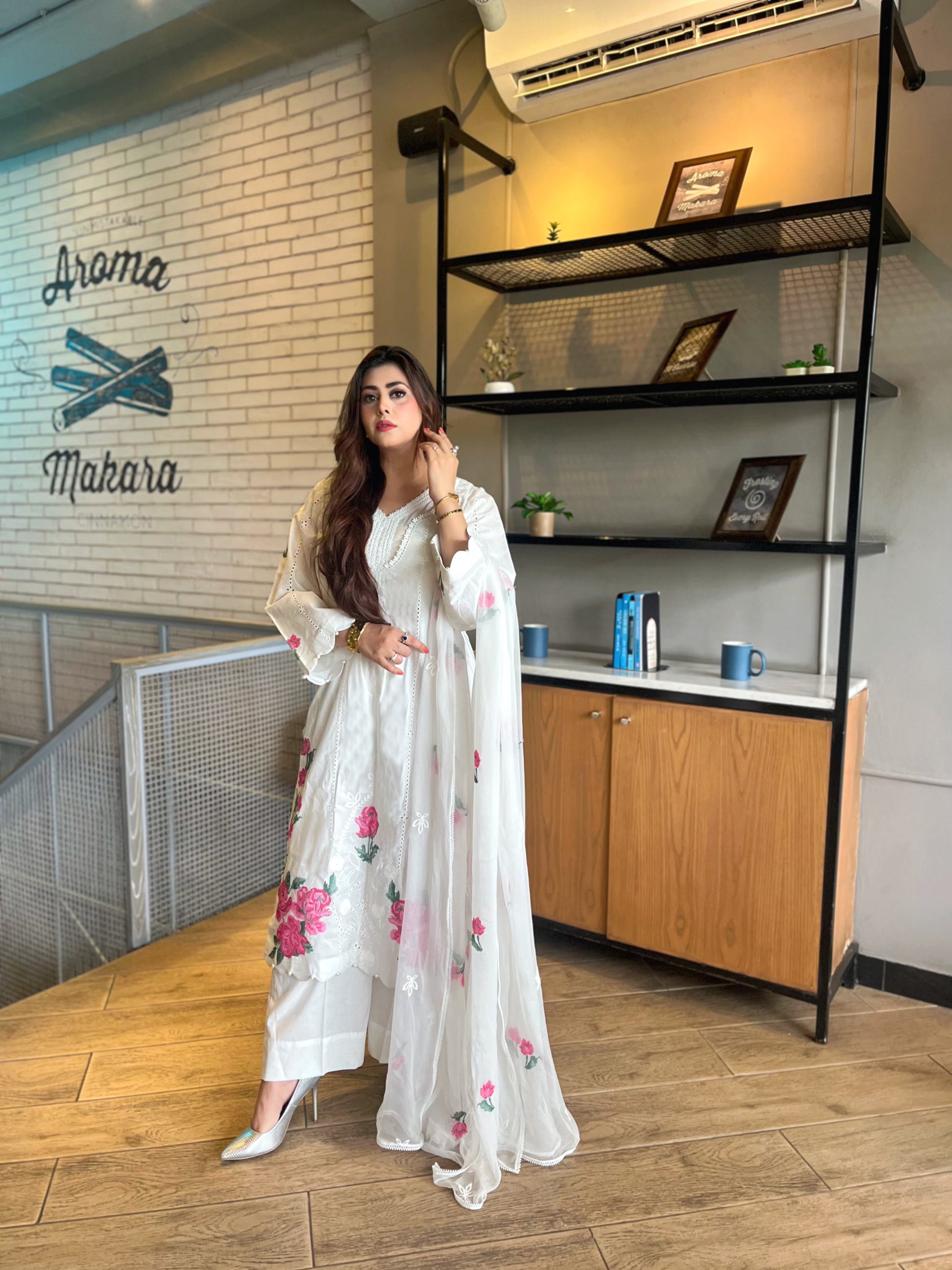 A fully embroidered chiffon dupatta flows effortlessly, lending an airy charm, perfect for summer sophistication. The trousers come unstitched, allowing you the freedom to style them your way — whether plazo, bell-bottom, wide-leg, or cigarette pants. In the stitched version, you’ll find it tailored with classic wide-leg trousers for a refined yet easygoing appeal.