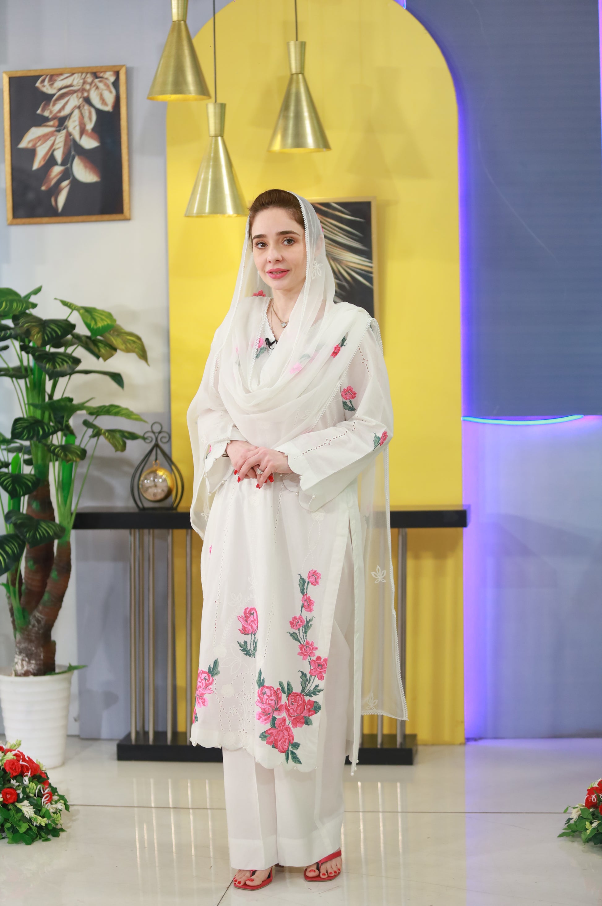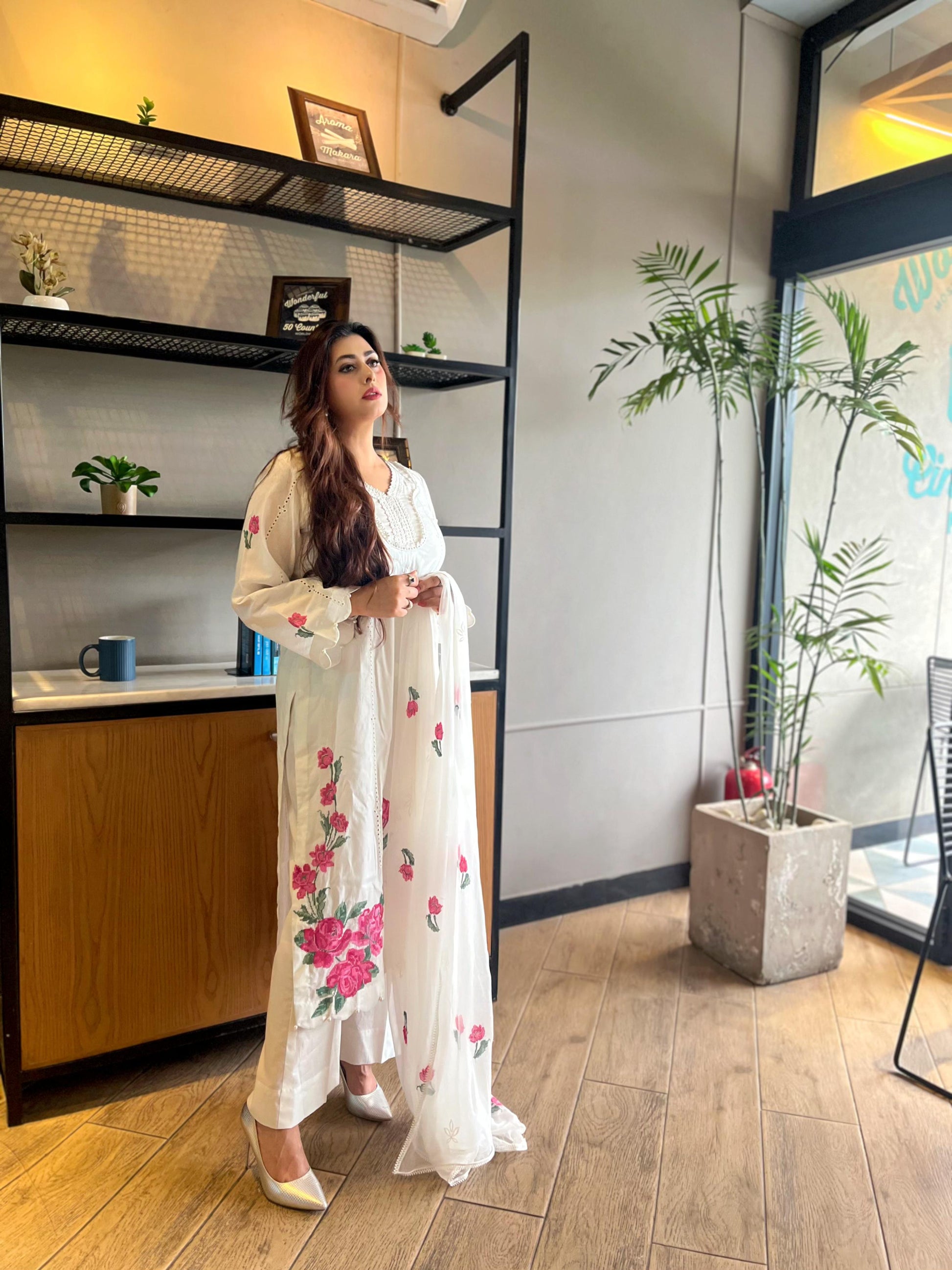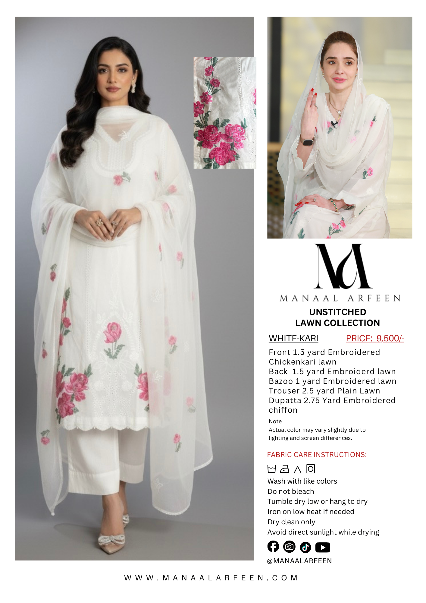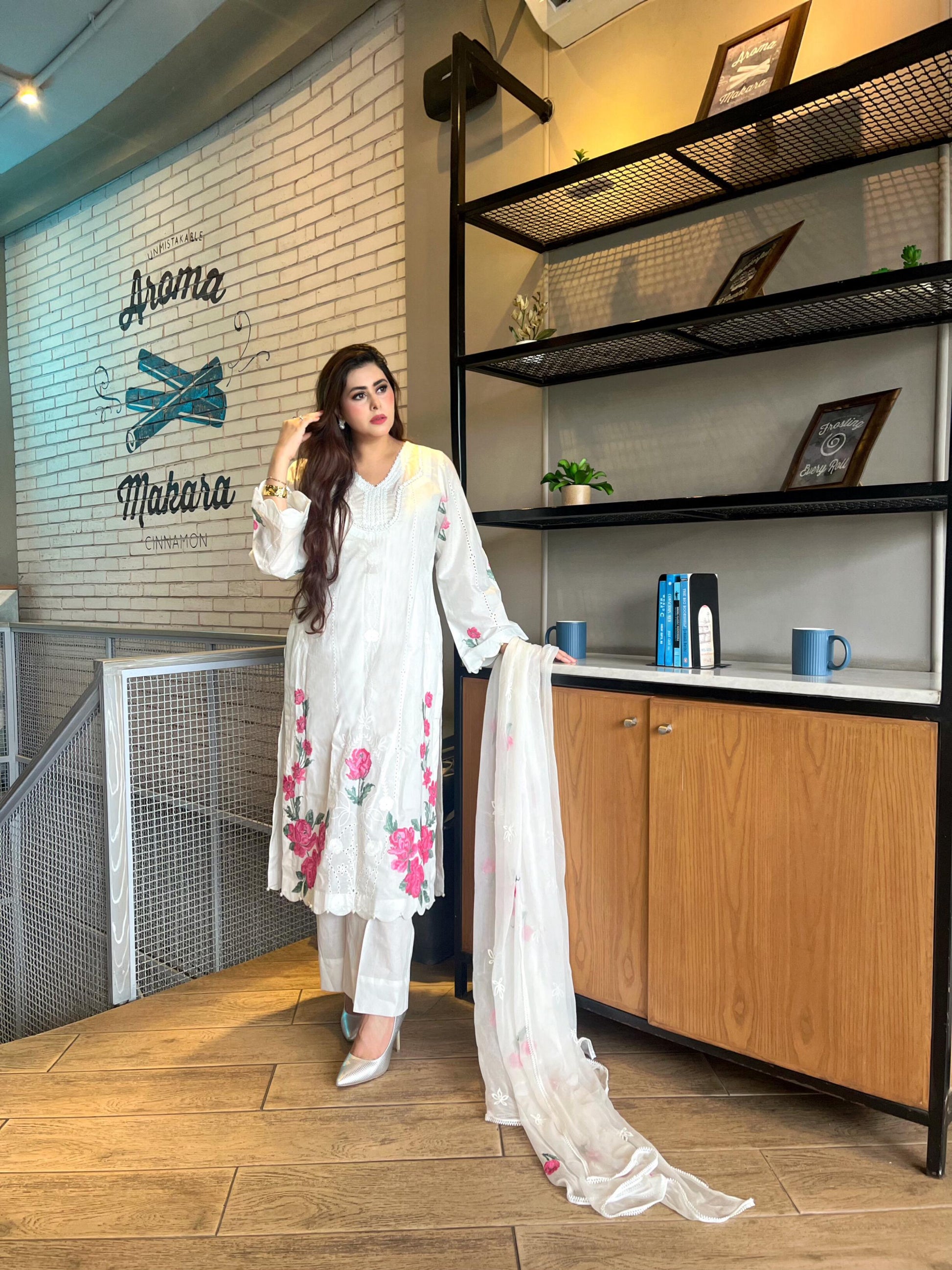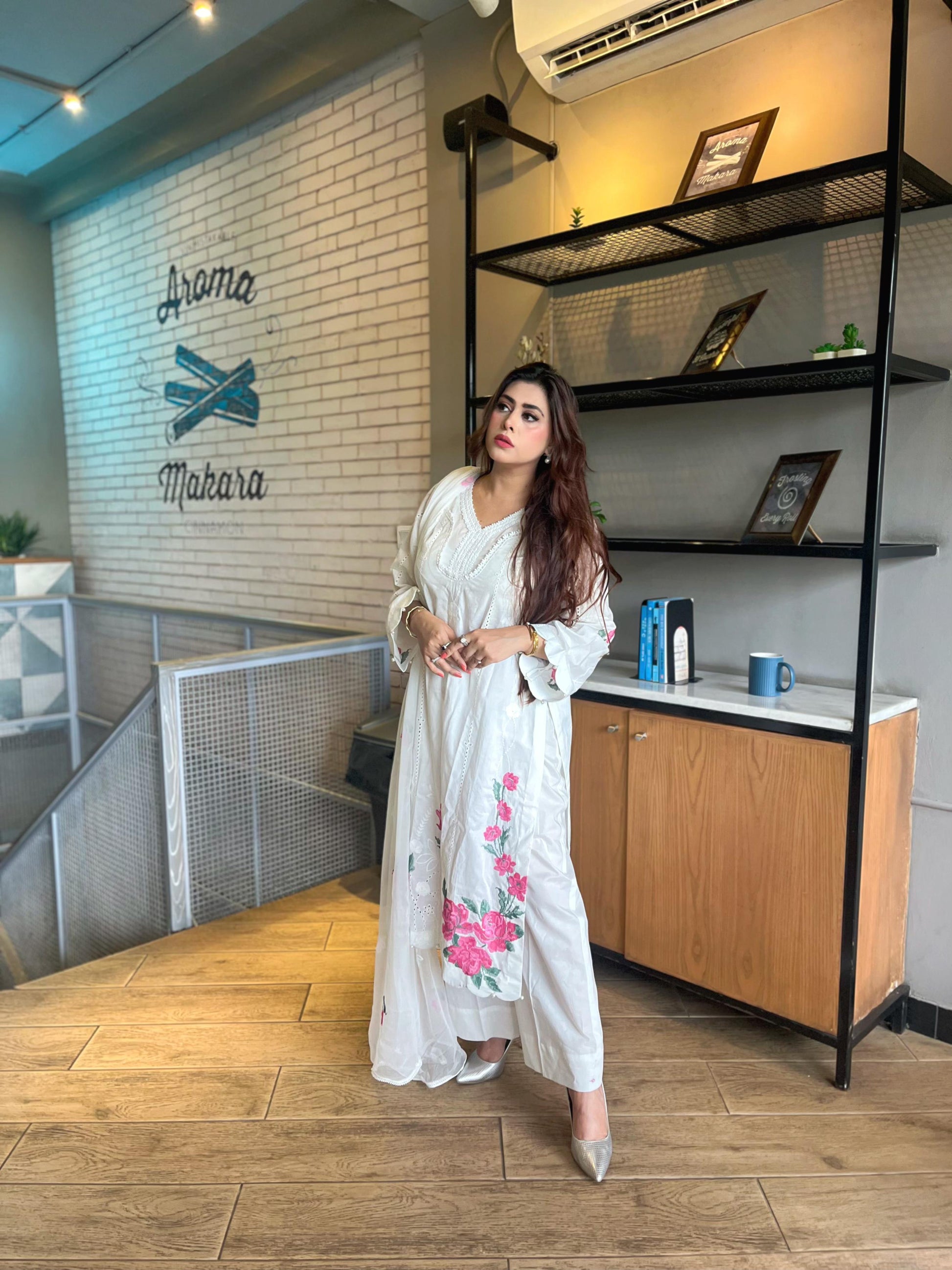 Crafted on premium lawn, this ensemble features a long silhouette shirt with double panels on both front and back, delicately adorned with lace inserts and embellishment on daman and sleeves. Intricate chicken kari embroidery graces the front, back, and sleeves, adding texture and elegance to every inch.