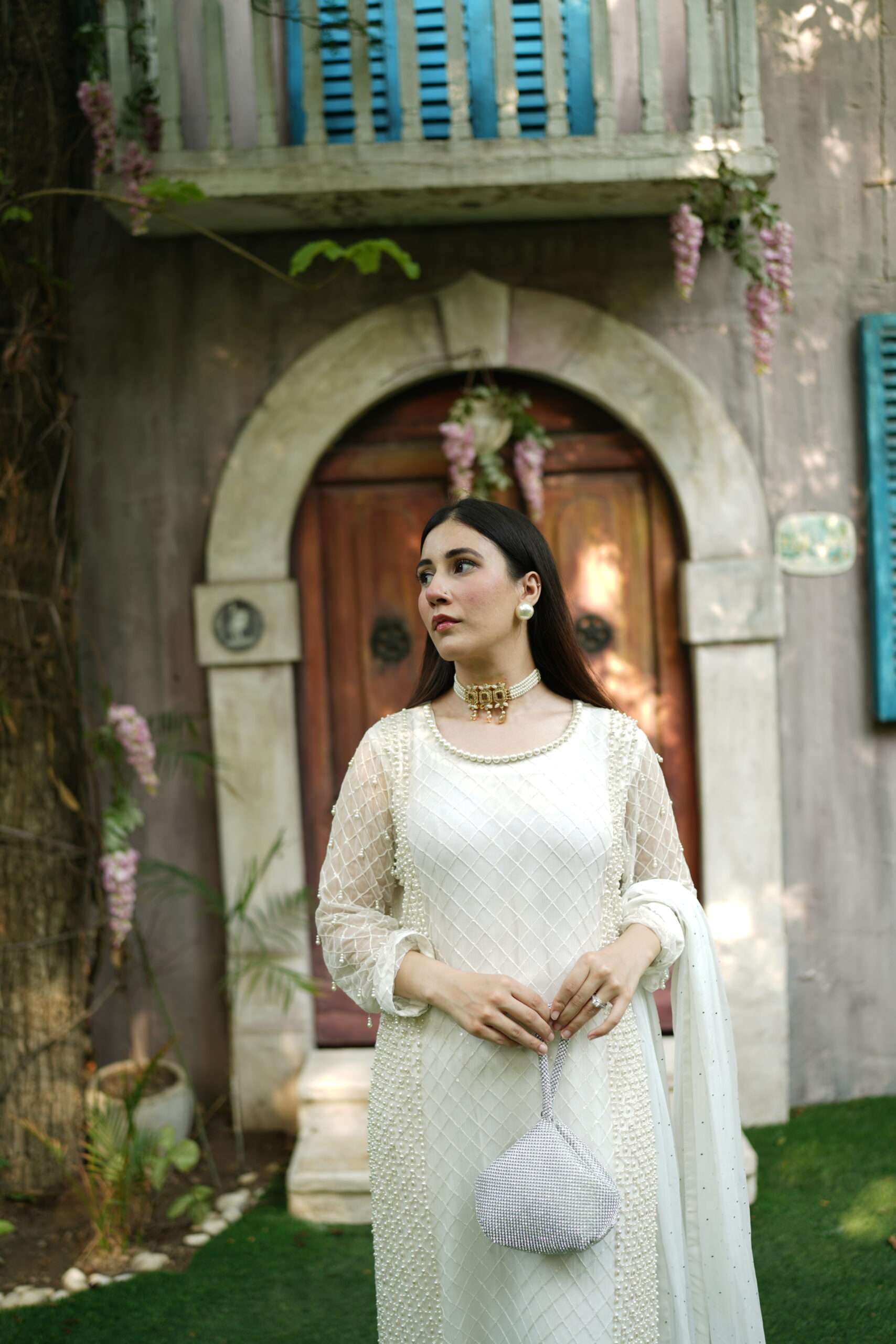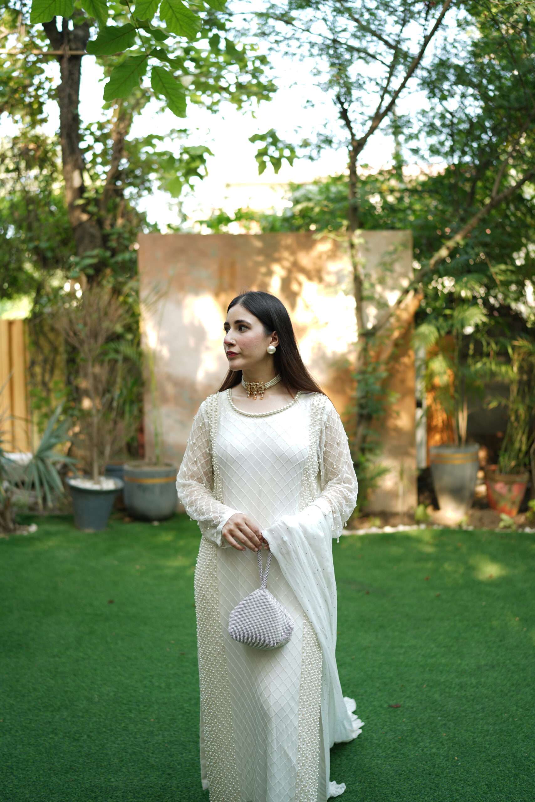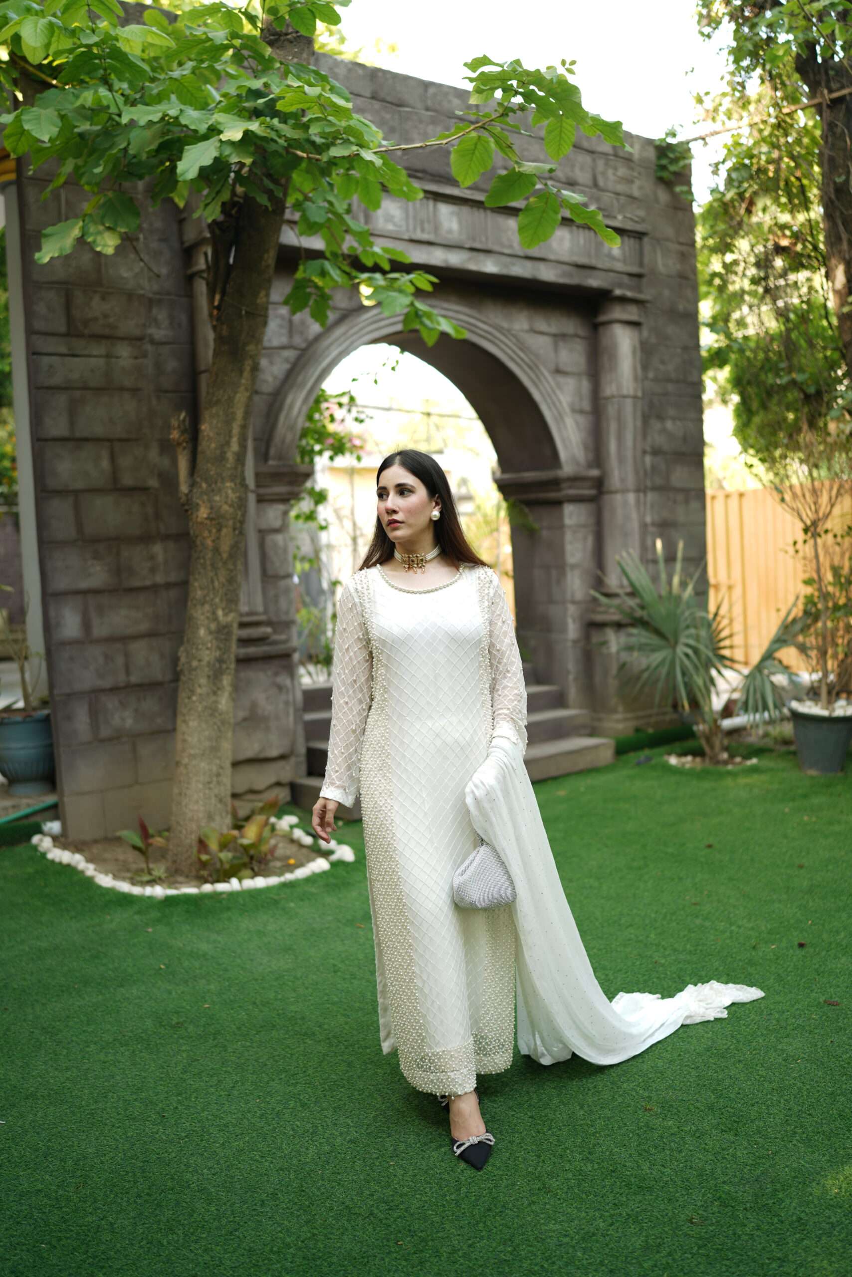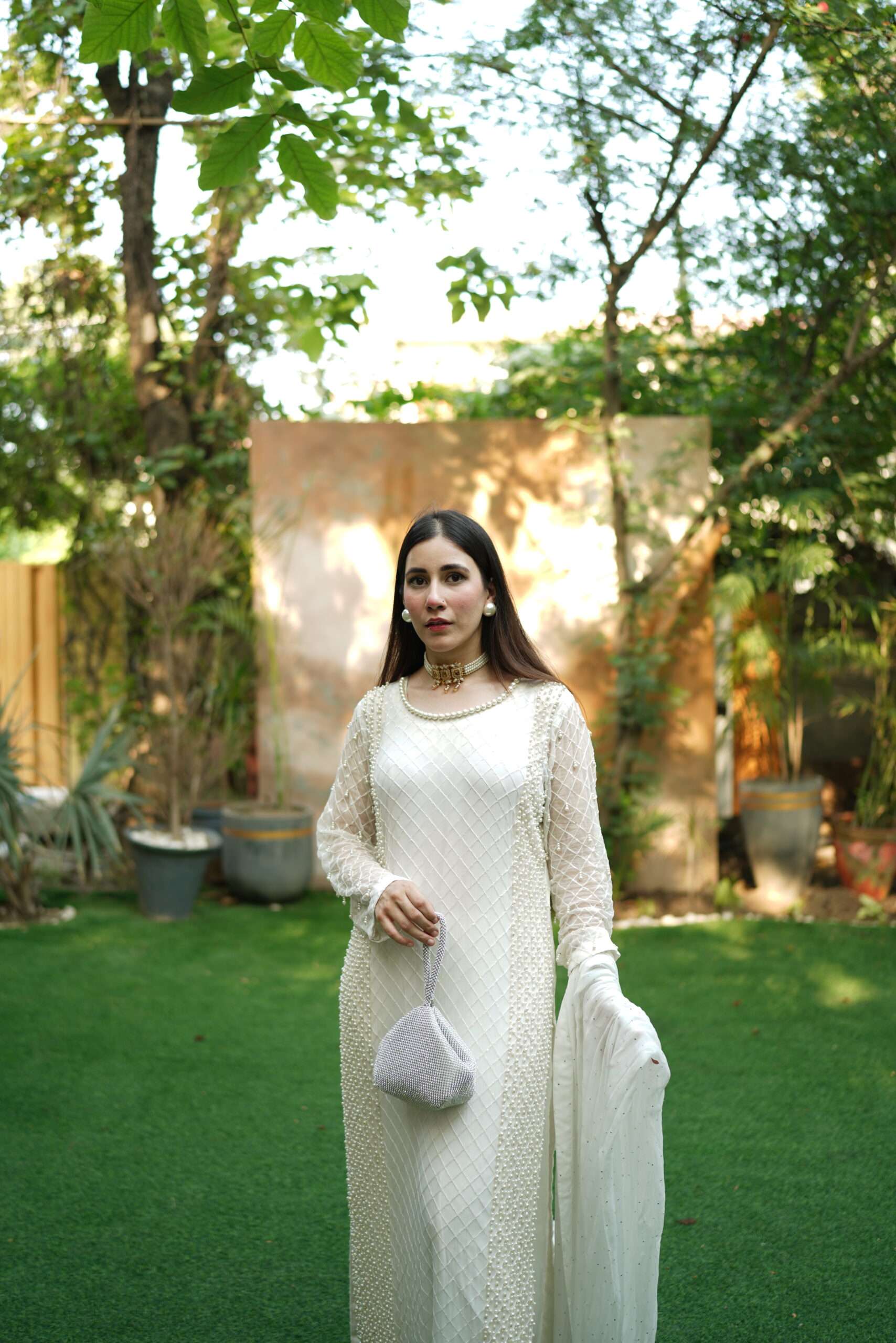 A glimmering article with handwork using the best pearls. This sparkling yet sophisticated article will make you stand out from the rest in any occasion. Comes with chiffon dupatta having pretty frill details on borders. Straight trouser with crisscross fabric gives the article delicate details to complete the look. Outfit: 3 Piece
