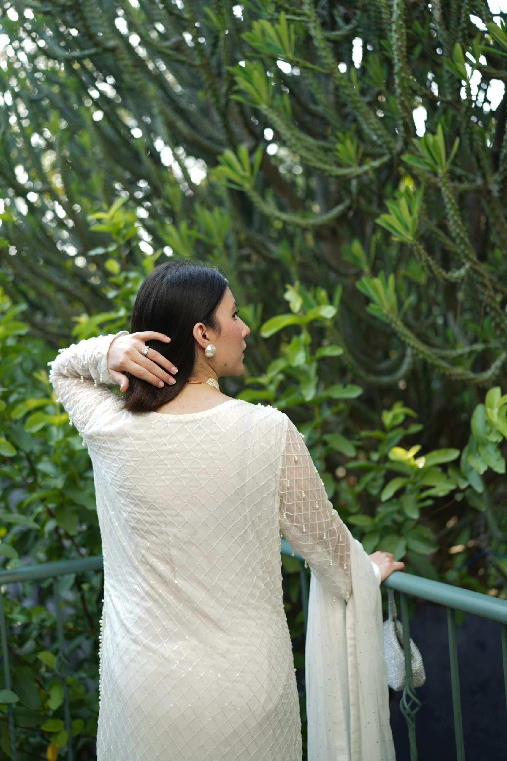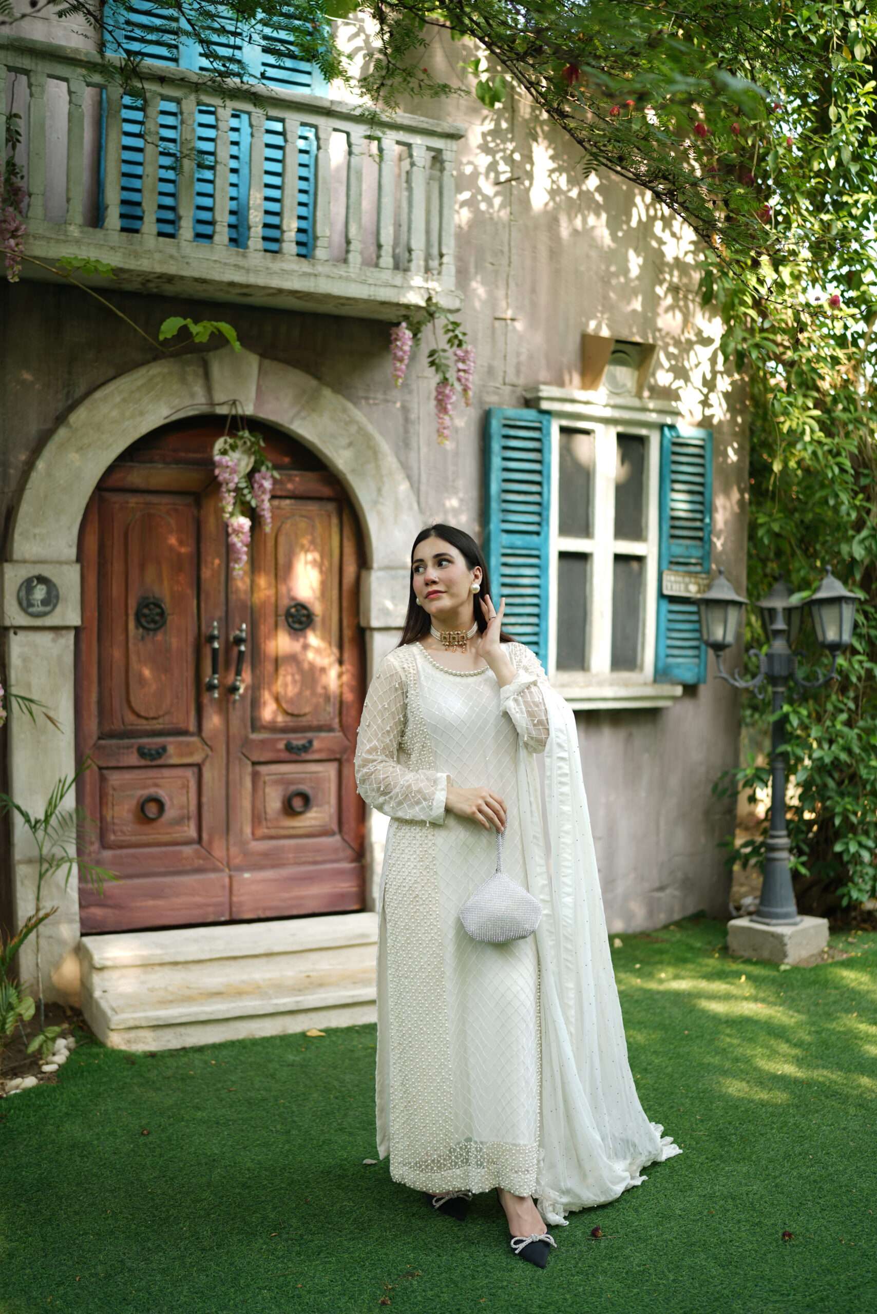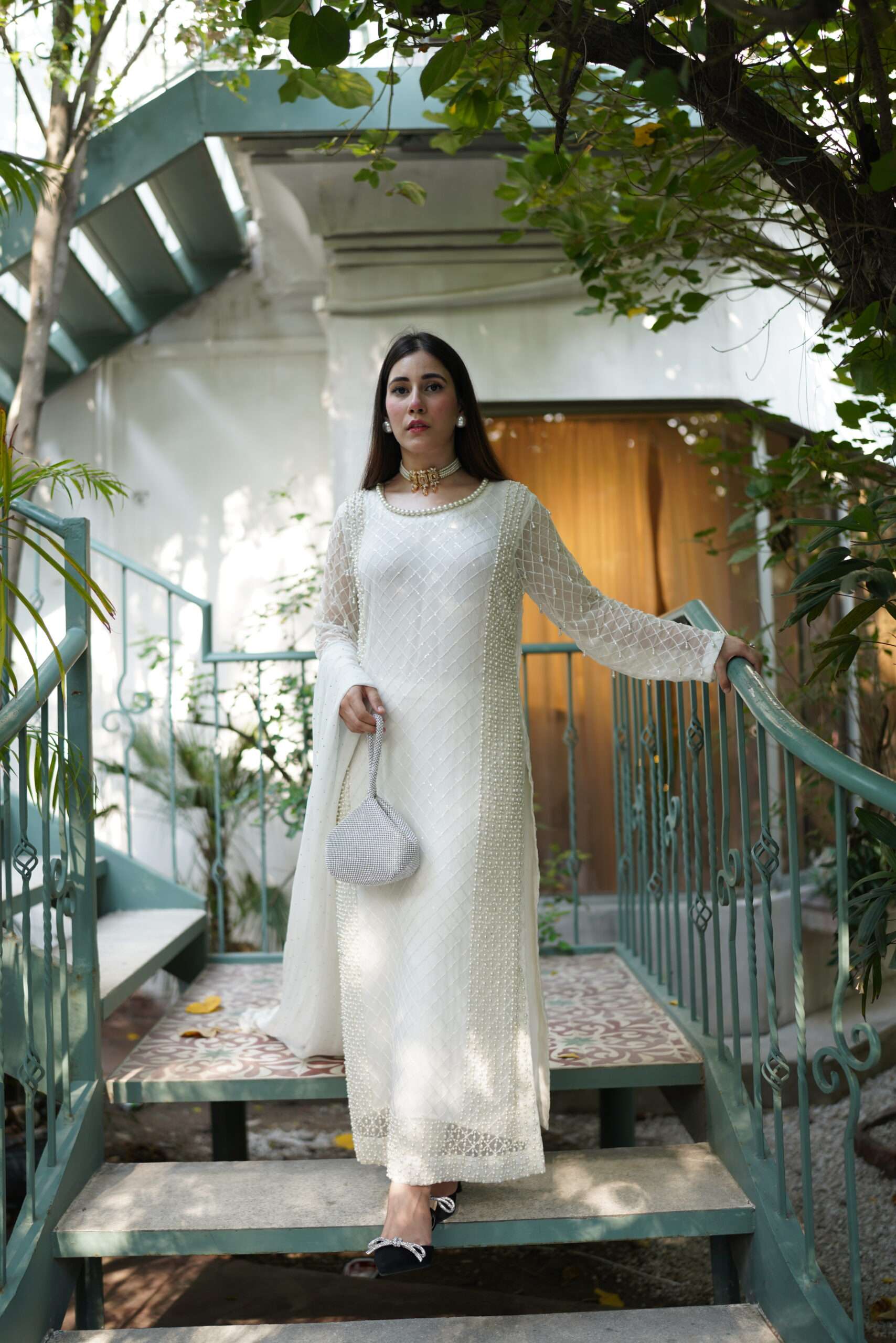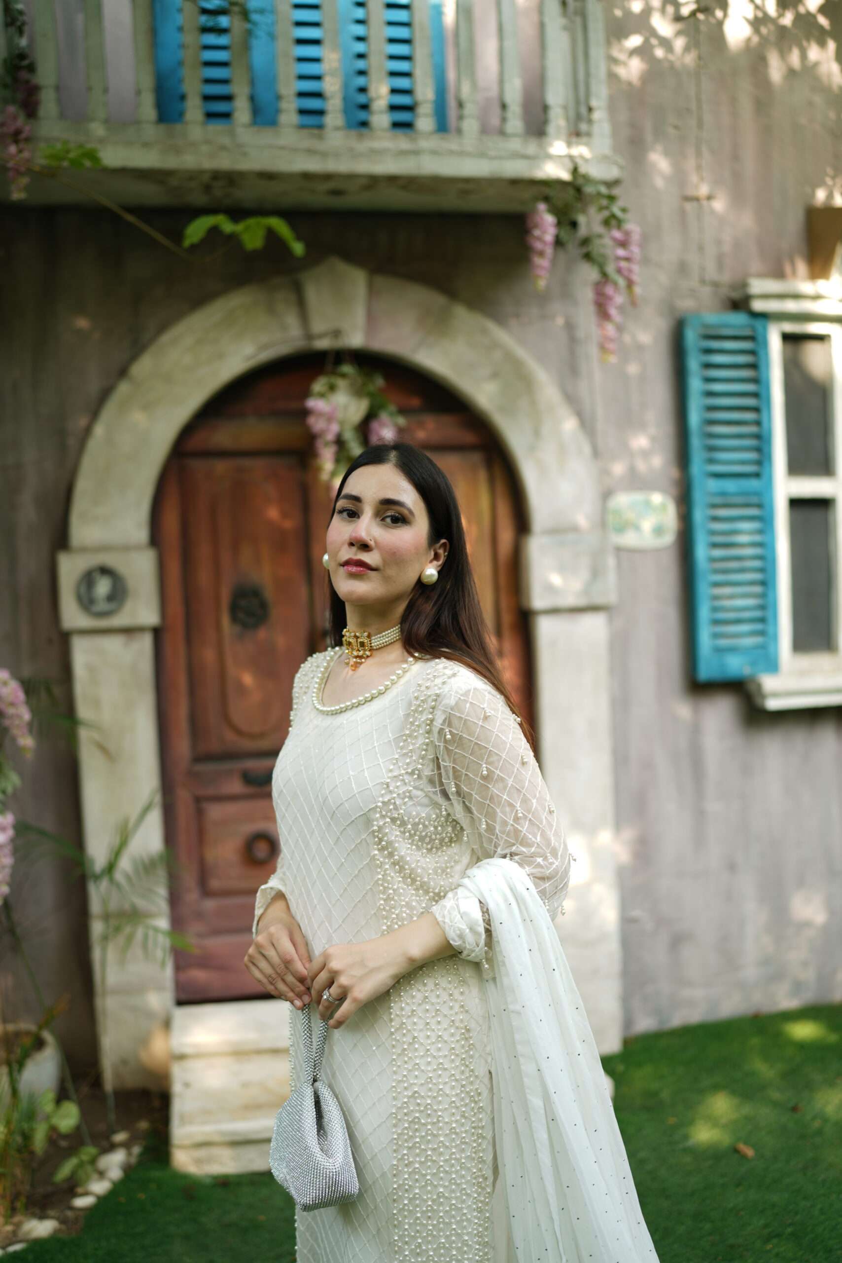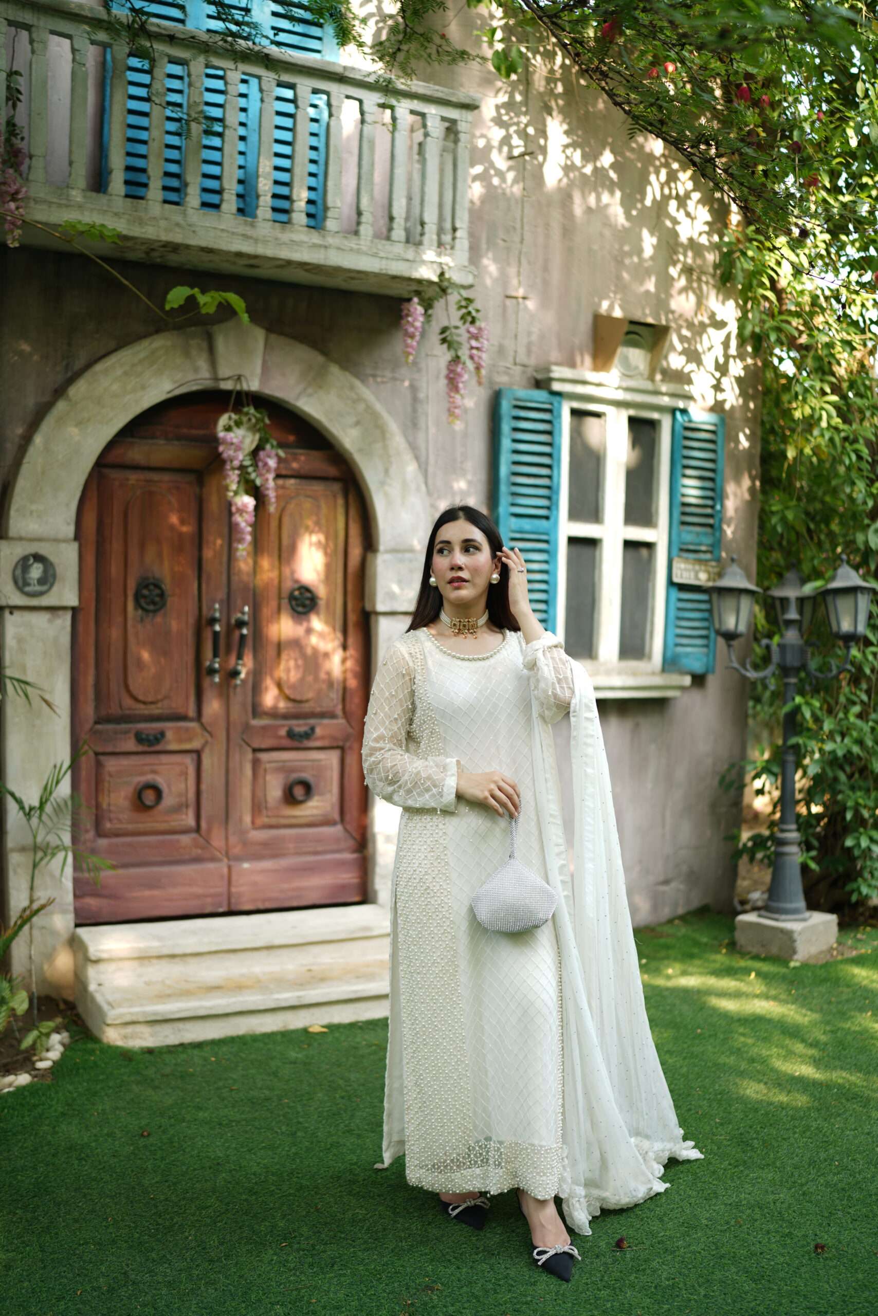 A glimmering article with handwork using the best pearls. This sparkling yet sophisticated article will make you stand out from the rest in any occasion. Comes with chiffon dupatta having pretty frill details on borders. Straight trouser with crisscross fabric gives the article delicate details to complete the look. Outfit: 3 Piece