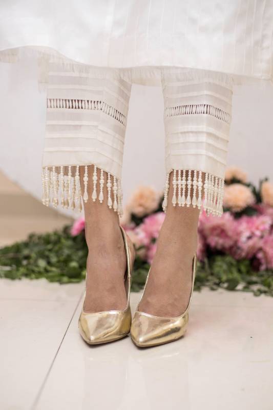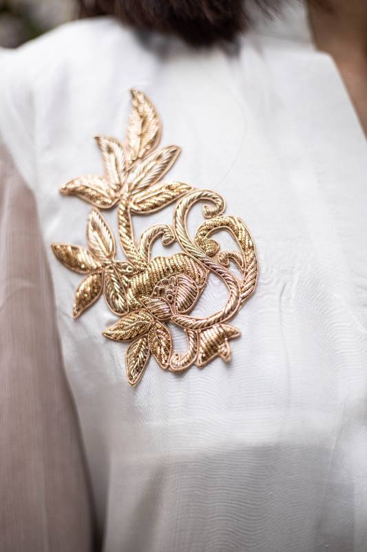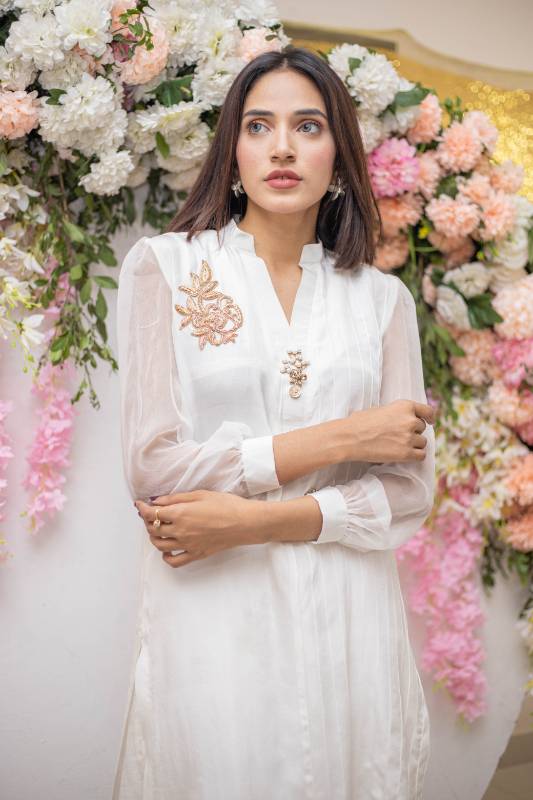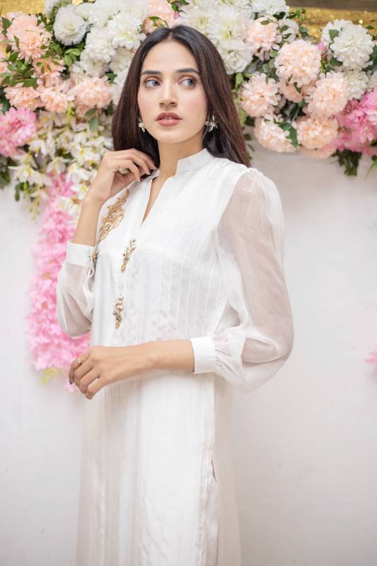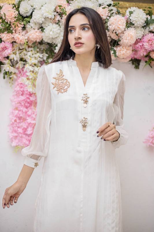 Gorgeously pleated dress with frayed edges and delicate handwork embroidery along with fine embellishments. This beautiful shirt comes with renaissance style puffy sleeves. The front and back of the dress are designed to perfection.